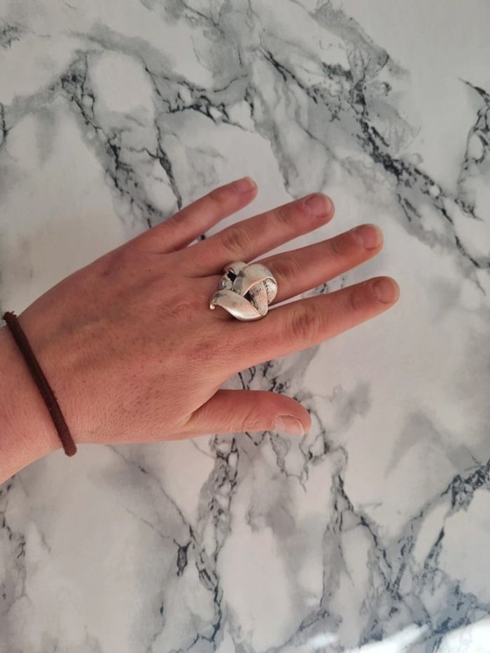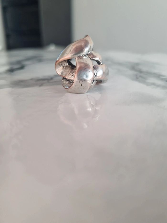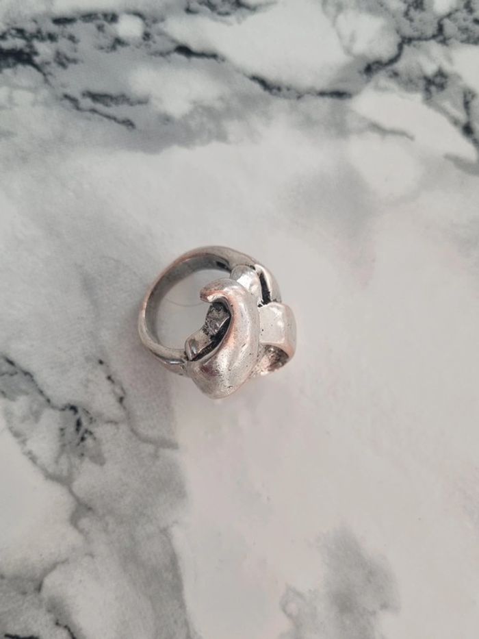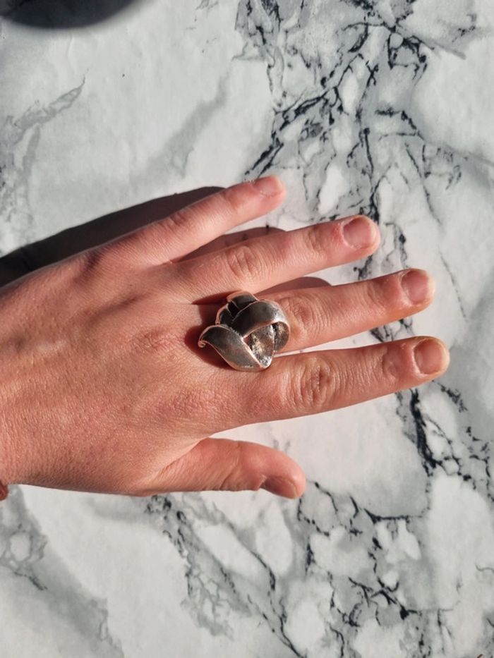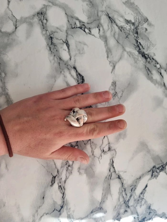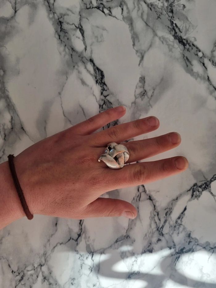 Magnifique bague argenté vintage Elle est en forme de noeuf Année '80 Elle est métal argenté En bon état Dimensions : - Largeur du noeud : 3 cm - Longueur du noeud : 3 cm - Circonférence : 1,9 cm