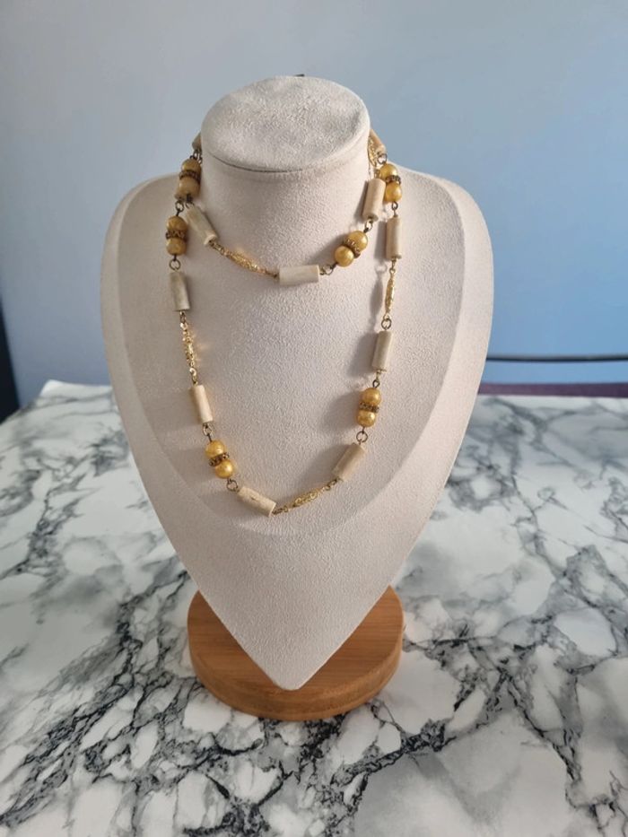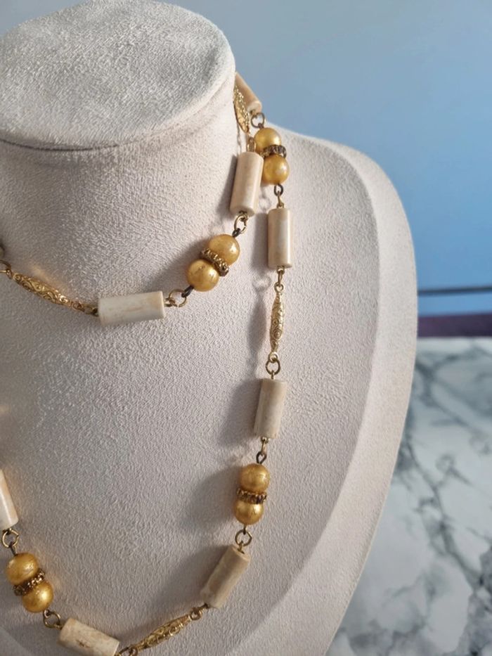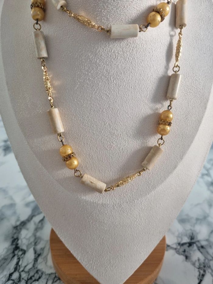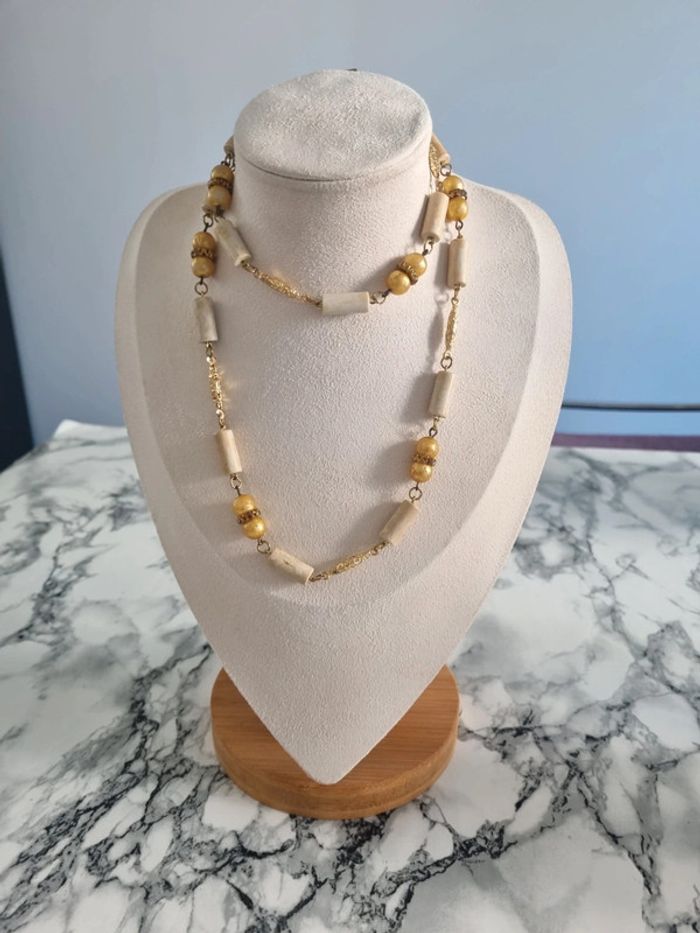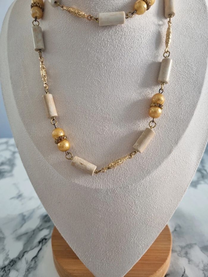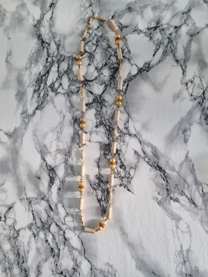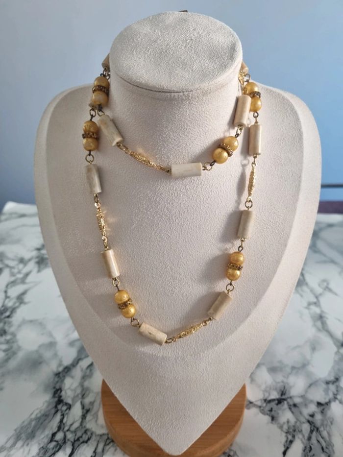 Beau collier en perle vintage En bon état Couleurs crème et doré Très beau mélange de forme arrondie et cylindre Année '80 Dimensions : - Longueur total : 78 cm - Largeur : 1 cm