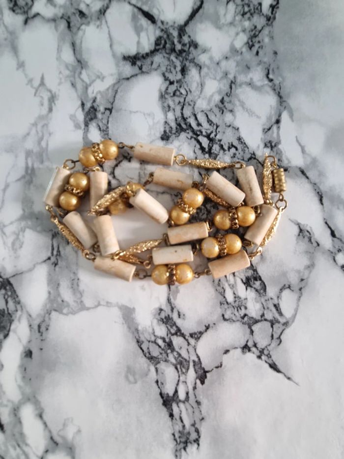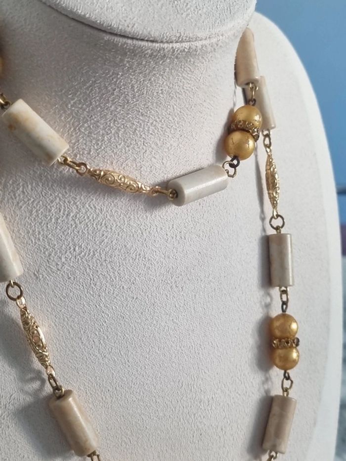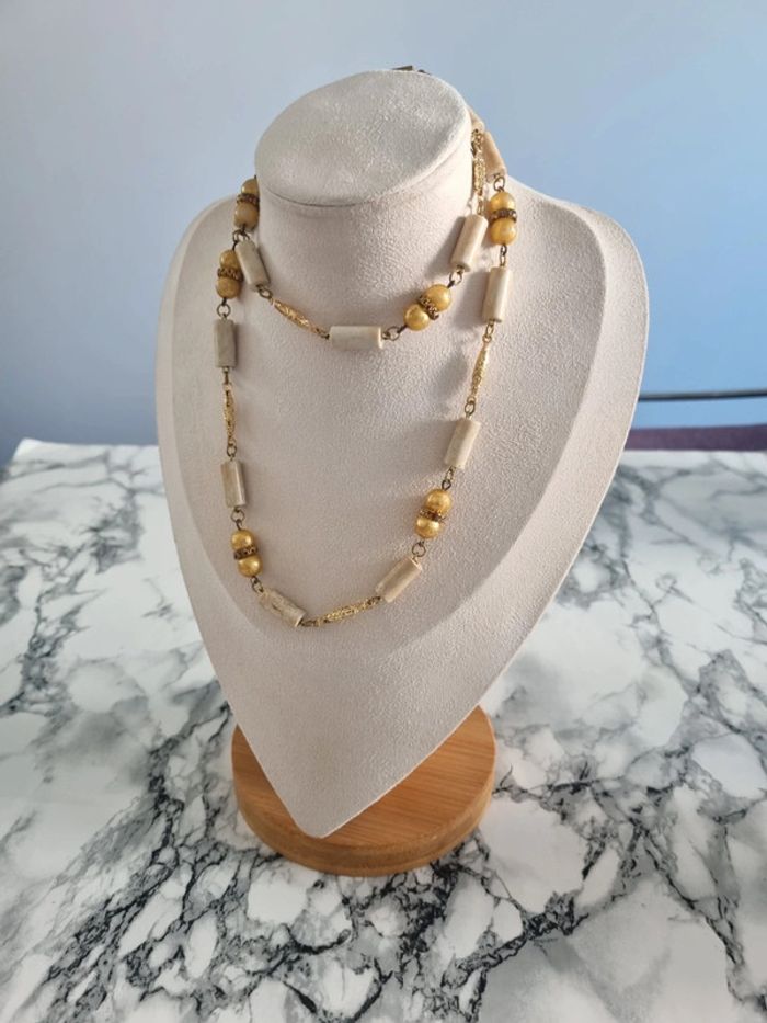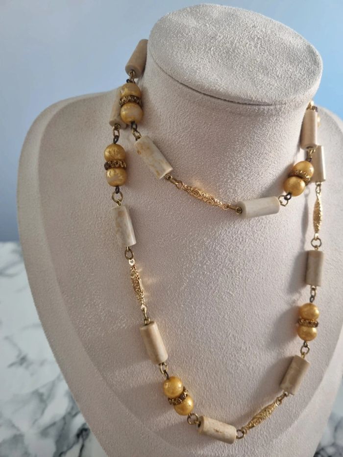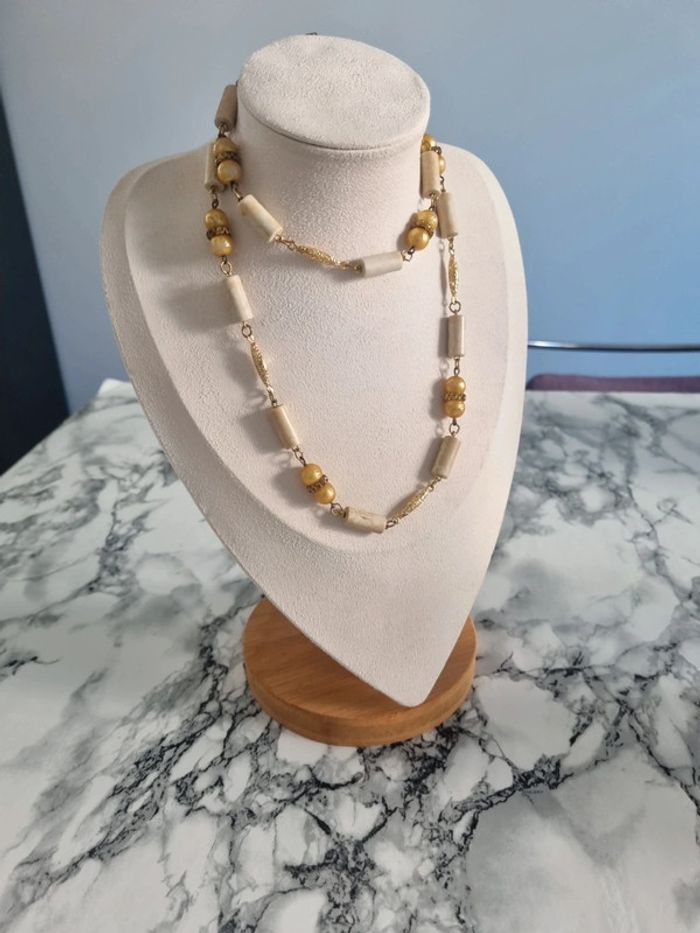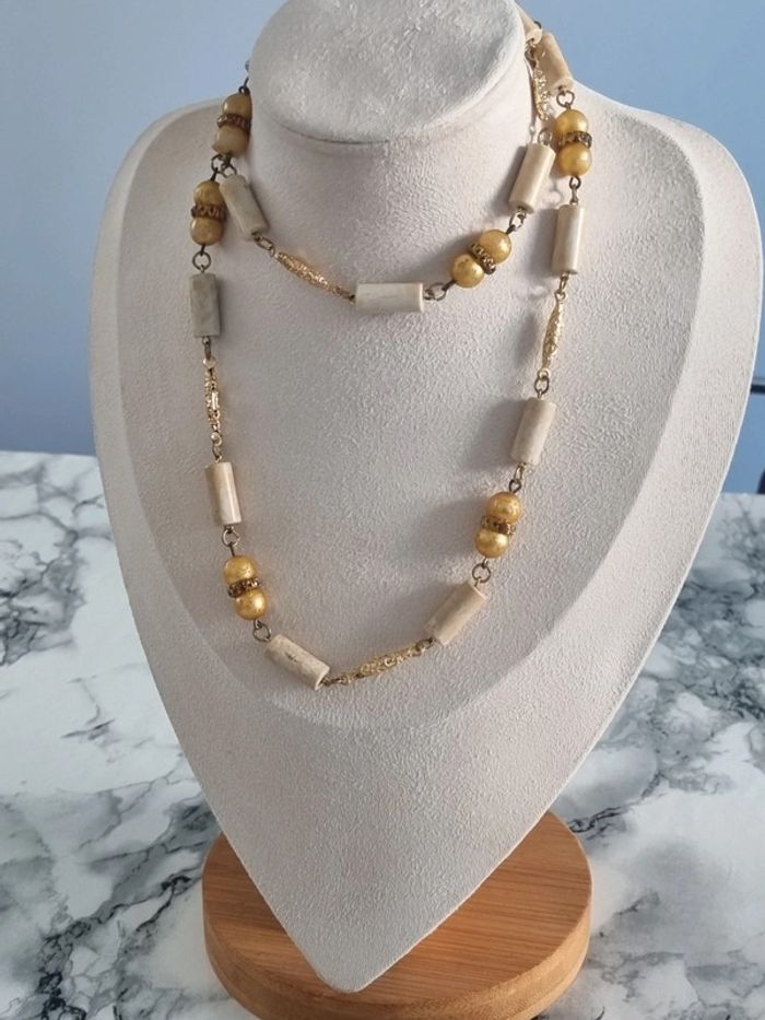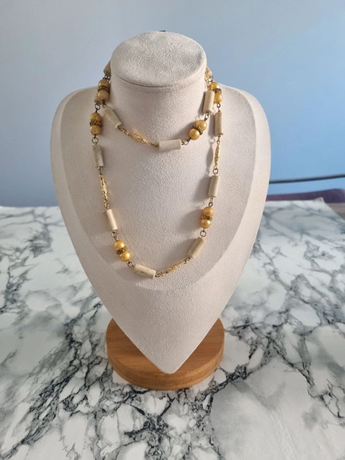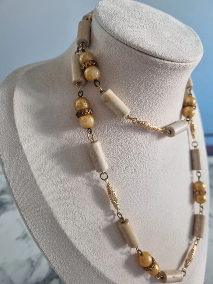 Beau collier en perle vintage En bon état Couleurs crème et doré Très beau mélange de forme arrondie et cylindre Année '80 Dimensions : - Longueur total : 78 cm - Largeur : 1 cm