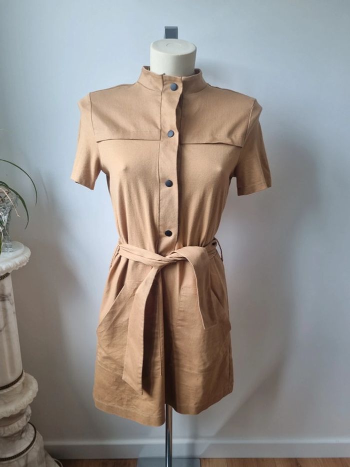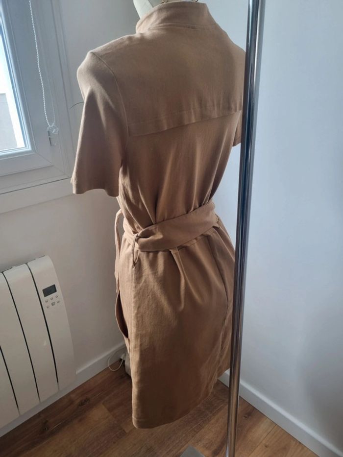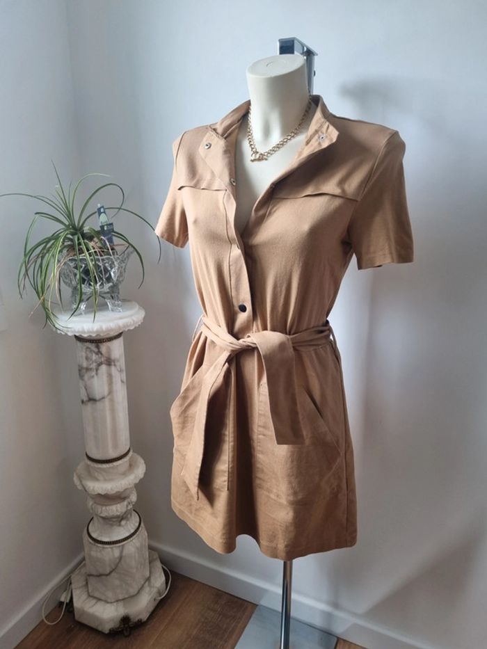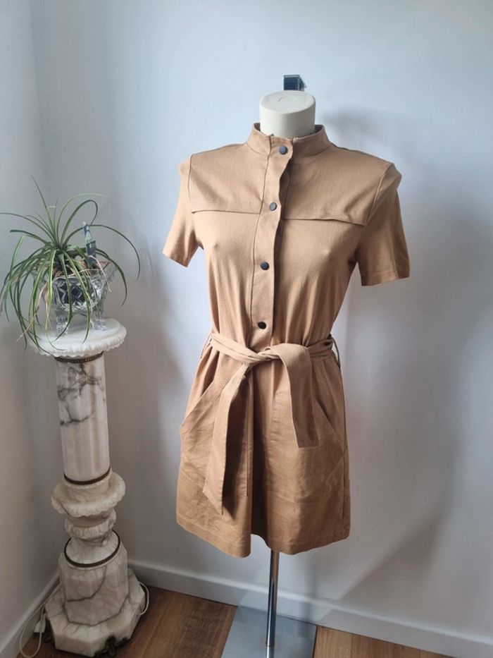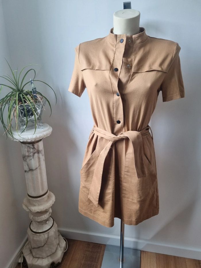 Magnifique robe Zara beige En parfait état Avec sa ceinture Beau boutons noir mat sur le devant Deux poches à l'avant Taille M Dimensions sans la ceinture à plat : - Largeur épaules : 42 cm - Largeur taille : 44 cm - Longueur dos : 95 cm - Largeur aiselles : 46 cm