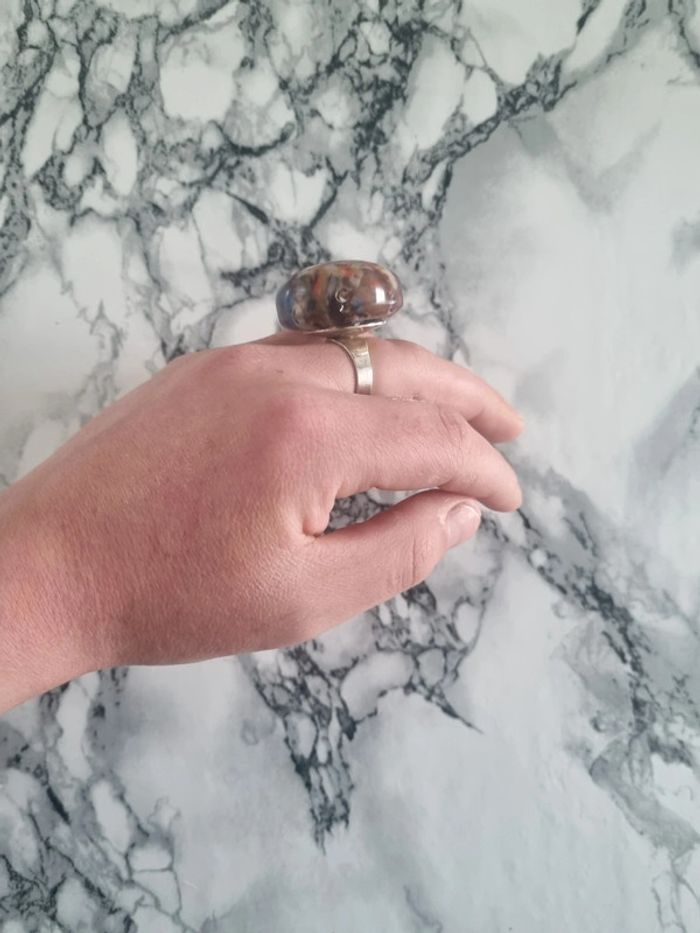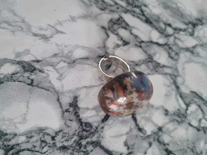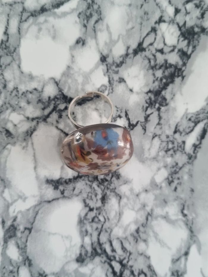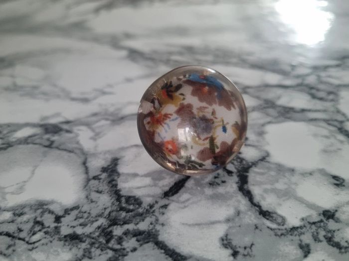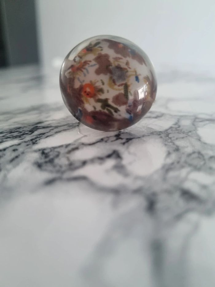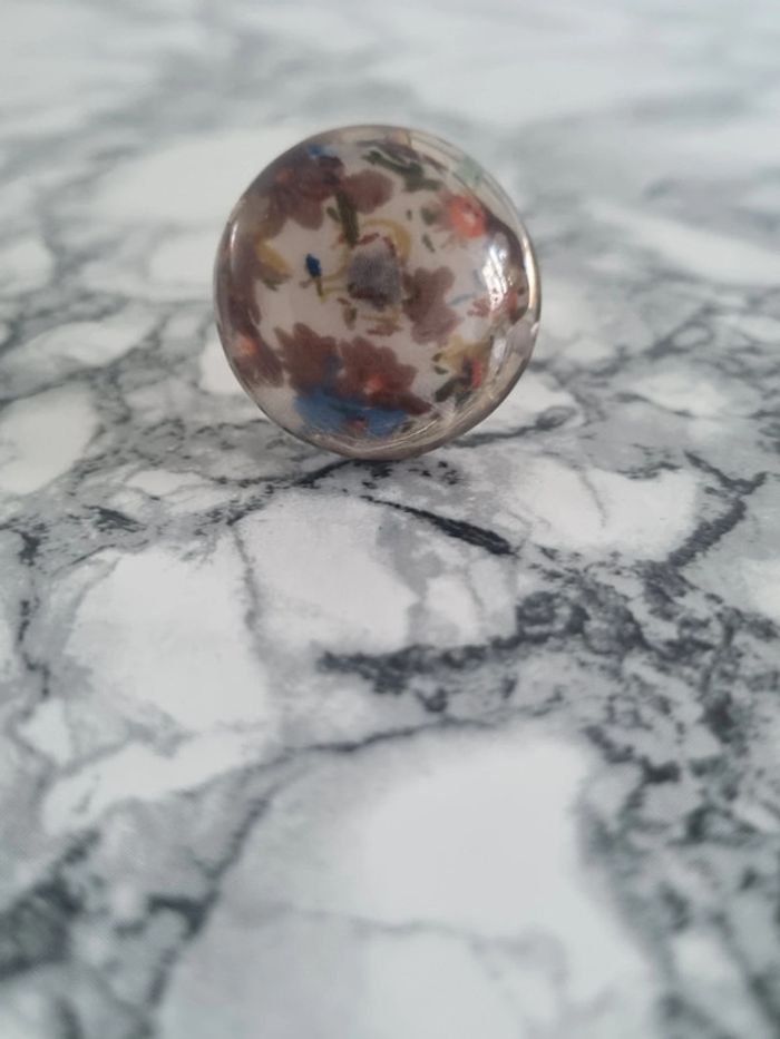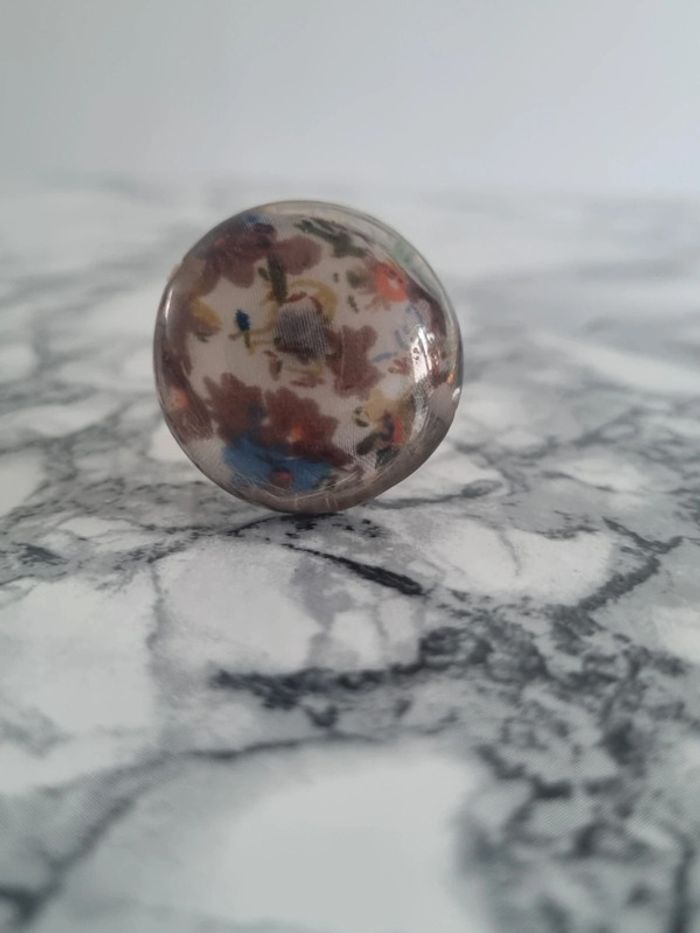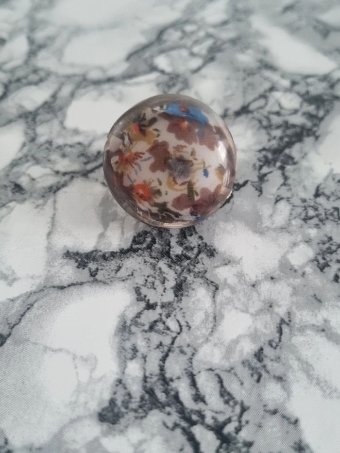 Belle bague ronde motif fleurie Tissus à l'intérieur fleurie Assez grande Elle est reglabe En bon état Dimensions : - Largeur du rond : 3,5 cm
