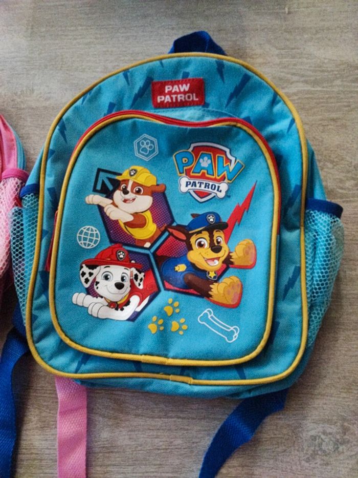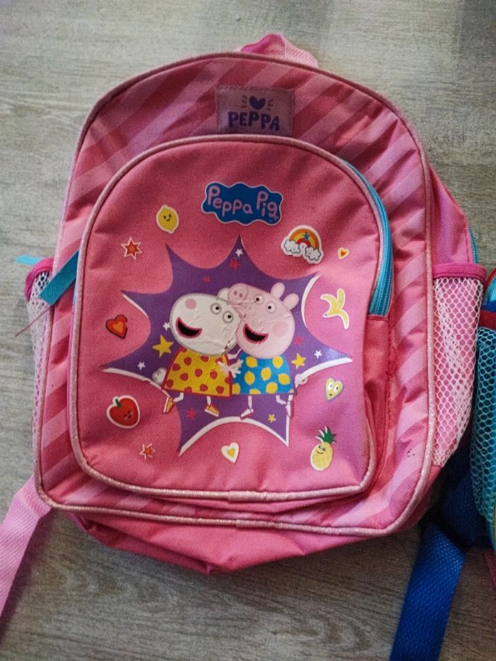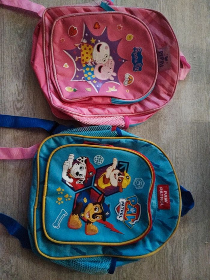 Lot de deux sac à dos environ 30 cm de haut Peppa pig logo abîmé Paw patrol logo nickel Voir les photos En bon état mais a rennetoyer légèrement, en soi elles sont toujours OK et intérieur aussi voir photos.
