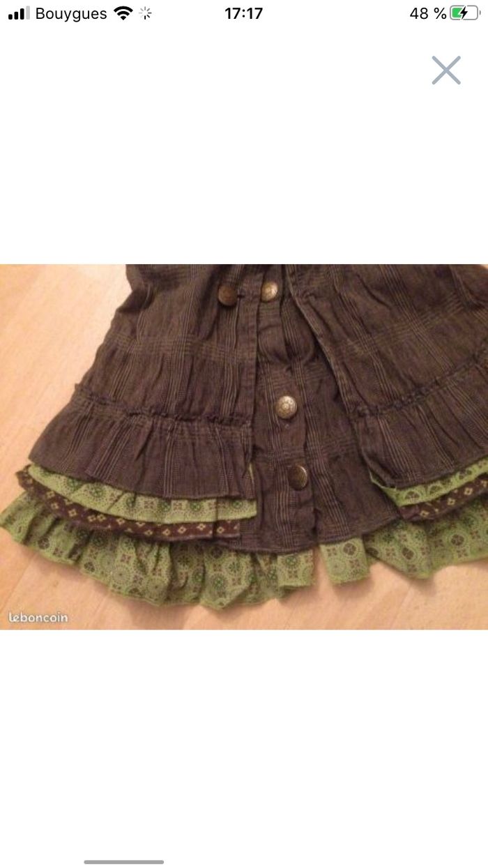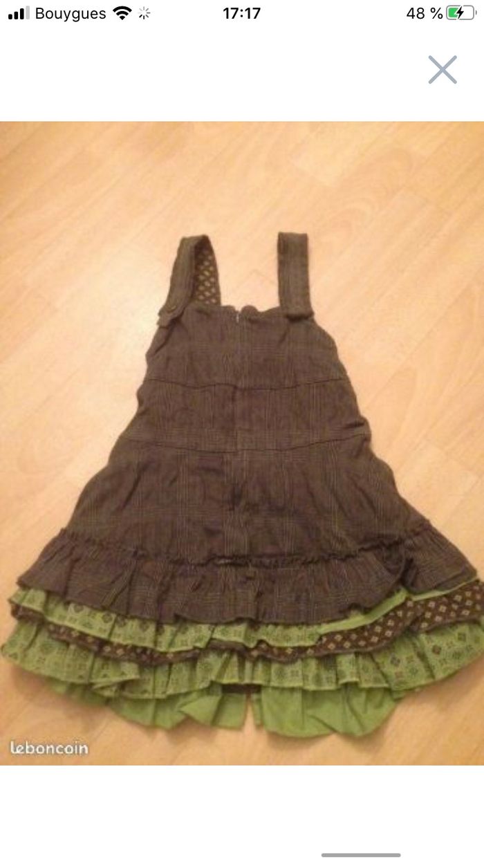 robe fille taille 3 ans = 94 cm MARESE couleur vert foncé et clair imprimé sur le bas boutons dorés sur l'avant (il en manque 1 de decoration ) fermeture éclair au dos 98% coton 2% elasthanne doublure : 100% coton très bon état j'offre la paire de collants ( 23/26 ) avec, mais qui bouloche (Ça donne une idee de la couleur pour un futur achat d'un collant)