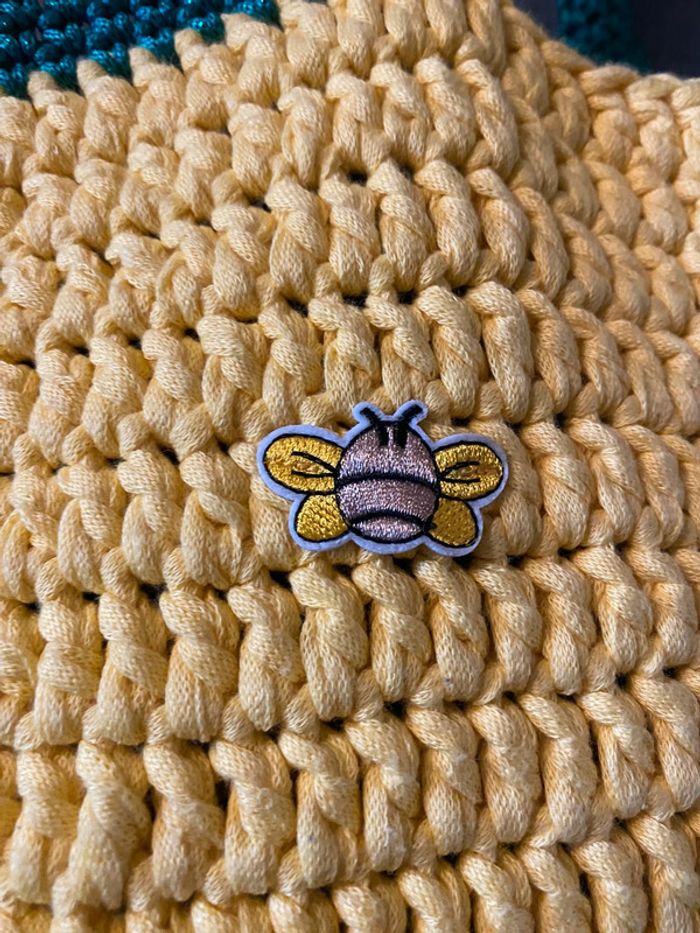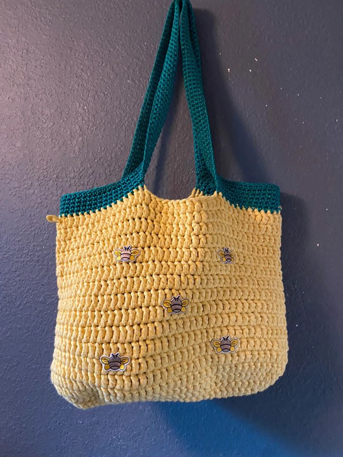 Jolie sac crochet jaune. Patch abeille, 40 sur 30