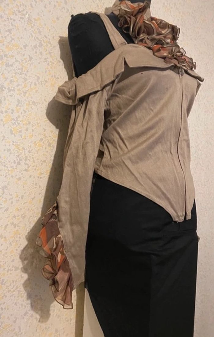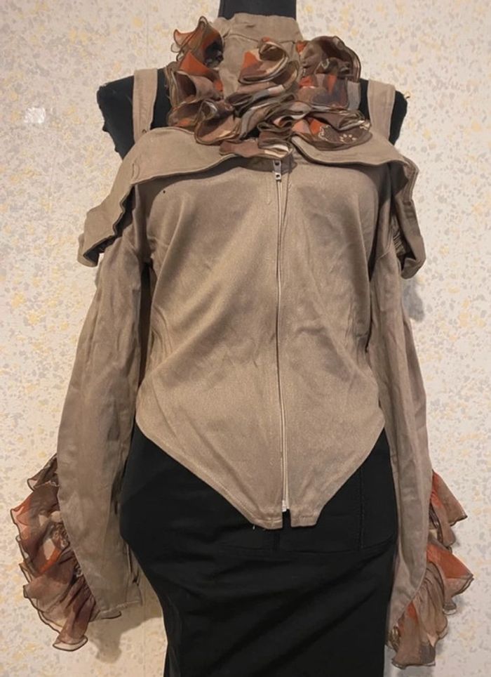 Magnifique top vintage zip , stretch empiècement volants manches et col,taille 38