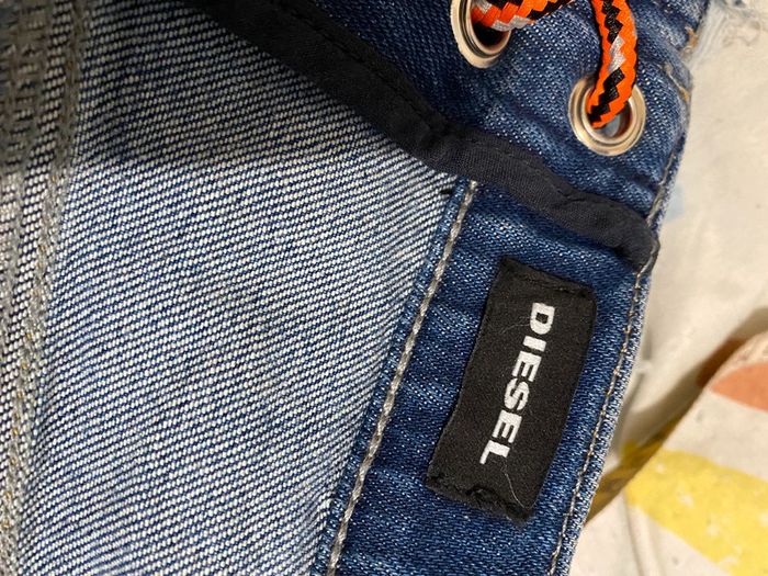 Mini short diesel, taille haute,hauteur braguette 28 cm,dos lacets orange, bas frange, taille 26 us ,36 ultra stretch