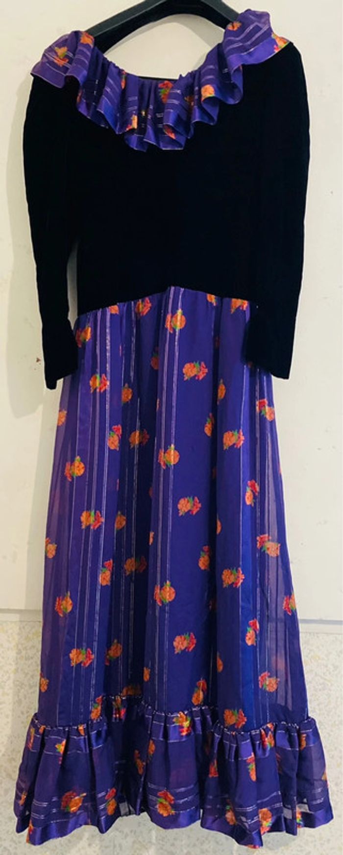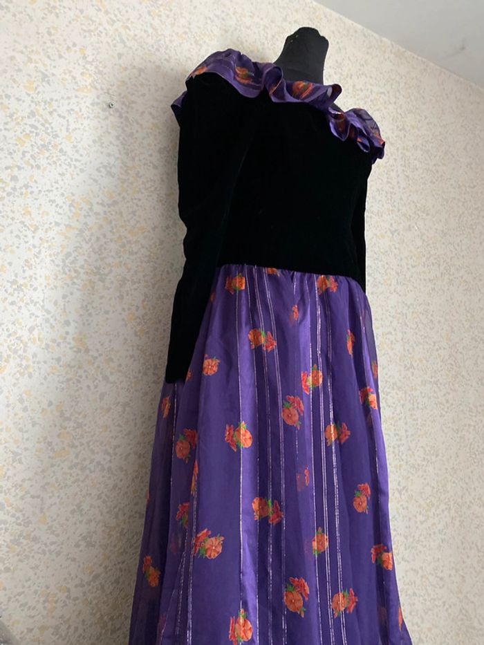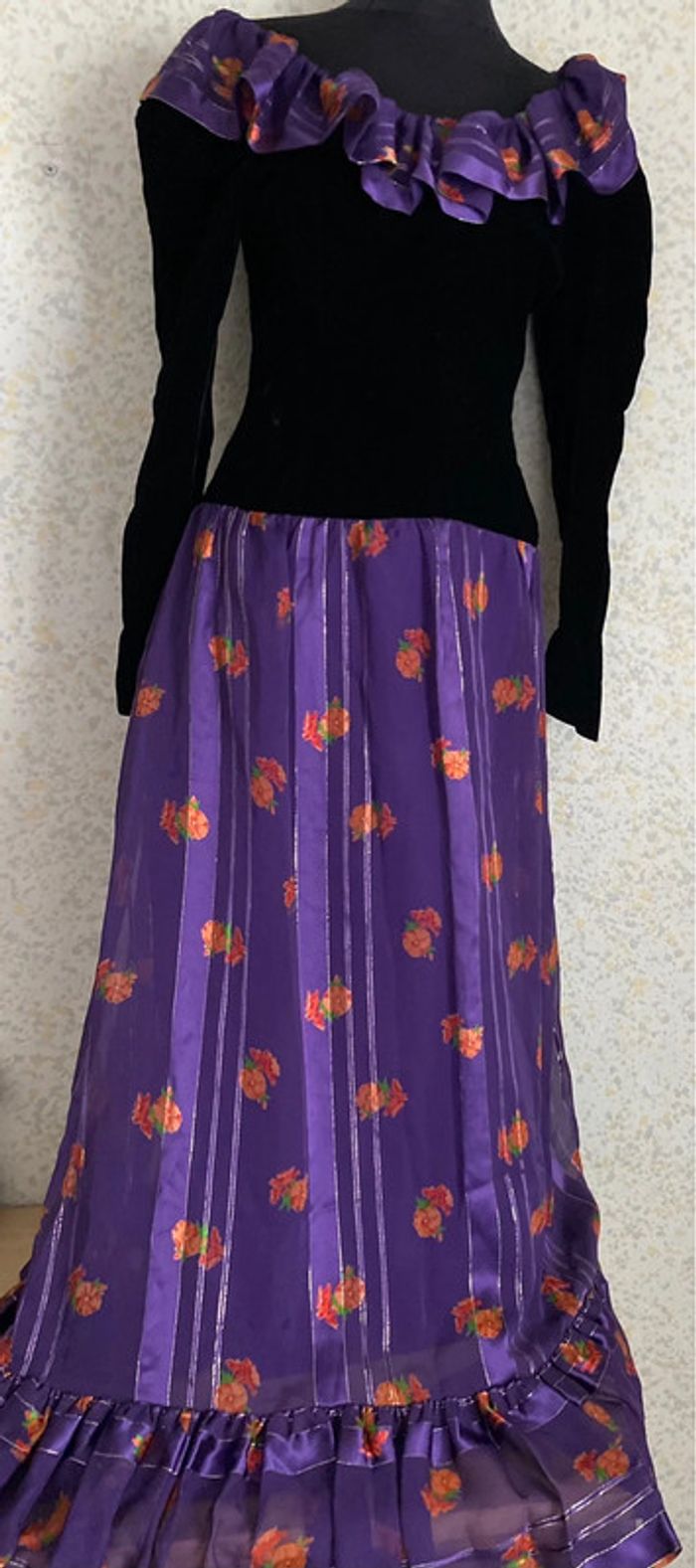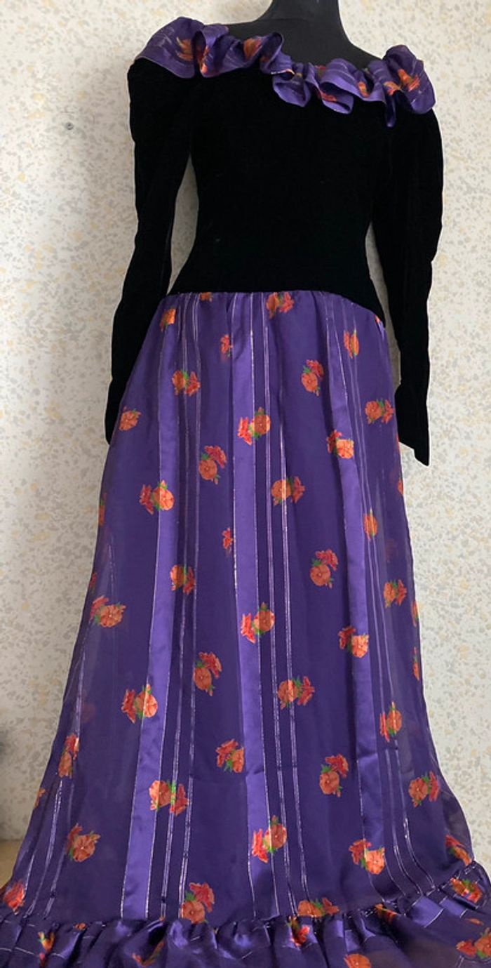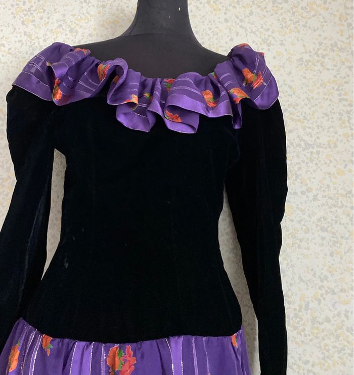 Magnifique robe vintage haut velours,jupe et volant soie ,doublé jupe soie violette,taille 36, longueur 1,40,taille 36, aisselles 44 cm