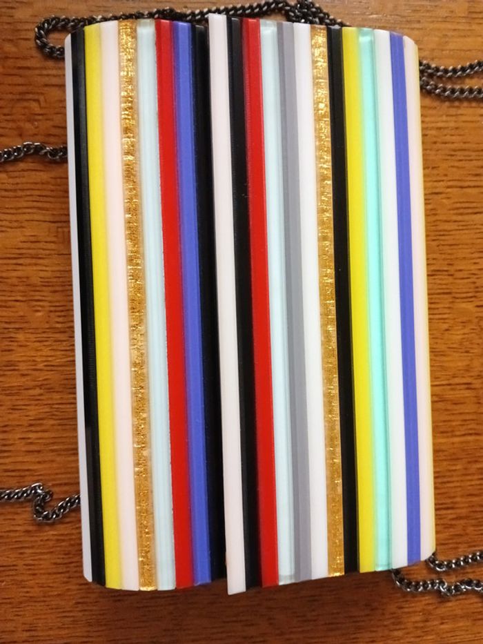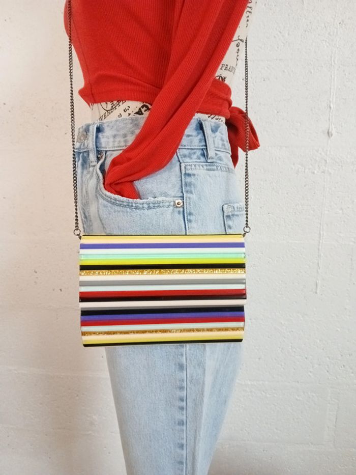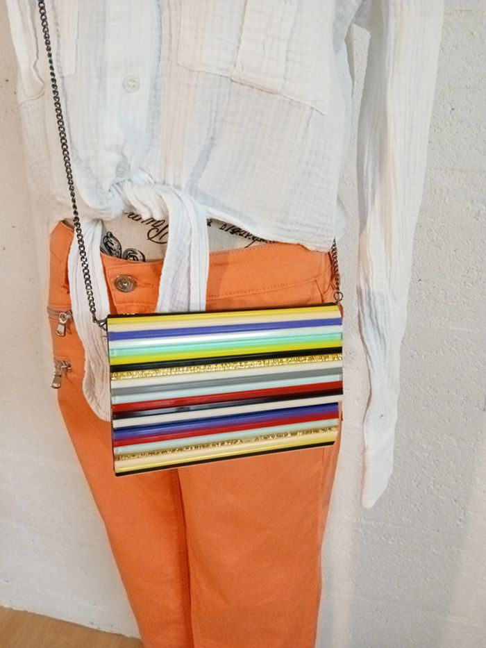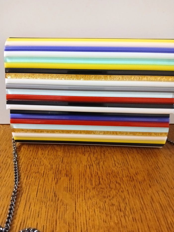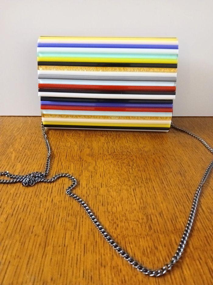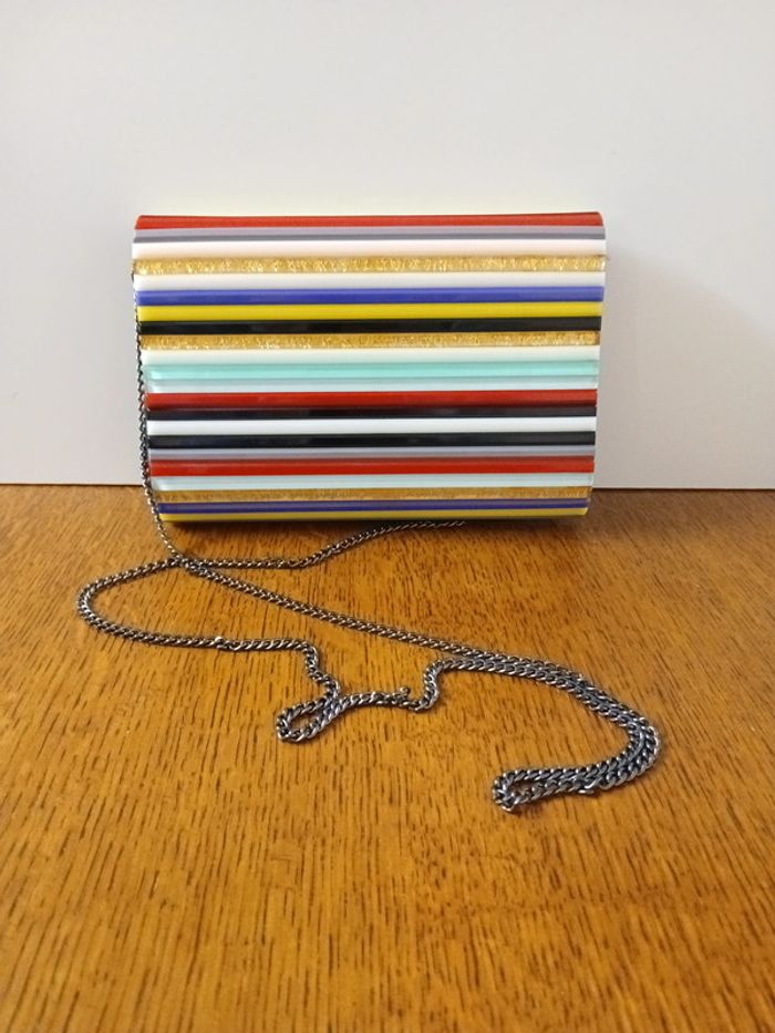 Petit sac rigide, style pochette tres bon état baguettes multicolores en plastique marque PARFOIS Belle chaine grise amovible dimensions : 18.5 cm longueur, largeur 3 cm et hauteur 13 cm