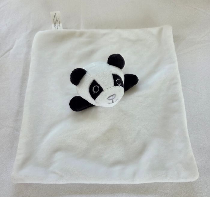 Doudou carré plat en velours de couleur blanc. Panda en velours de couleur blanc et noir sur le milieu du doudou.
