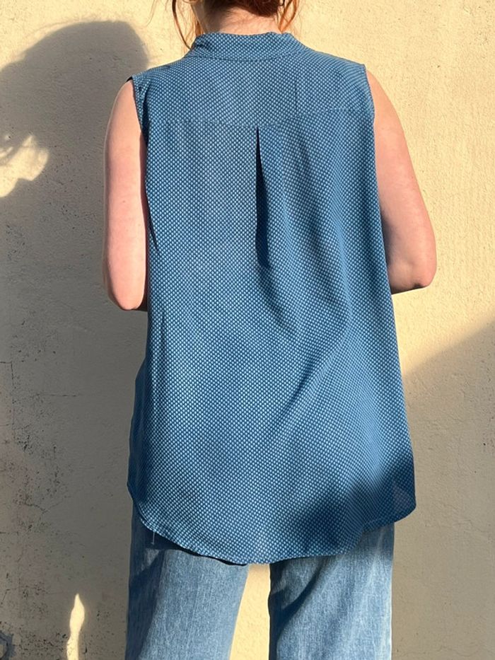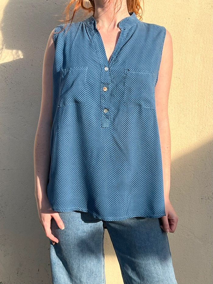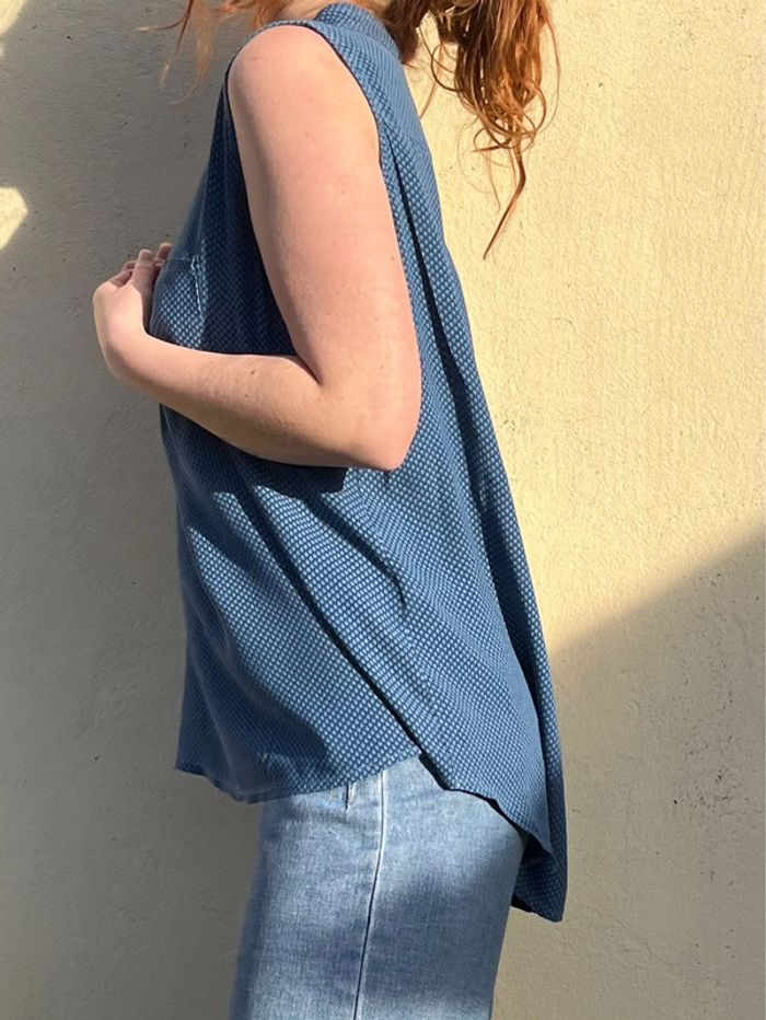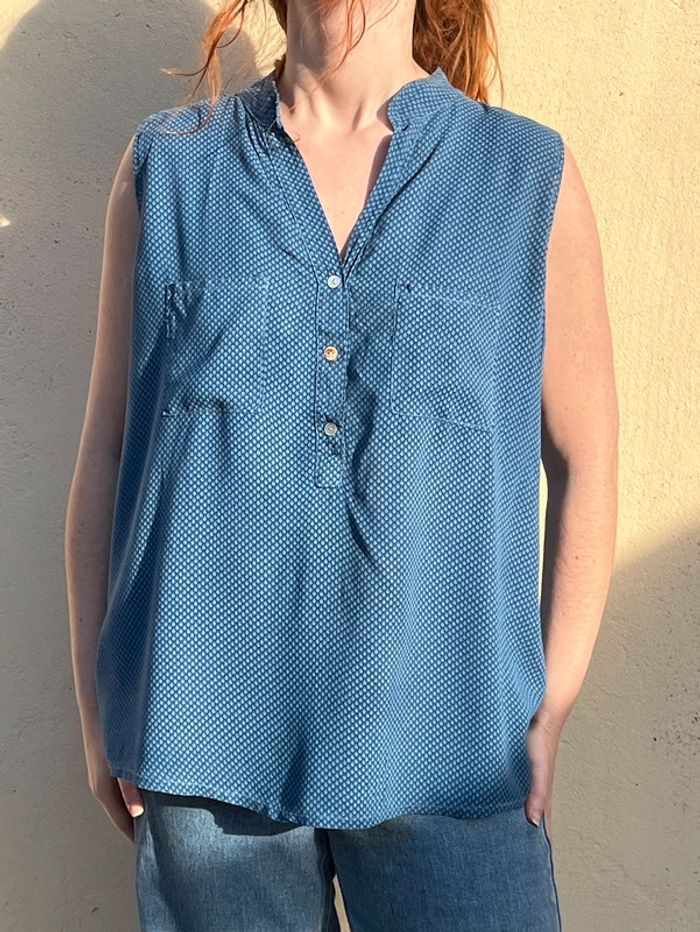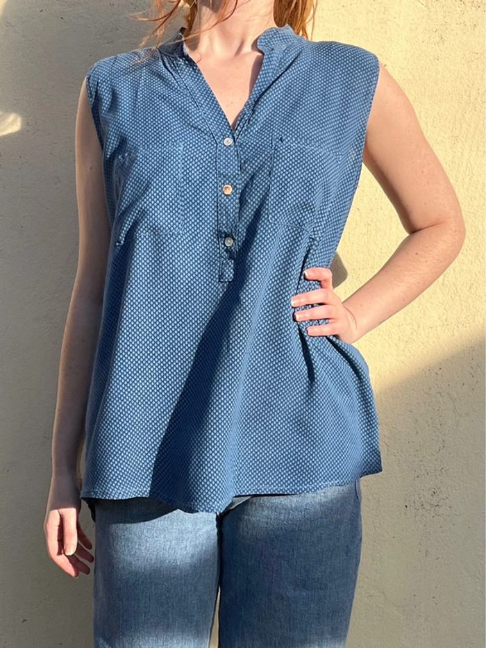 Haut blouse sans manches, légèrement cintré, avec col chemisier en V. Forme arrondie sur le bas et asymétrique ; plus long à l’arrière qu’à l’avant. Se déboutonne à l'avant avec 3 boutons couleur nacrée. 2 poches au niveau de la poitrine. Motifs petites fleurs bleu clair sur fond bleu. Pas d’étiquette de taille correspond à un 44 - je porte du S/M, mesure 1,69m et fait du 95B, rend grand sur moi, rendra mieux porté à la bonne taille. Pas de marque, Made in Italy - Style Vintage, y2k. Confortable, tissus fluide agréable, portable en été ou mi-saison. 100% viscose. Très bon état général, porté quelques fois. Aucun signes d’usure.