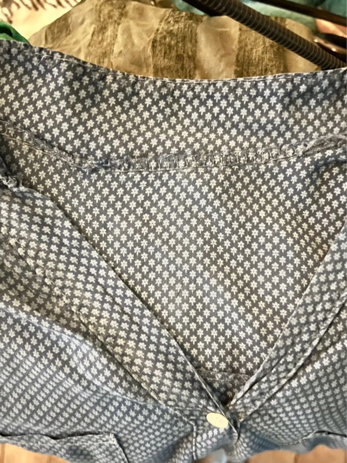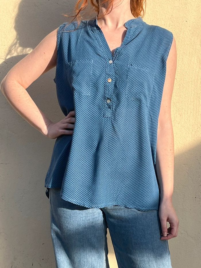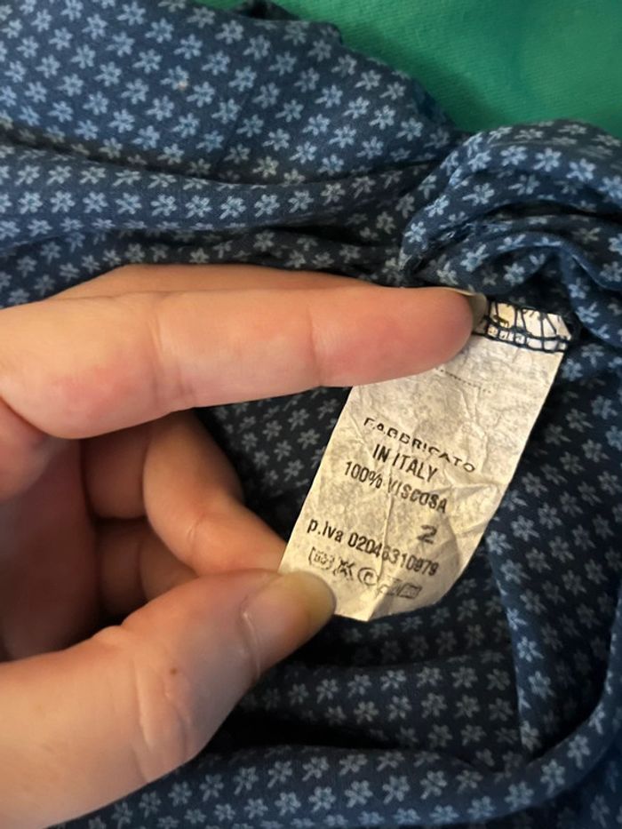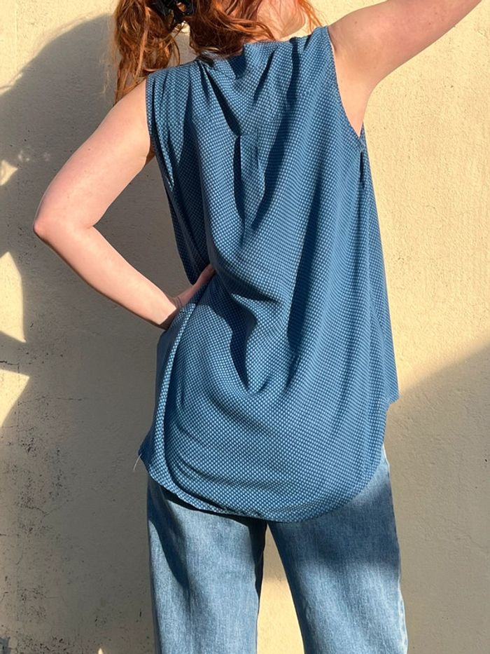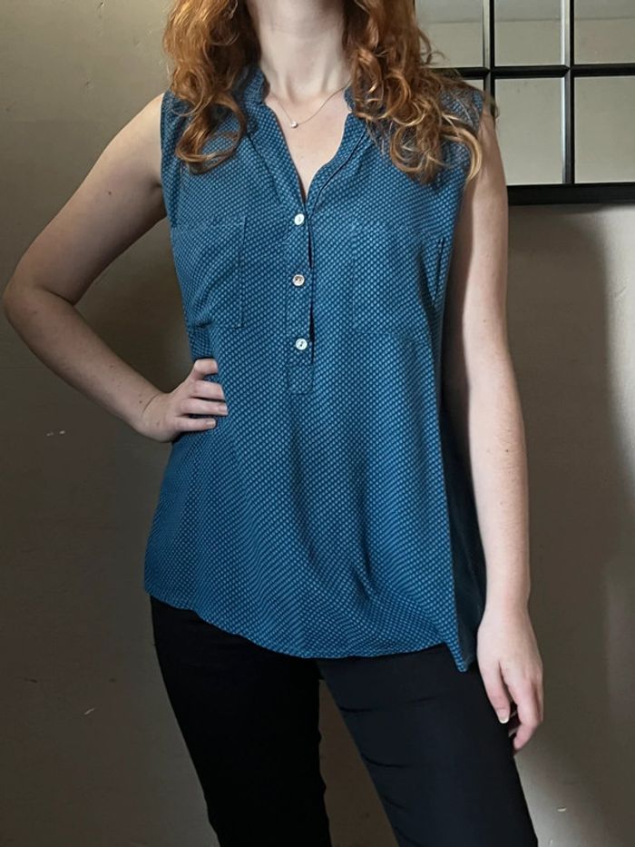 Haut blouse sans manches, légèrement cintré, avec col chemisier en V. Forme arrondie sur le bas et asymétrique ; plus long à l’arrière qu’à l’avant. Se déboutonne à l'avant avec 3 boutons couleur nacrée. 2 poches au niveau de la poitrine. Motifs petites fleurs bleu clair sur fond bleu. Pas d’étiquette de taille correspond à un 44 - je porte du S/M, mesure 1,69m et fait du 95B, rend grand sur moi, rendra mieux porté à la bonne taille. Pas de marque, Made in Italy - Style Vintage, y2k. Confortable, tissus fluide agréable, portable en été ou mi-saison. 100% viscose. Très bon état général, porté quelques fois. Aucun signes d’usure.