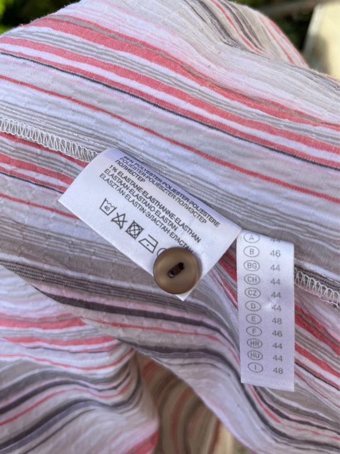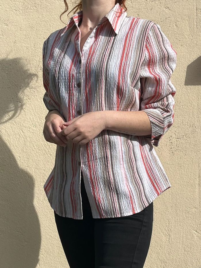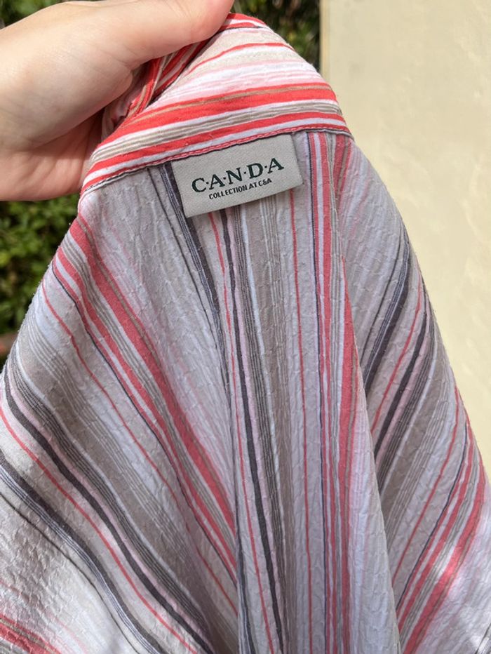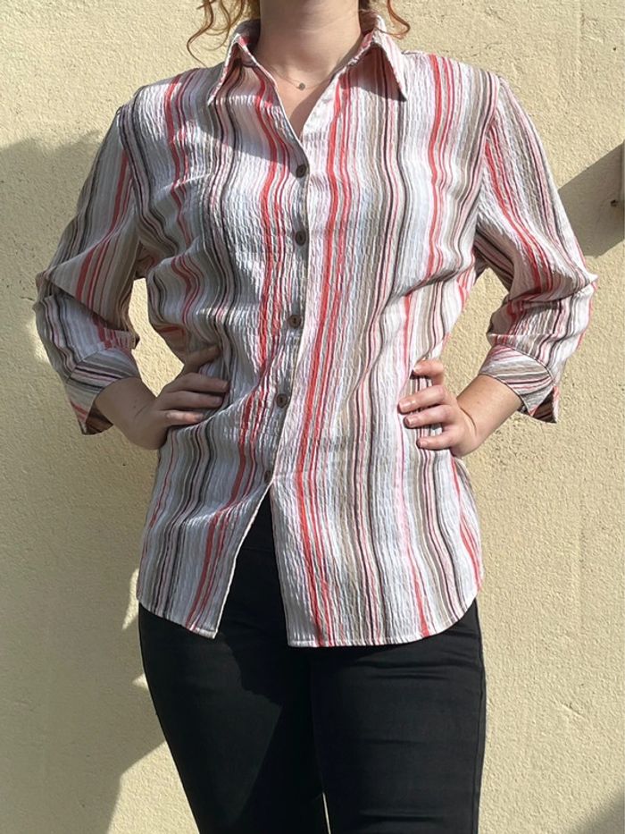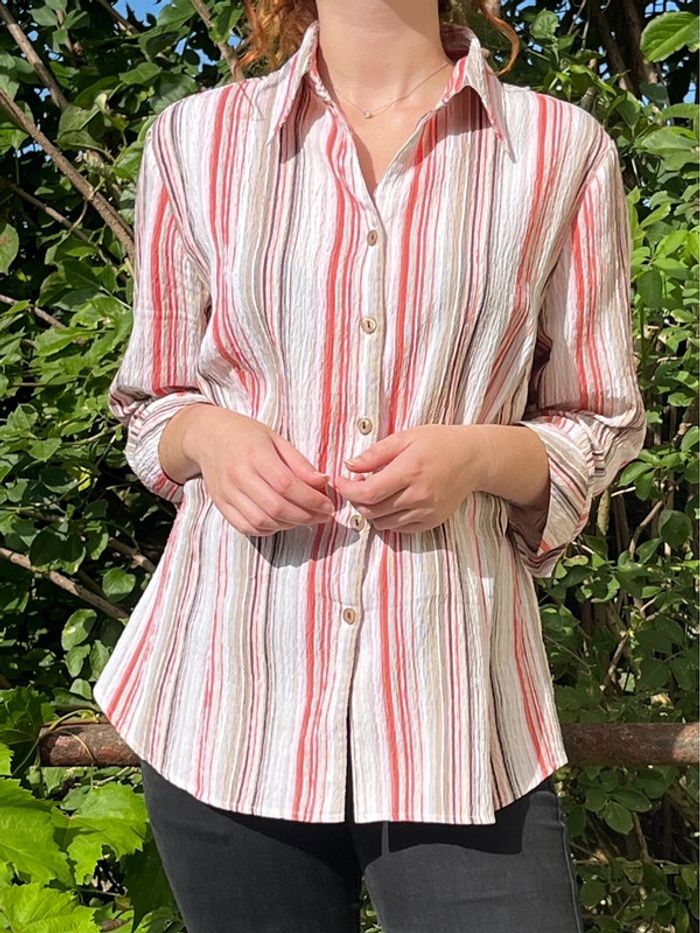 Haut chemise manches mi-longues 3/4, coupe droite cintré, se déboutonne à l'avant avec 5 boutons marron (1 de rechange cousue sur l'étiquette) - petite fente sur chaque manche. Bas arrondie. Motifs lignes verticales avec tissu plissé effet froissée - Couleur rose saumon orangé, rose pale, marron, kaki et blanc. Taille 46 - je porte du S/M et mesure 1,69m, rend grand sur moi, rendra mieux porté à la bonne taille. Marque: CANDA collection at C&A - Style Vintage, y2k. Confortable, tissus fluide agréable, portable en toute saison. 99% polyester 1% elasthanne Très bon état général, aucun signe d'usure. Porté quelques fois.