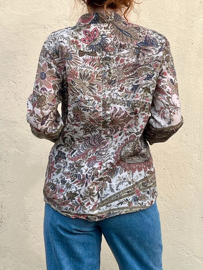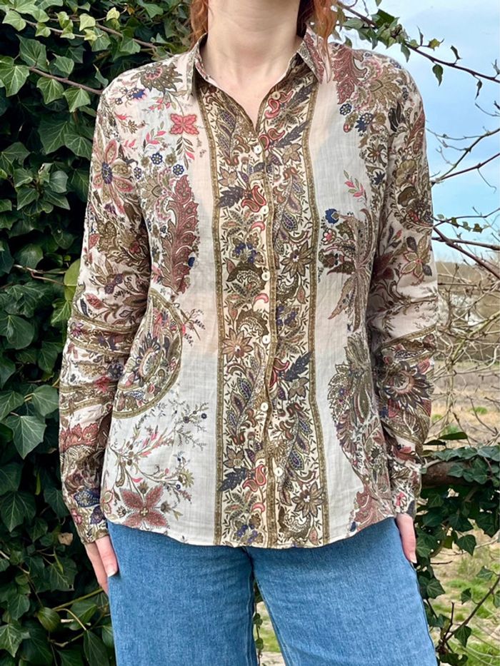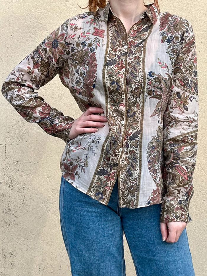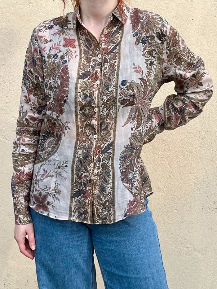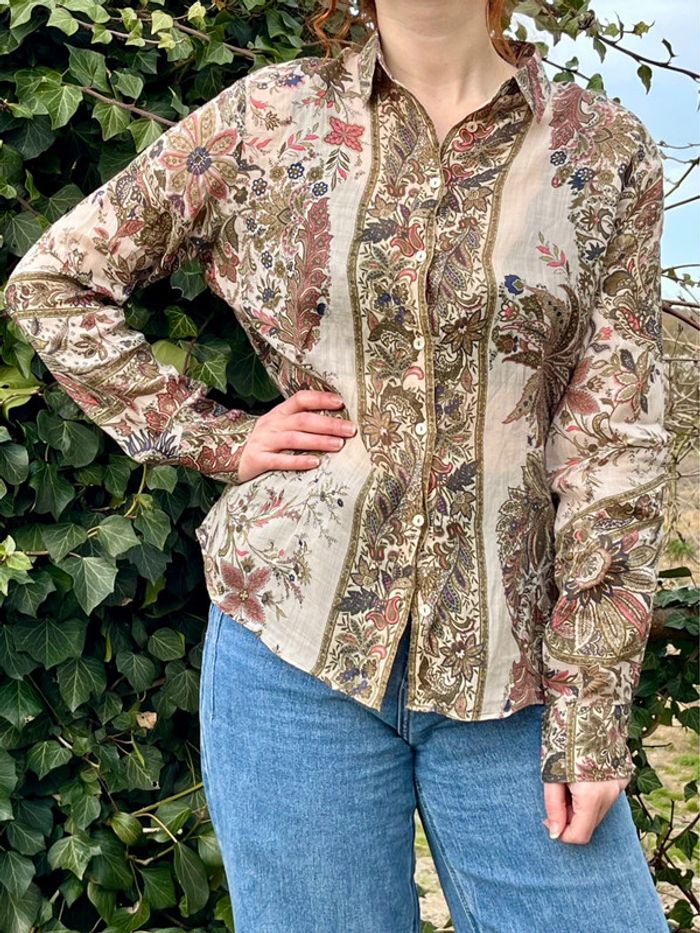 Haut chemise manches longues, coupe fluide légèrement cintré, se déboutonne à l'avant avec 8 boutons blanc nacré (celui du col compris) bouton supplémentaire cousu sur l’étiquette - 1 bouton sur chaque manche. Motifs fleuris nature : fleurs et plantes couleurs marron kaki, bleu marine et rose fluo flashy - fond blanc crème, légèrement transparent. Taille 42 - je porte du S/M, mesure 1,69m et fait du 95B, rend grand sur moi, rendra mieux porté à la bonne taille. Marque : Massimo Dutti - Style Vintage, y2k. Confortable, tissus fluide agréable, portable en toute saison - pour occasions ou tout les jours. 100% ramie - ressemble au lin, bonne alternative à la soie. Très bon état général, aucun signe d'usure. Porté quelques fois.