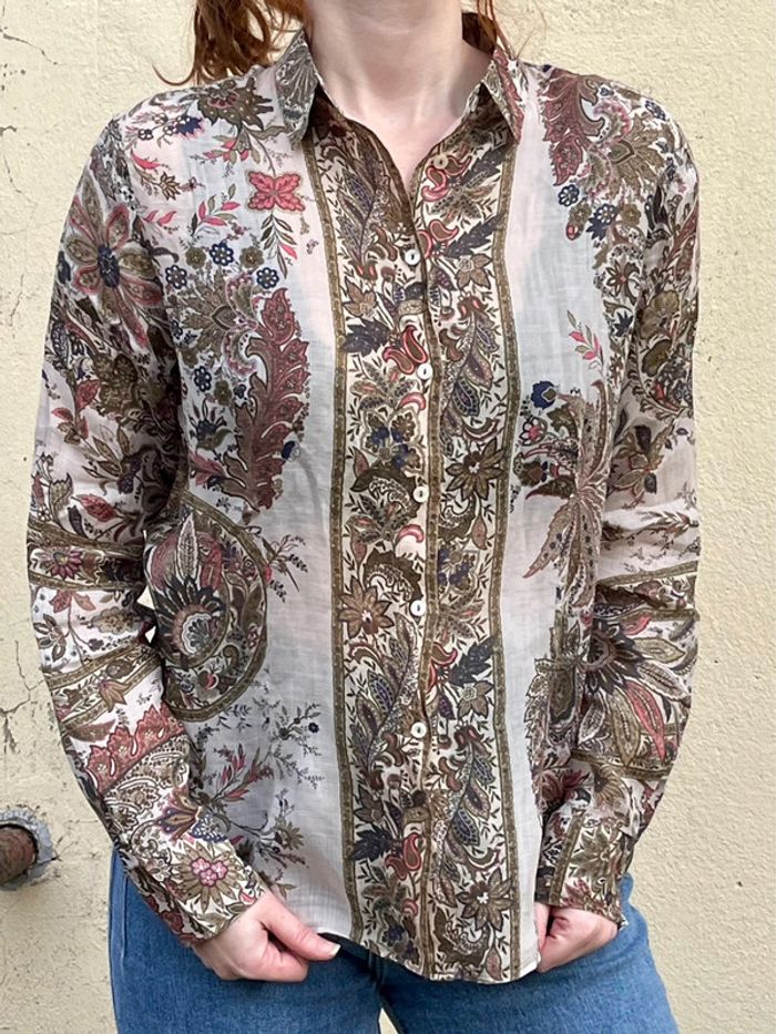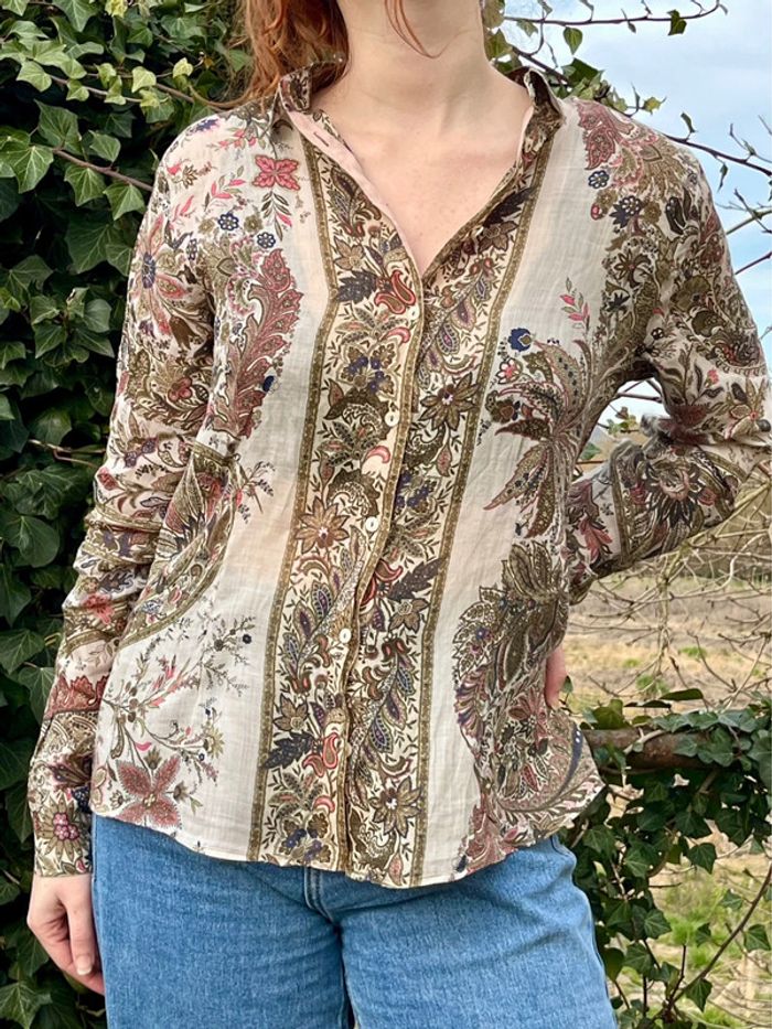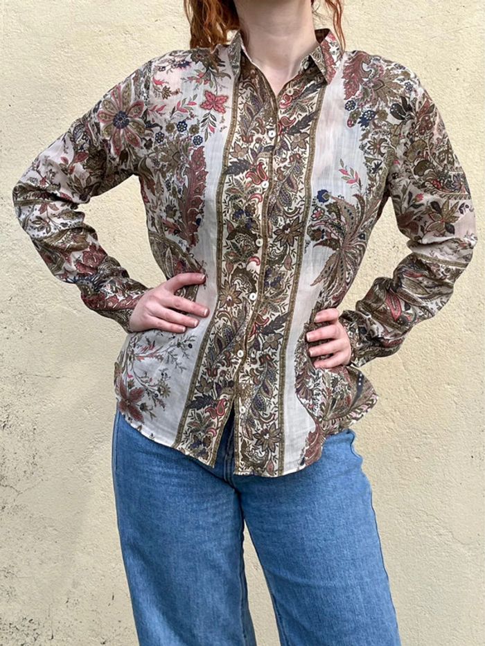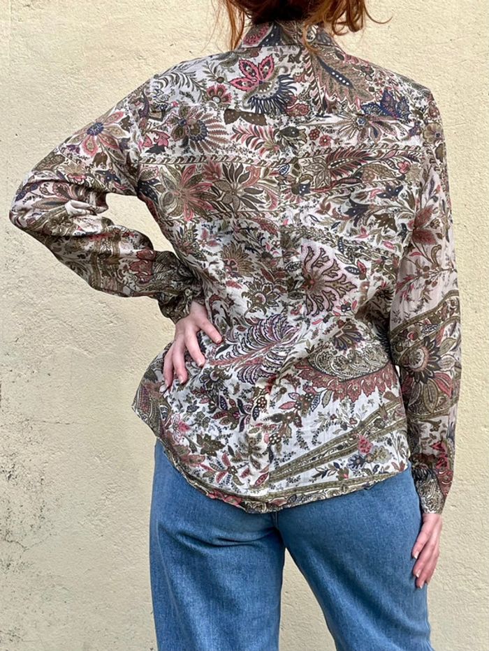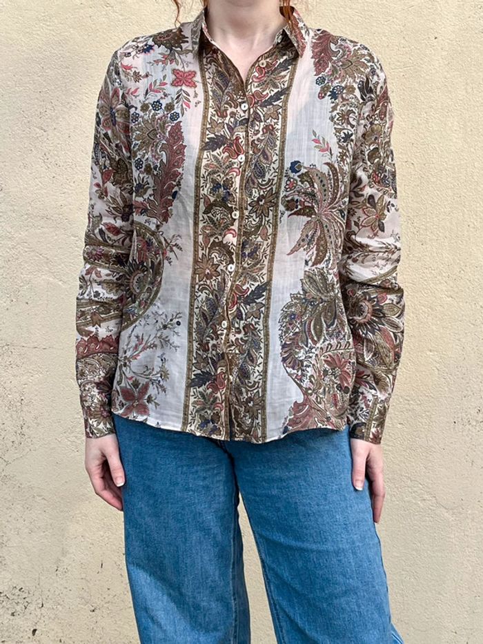 Haut chemise manches longues, coupe fluide légèrement cintré, se déboutonne à l'avant avec 8 boutons blanc nacré (celui du col compris) bouton supplémentaire cousu sur l’étiquette - 1 bouton sur chaque manche. Motifs fleuris nature : fleurs et plantes couleurs marron kaki, bleu marine et rose fluo flashy - fond blanc crème, légèrement transparent. Taille 42 - je porte du S/M, mesure 1,69m et fait du 95B, rend grand sur moi, rendra mieux porté à la bonne taille. Marque : Massimo Dutti - Style Vintage, y2k. Confortable, tissus fluide agréable, portable en toute saison - pour occasions ou tout les jours. 100% ramie - ressemble au lin, bonne alternative à la soie. Très bon état général, aucun signe d'usure. Porté quelques fois.