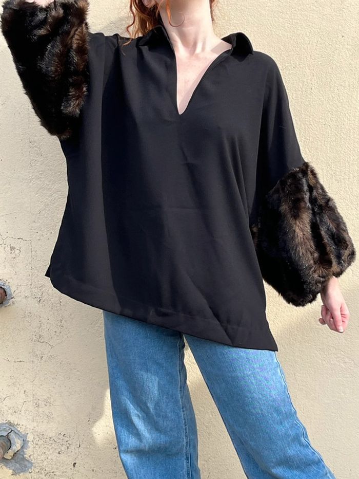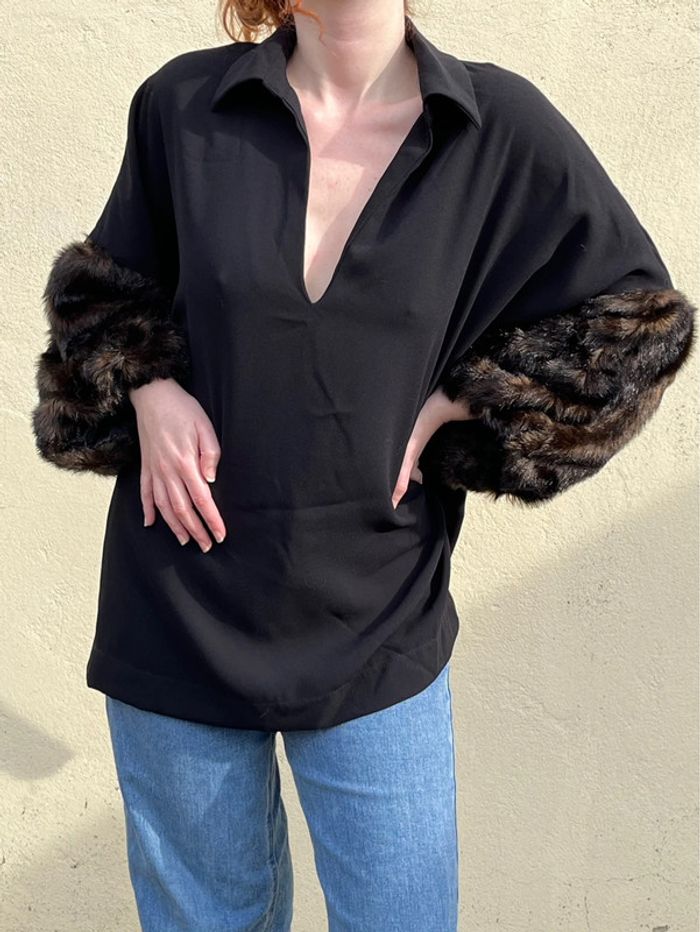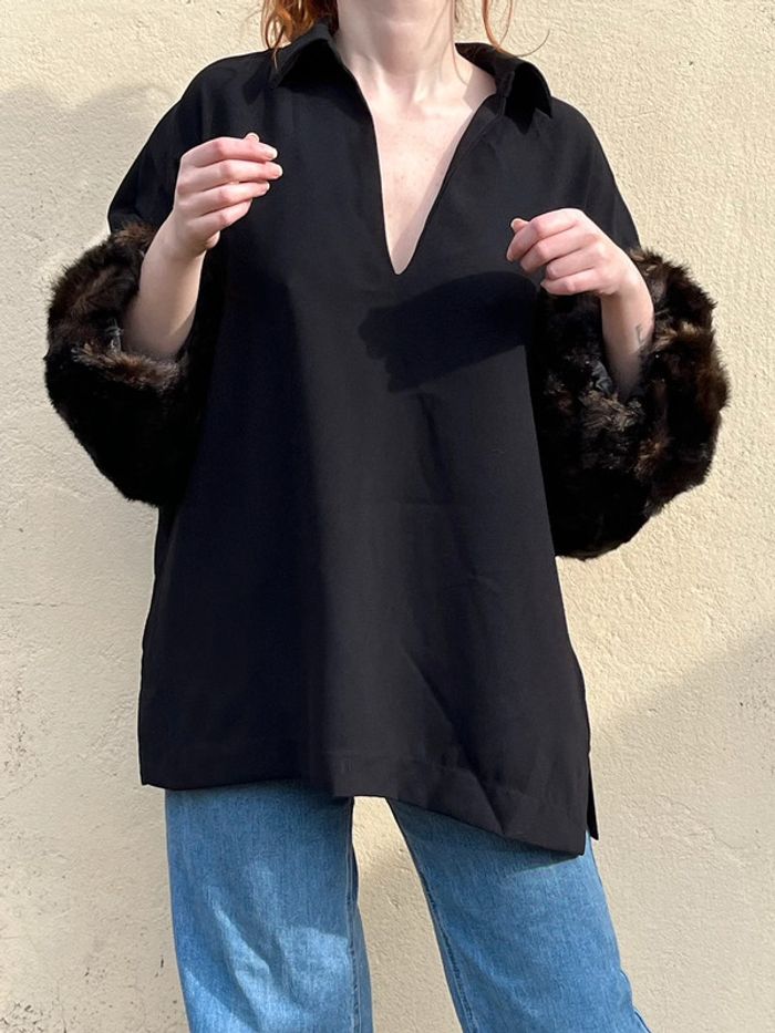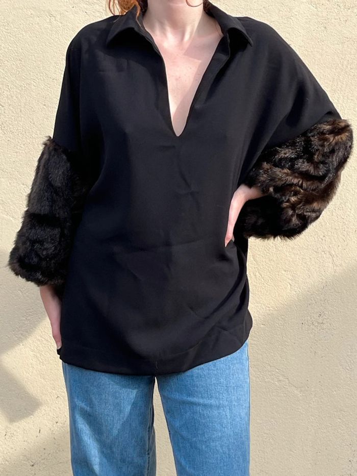 Haut blouse longue manches 3/4 en fausses fourrures style chauves-souris, coupe droite fluide, ample - décolleté col V avec col chemise. Petites fentes sur les côtés. Couleur noir et nuances de marrons. Taille 42 - je porte du S/M et mesure 1,69m, rend grand sur moi, rendra mieux porté à la bonne taille. Peut convenir à un 44. Marque : Zara Woman - Style Vintage, y2k. Confortable, tissus fluide agréable, portable en toute saison - pour occasions ou tout les jours. Neuve, jamais porté.