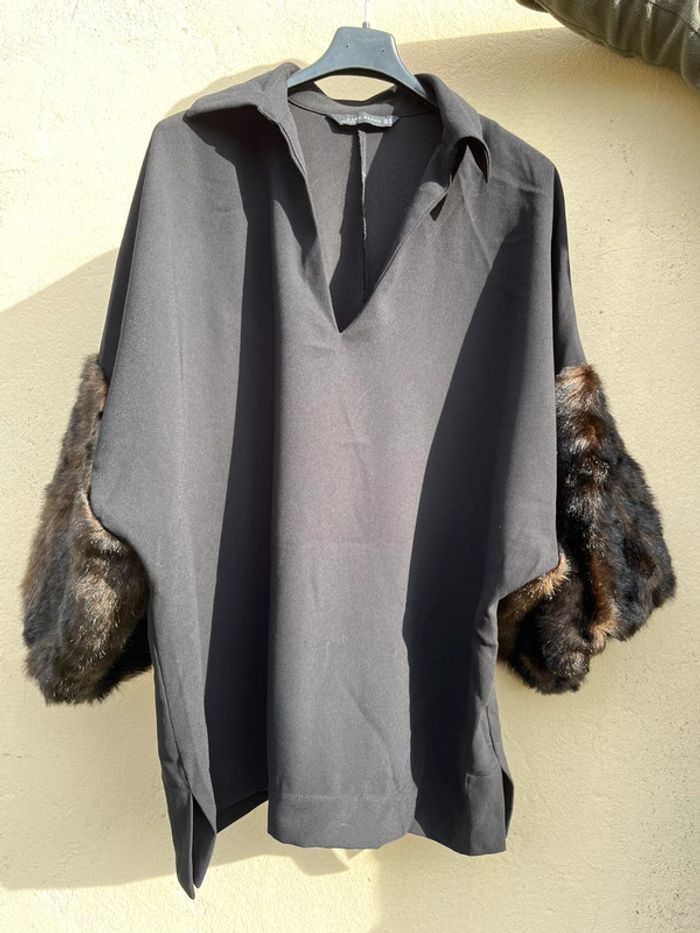 Blouse manches 3/4 avec fausses fourrures - noir et marron - photo numéro 3