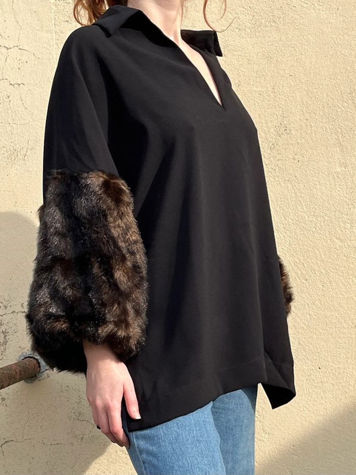 Blouse manches 3/4 avec fausses fourrures - noir et marron - photo numéro 2