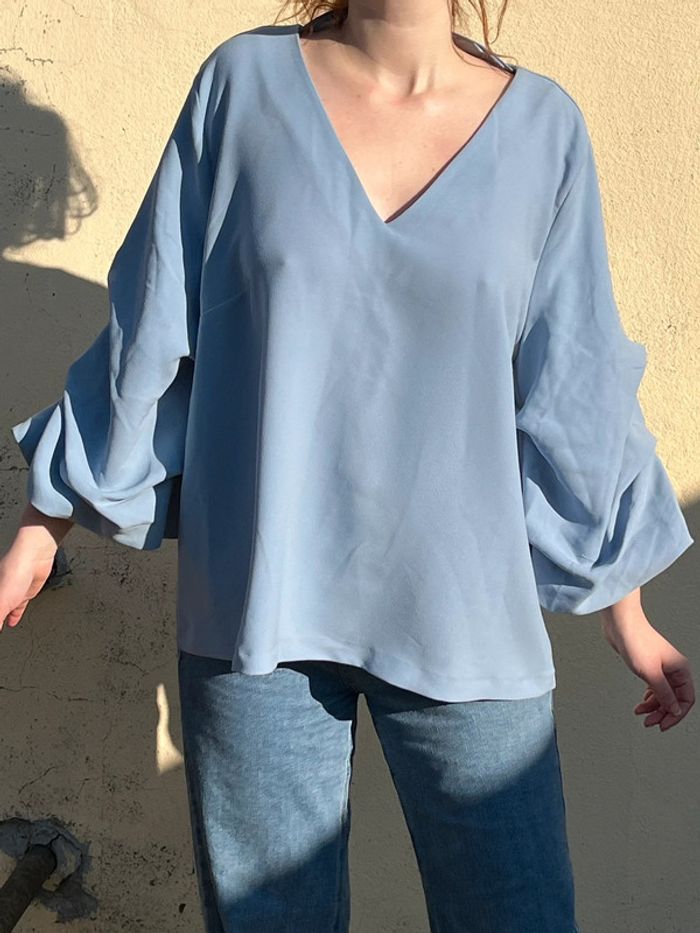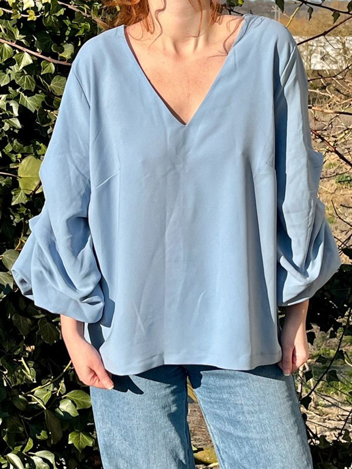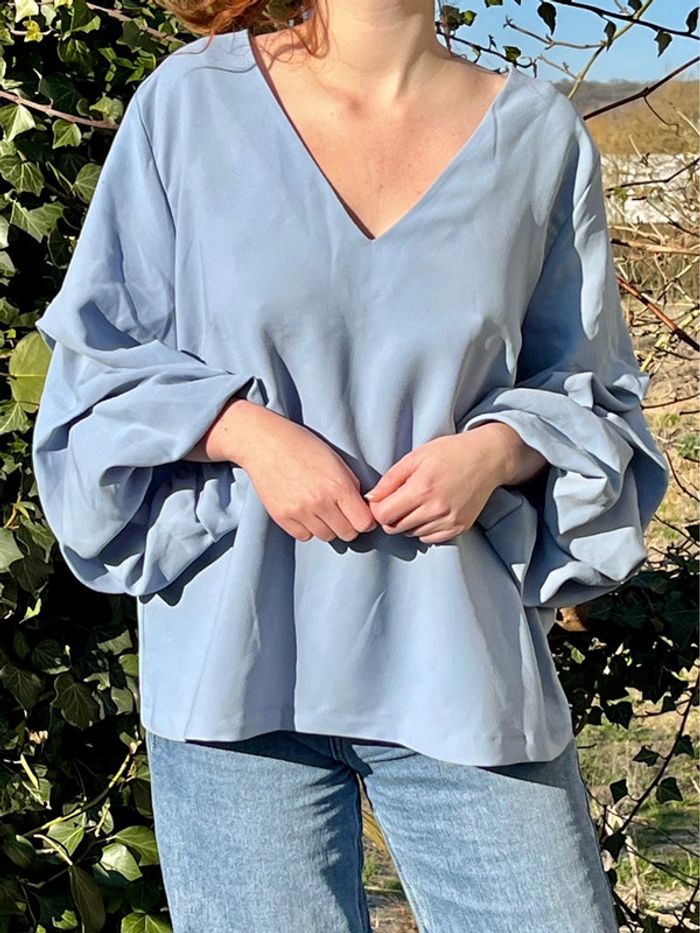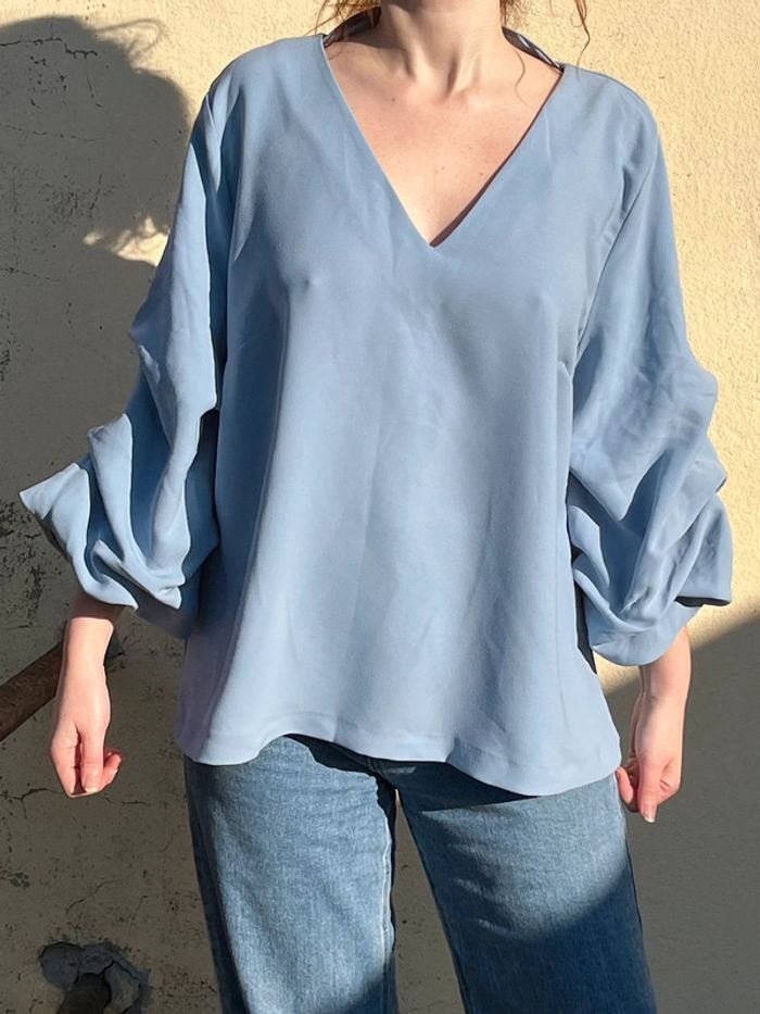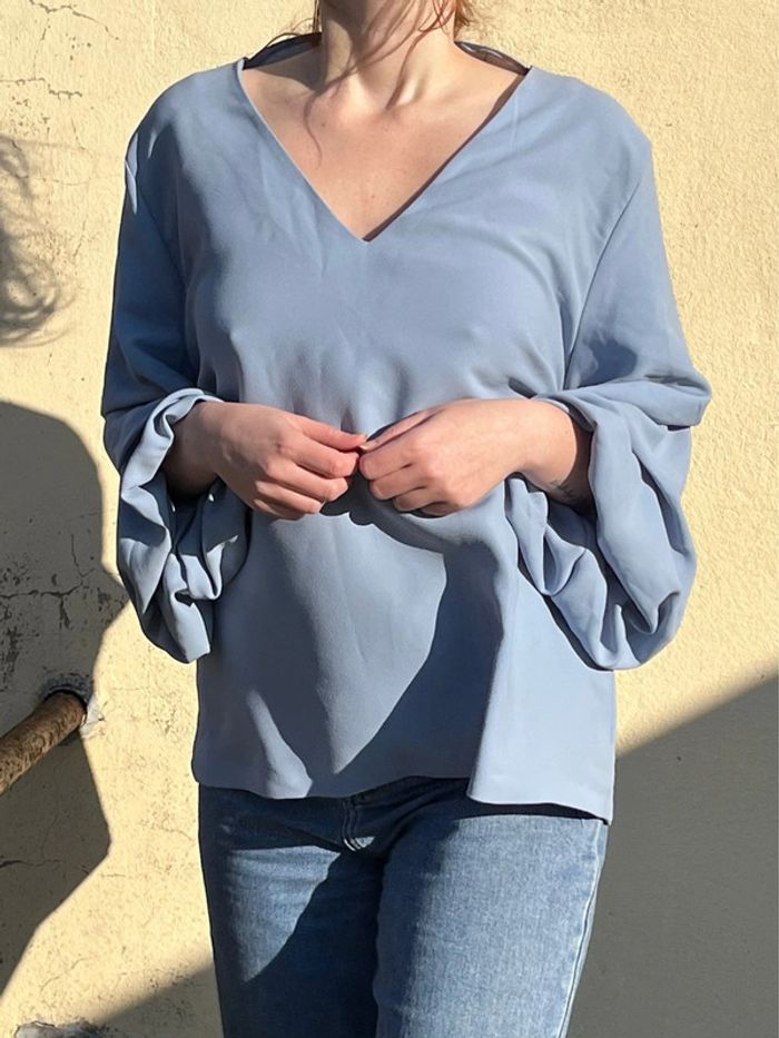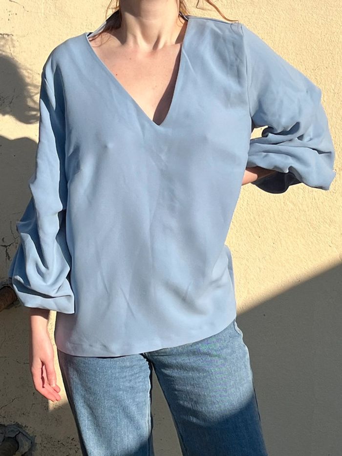 Haut blouse manches 3/4 bouffantes avec plies, plissés, coupe droite fluide, ample - décolleté col V. Couleur bleu clair ciel. Taille 46 - je porte du S/M et mesure 1,69m, rend grand sur moi, rendra mieux porté à la bonne taille. Marque : H&M - Style Vintage, y2k. Confortable, tissus fluide agréable, portable en toute saison - pour occasions ou tout les jours. Neuf, jamais porté.