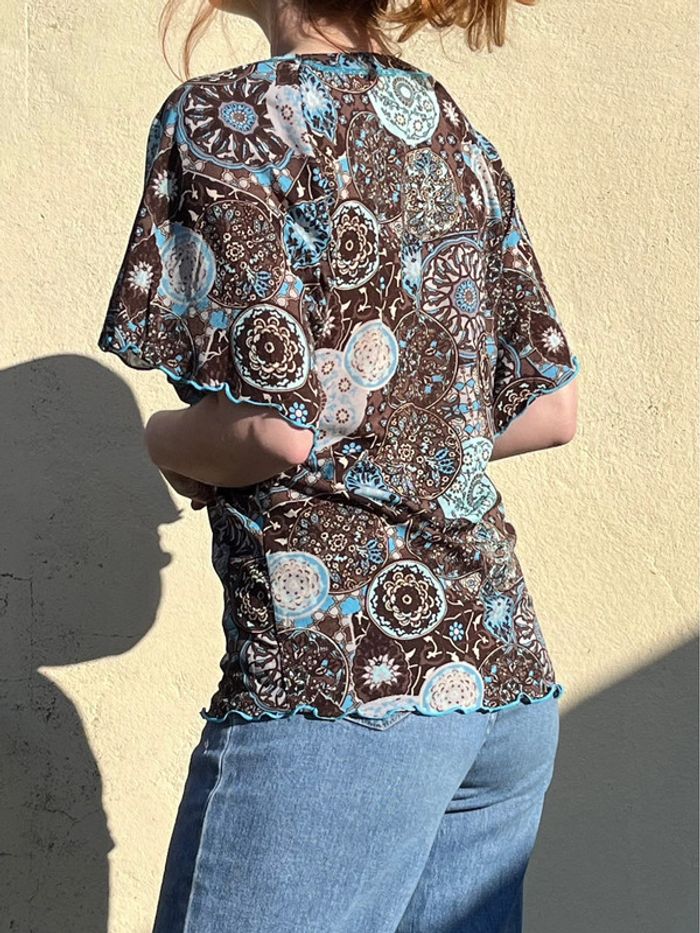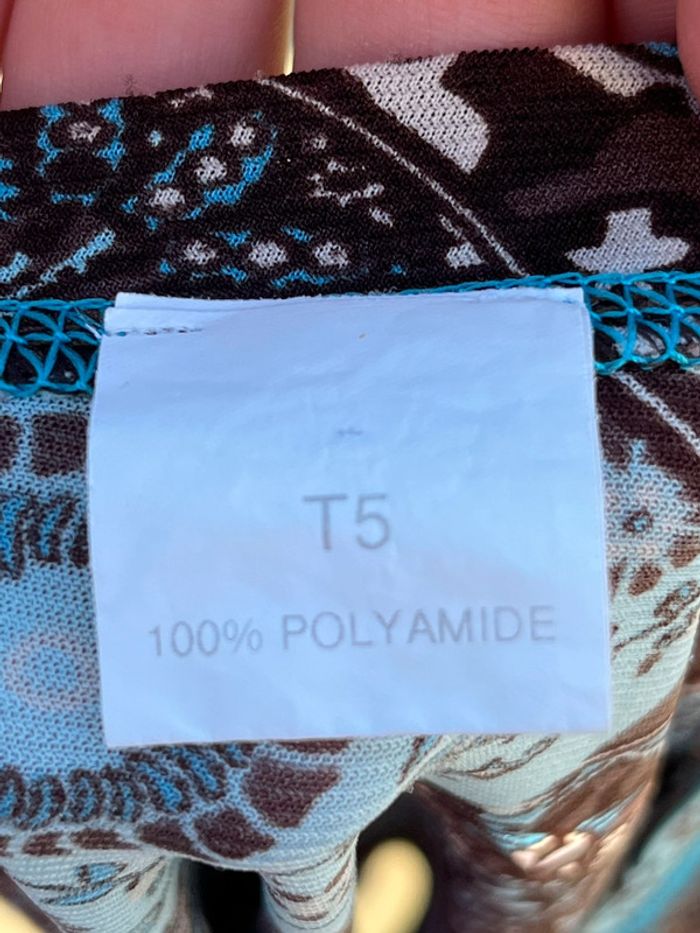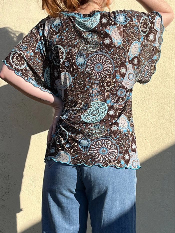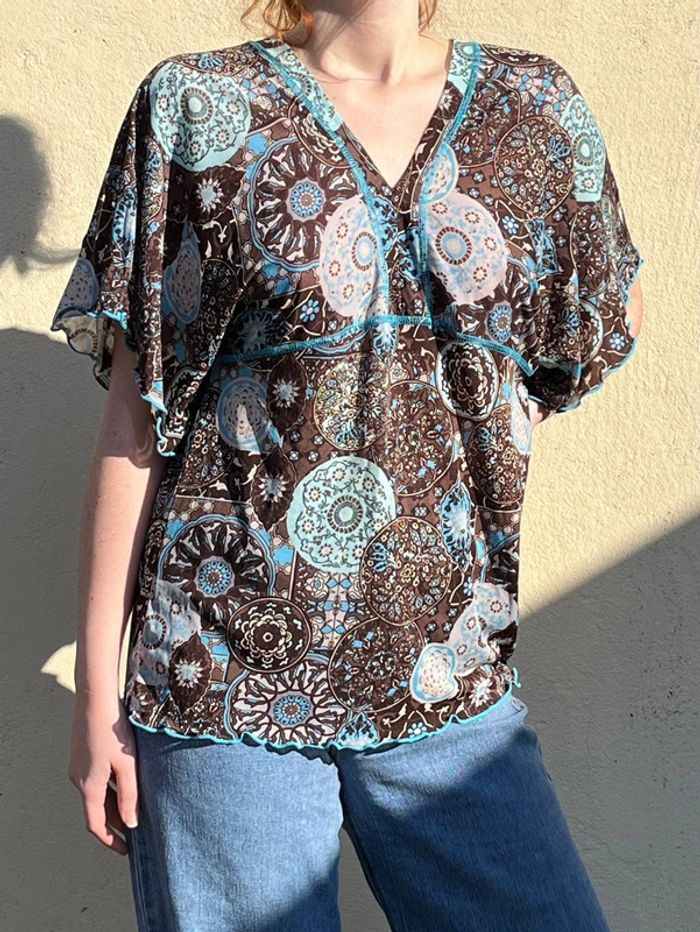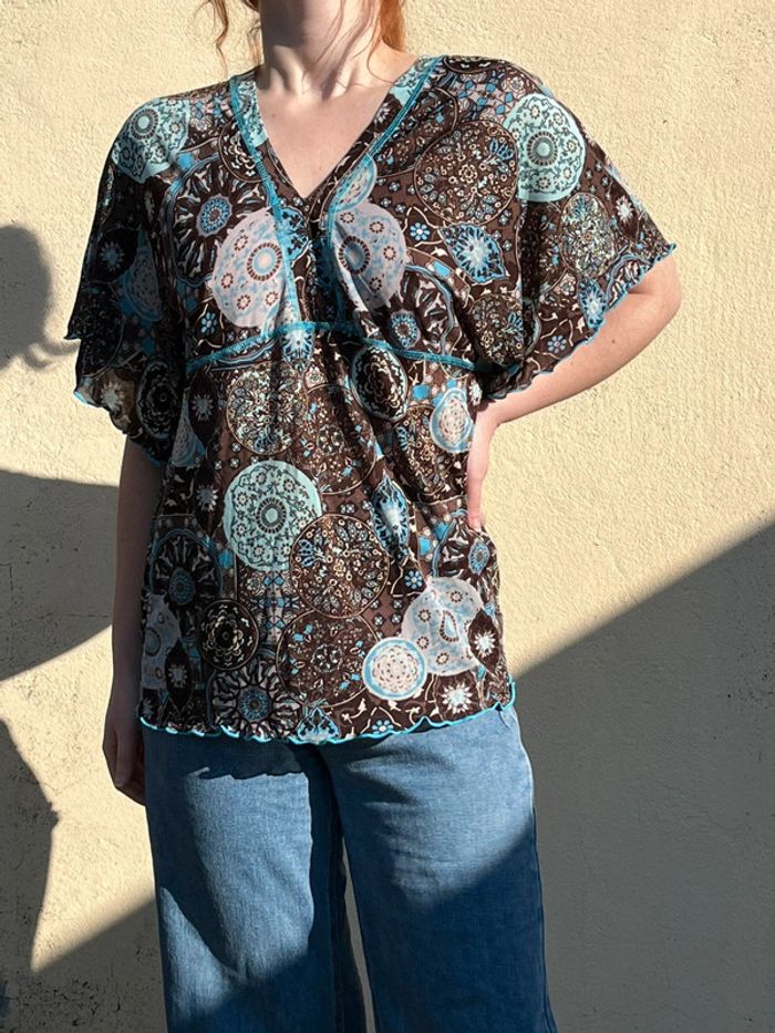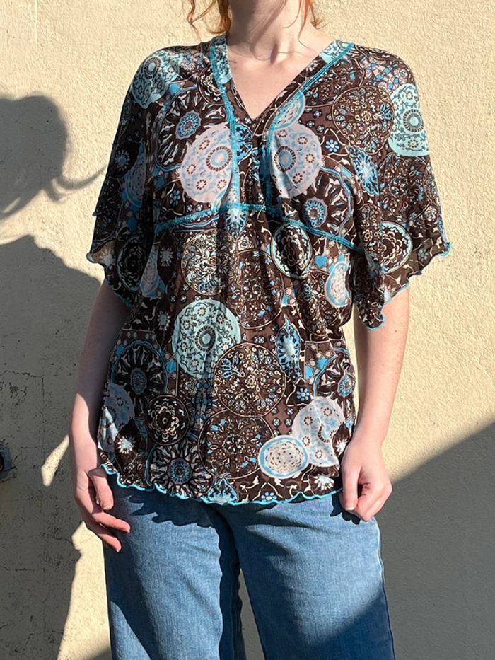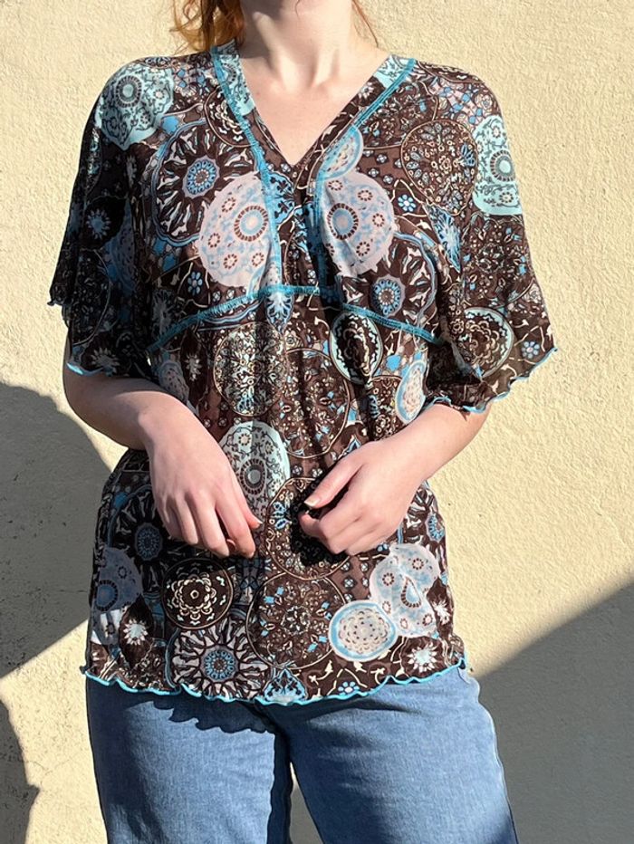 Haut t-shirt légèrement moulant avec manches fluides, décolleté col V - motifs mandalas cercles thème fleuris couleur marron, bleu turquoise et blanc crème. Coutures sous la poitrine et le décolleté couleur bleu turquoise - contours manches et bas, arrondie en vague couleur bleu turquoise Taille 5 correspond à un 44/46 - je porte du S/M et mesure 1,69m, rend grand sur moi, rendra mieux porté à la bonne taille. Pas de marque - Style Vintage, y2k. Confortable, tissus fluide agréable, portable en été ou mi-saison - pour occasions ou tout les jours. Très bon état général, aucun signe d'usure. Porté quelques fois.