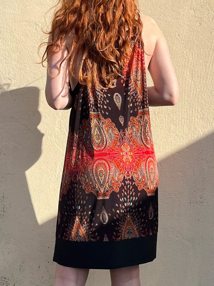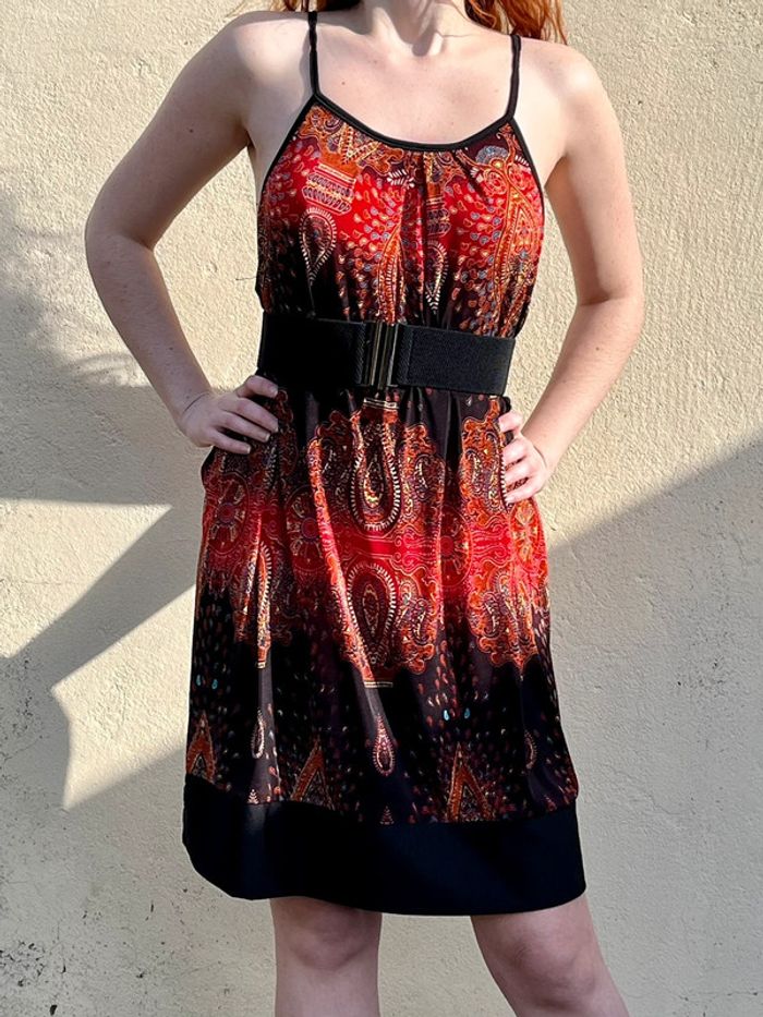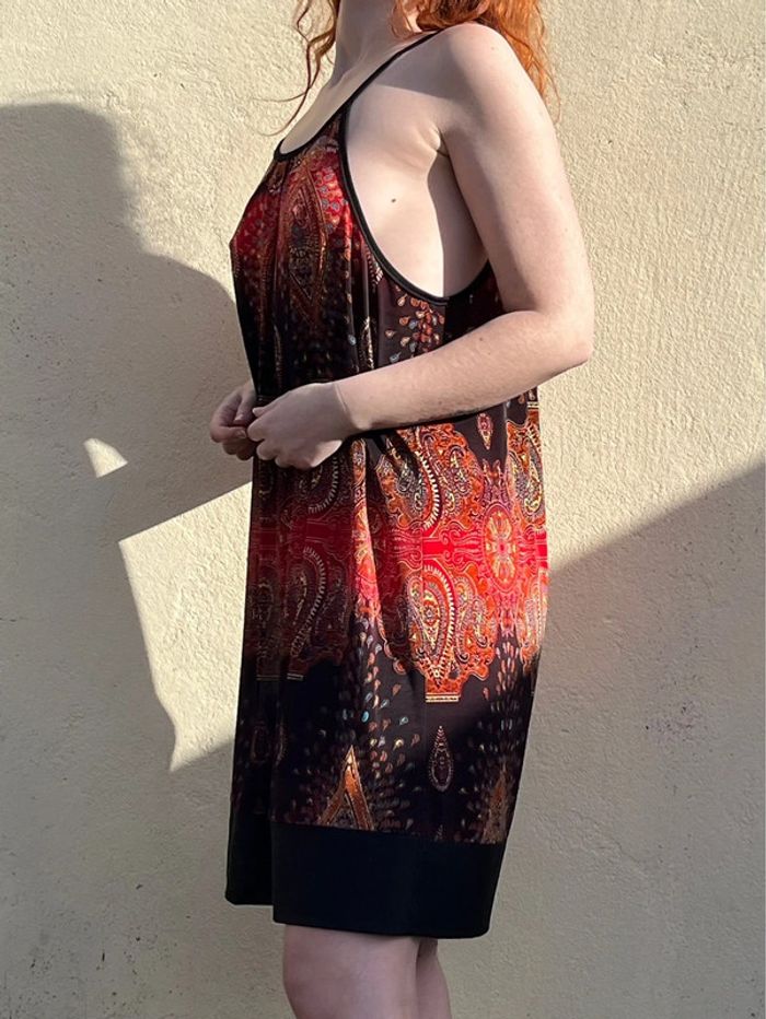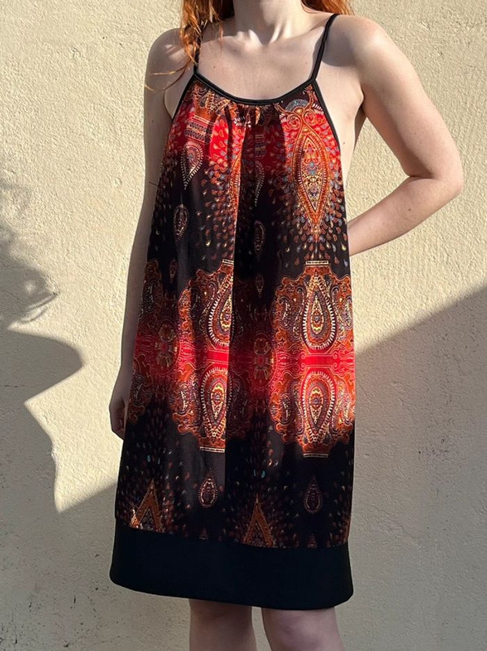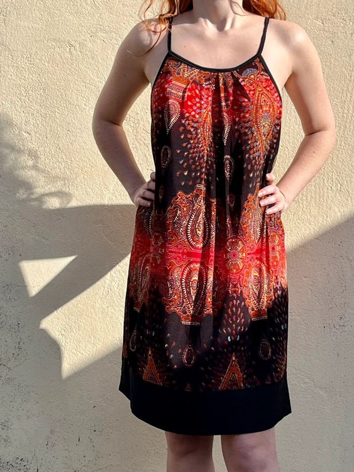 Robe midi (arrive juste au dessus des genoux) sans manches avec bretelles fines, coupe droite fluide ample - décolleté col rond et décolleté beaucoup plus large sur les côtés. Motifs géométriques ou fleurs abstraites multicolores, couleur dominante rouge et noir avec touches de bordeaux, orange, jaune et bleu turquoise. S'enfile - à l'arrière sous le cou, 2 ficelles fils à attacher en noeud papillon. /!\ Ceinture non incluse /!\ Pas d’étiquettes de taille - je porte du S/M, mesure 1,69m, fait du 95B - rend très large sur moi, rendrait mieux porté à la bonne taille. Devrait correspondre à un 44 ou 46. Pas de marque - Style Vintage, y2k. Confortable, tissus fluide agréable, portable en été mi-saisons - pour occasions ou tout les jours. Très bon état général, aucun signe d'usure. Porté peu de fois.