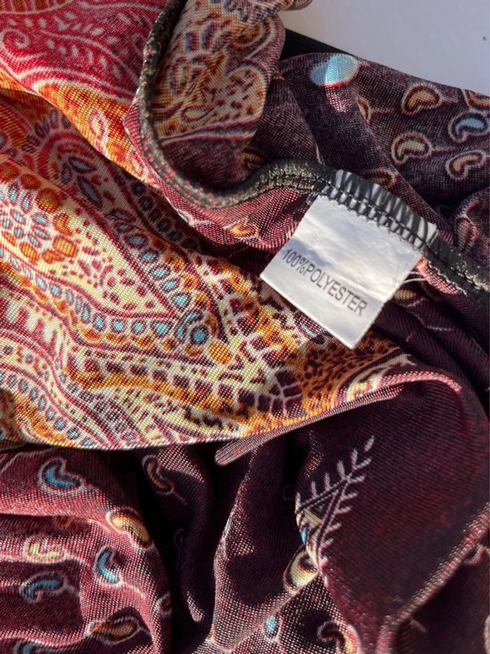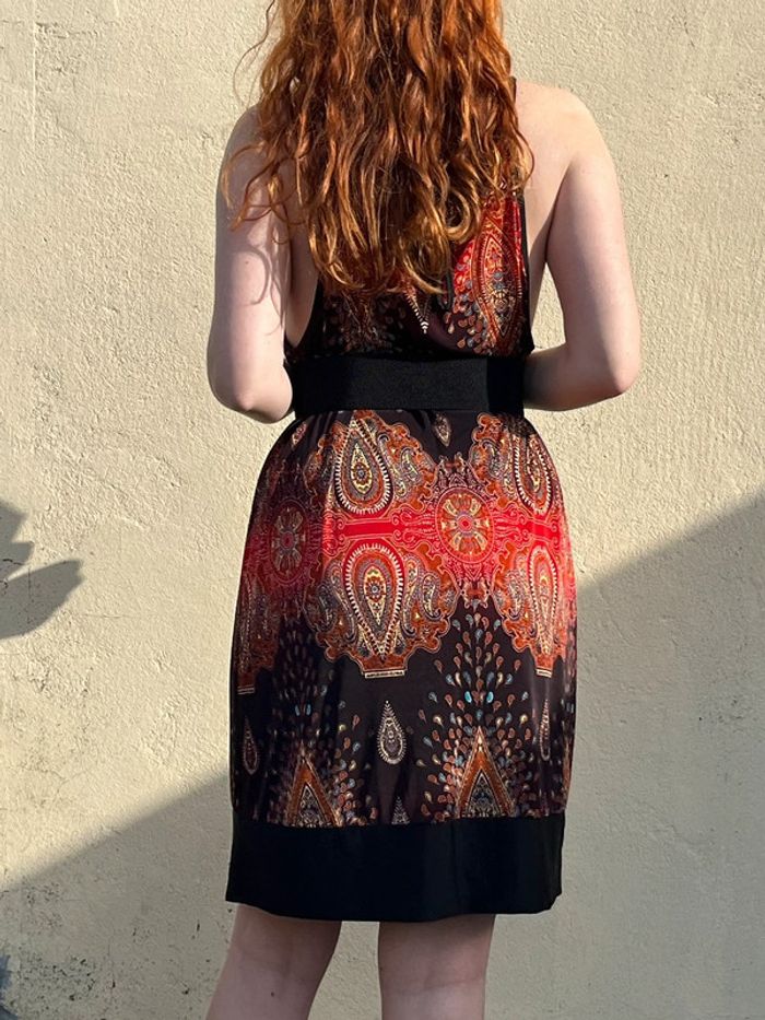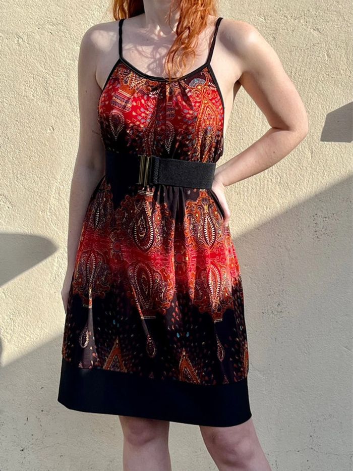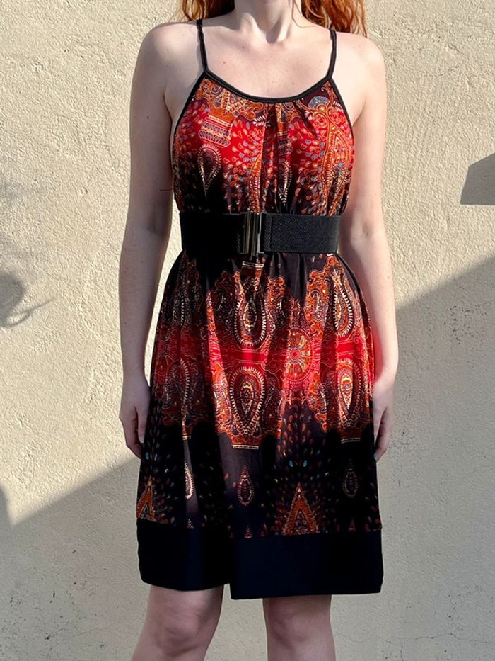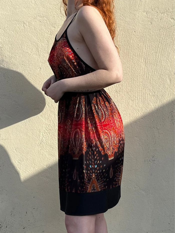 Robe midi (arrive juste au dessus des genoux) sans manches avec bretelles fines, coupe droite fluide ample - décolleté col rond et décolleté beaucoup plus large sur les côtés. Motifs géométriques ou fleurs abstraites multicolores, couleur dominante rouge et noir avec touches de bordeaux, orange, jaune et bleu turquoise. S'enfile - à l'arrière sous le cou, 2 ficelles fils à attacher en noeud papillon. /!\ Ceinture non incluse /!\ Pas d’étiquettes de taille - je porte du S/M, mesure 1,69m, fait du 95B - rend très large sur moi, rendrait mieux porté à la bonne taille. Devrait correspondre à un 44 ou 46. Pas de marque - Style Vintage, y2k. Confortable, tissus fluide agréable, portable en été mi-saisons - pour occasions ou tout les jours. Très bon état général, aucun signe d'usure. Porté peu de fois.