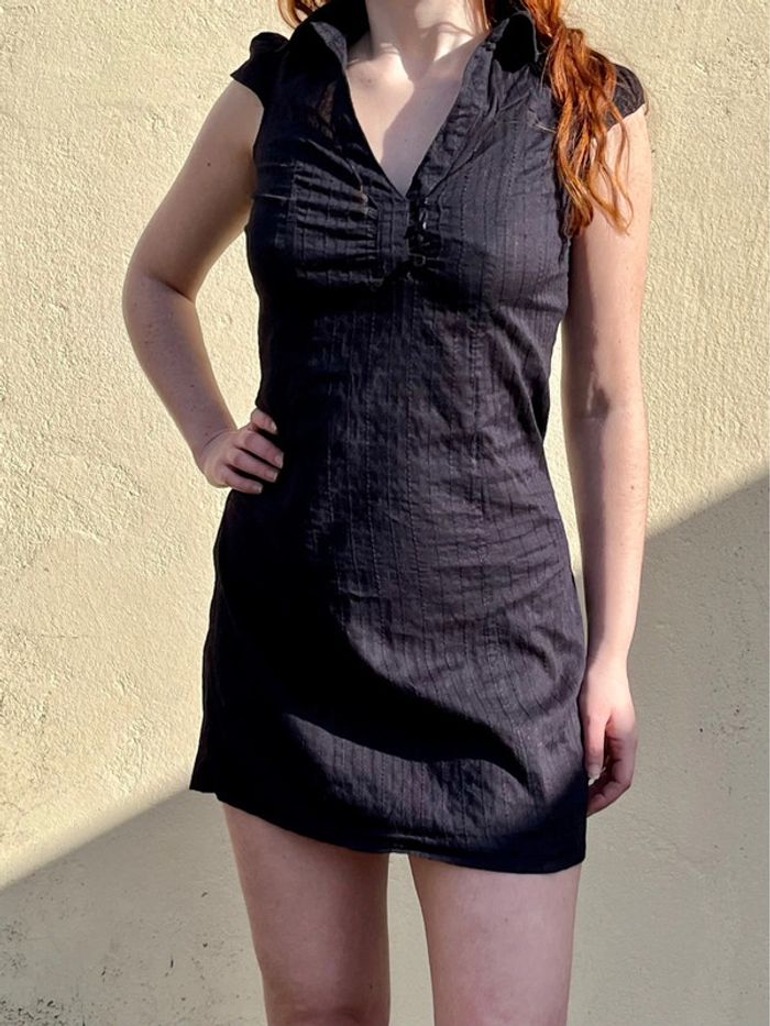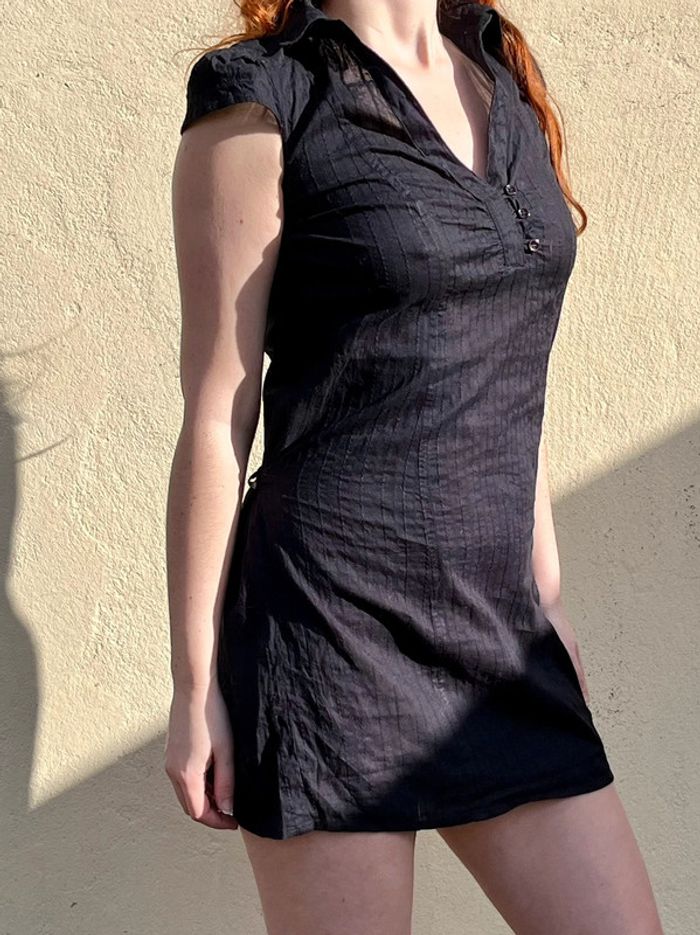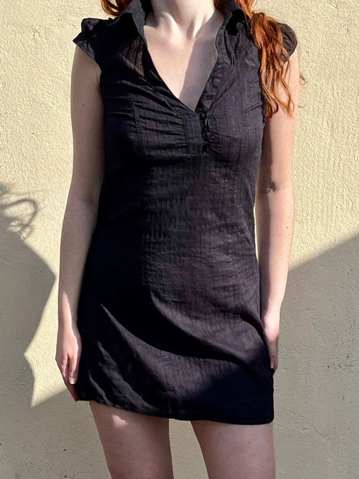 Robe courte petites manches courtes froufrous style épaulettes, moulante cintré sur haut et légèrement évasée ample sur le bas. Coutures lignes verticales qui met en avant la silhouette, décolleté col V et type chemise avec 3 boutons noirs (1 de rechange cousu sur l’étiquette) - couleur noir. S'enfile - à l'arrière 2 ficelles fils à attacher en noeud intégrées. Taille S - je porte du S/M, mesure 1,69m, fait du 95B, un peu petit et court pour moi. Marque : Jennyfer - Style Vintage, y2k Confortable, tissus agréable, portable en toutes saisons - pour occasions ou tout les jours. Très bon état général, aucun signe d'usure. Porté quelques fois.