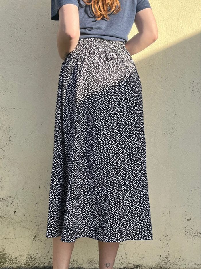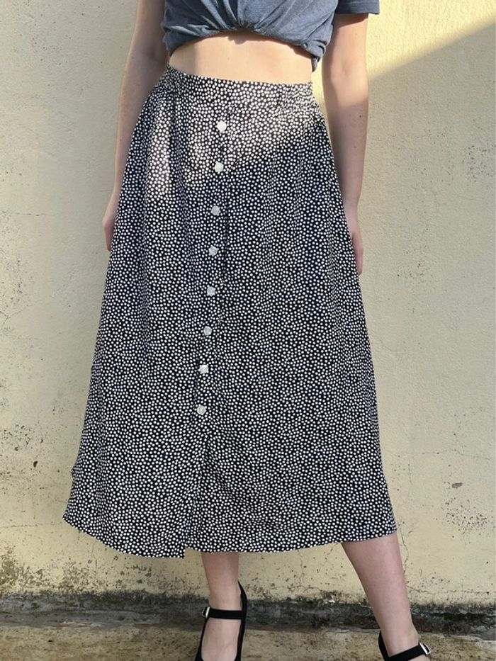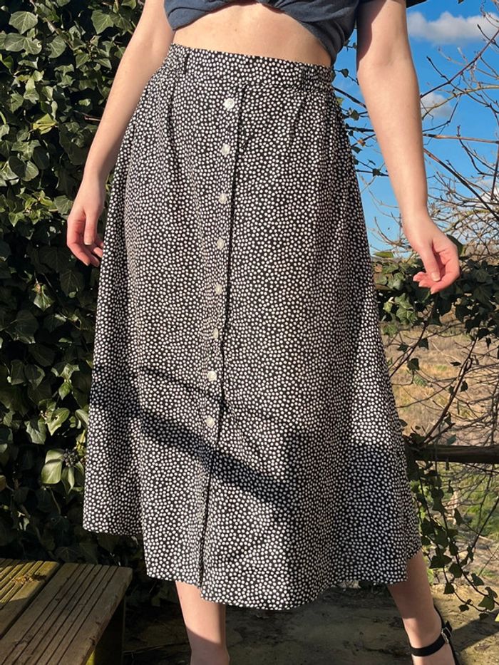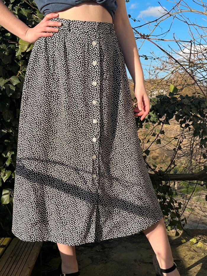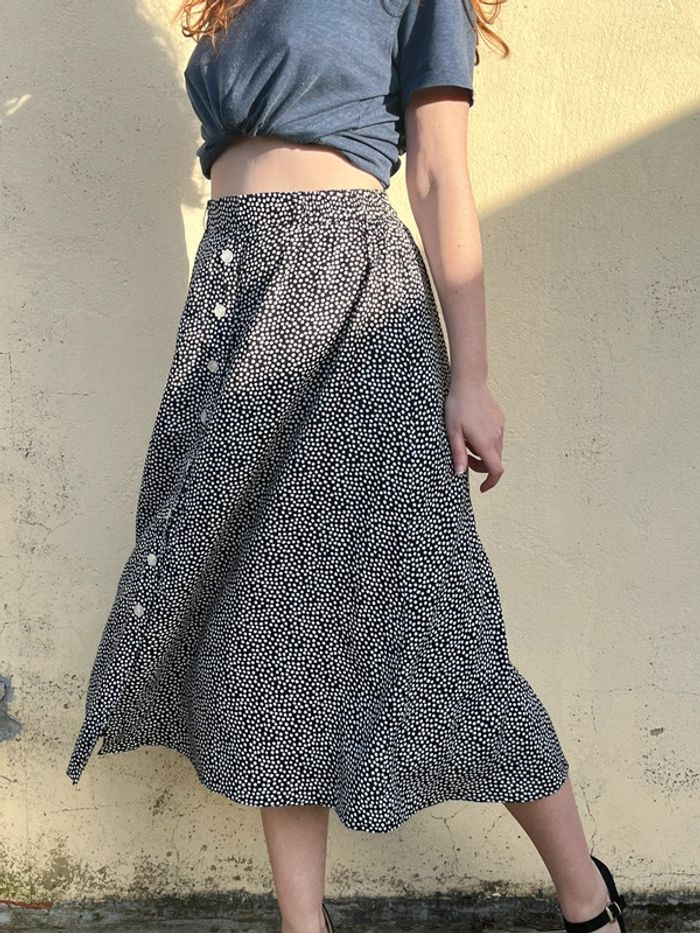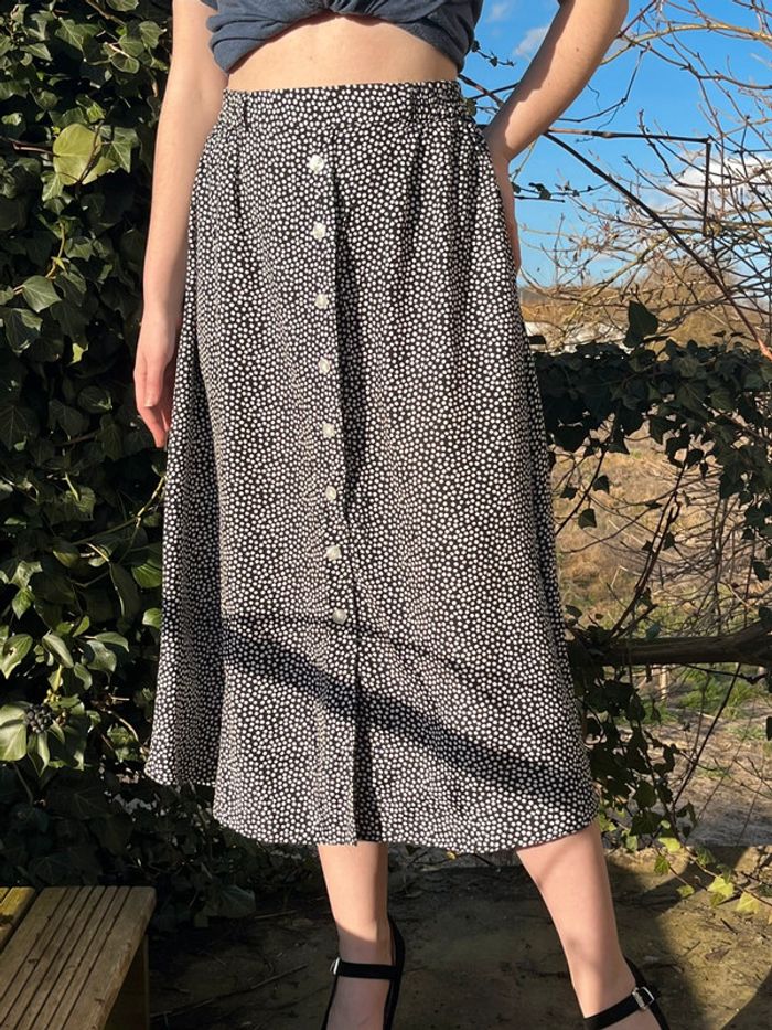 Jupe mi-longue taille haute, évasée / ample tissu qui retombe, effet plies sur le haut avec 8 boutons blanc au centre - motifs petits points rond blanc sur fond noir. Taille 38/40 - je porte du S/M et mesure 1,69m, taille très bien, s’ajuste car élastique à la taille. Pas de marque - Style Vintage, y2k. Confortable, tissus léger et agréable, portable en mi-saison ou été - pour tout les jours. Très bon état général, aucun signe d'usure. Porté quelques fois.