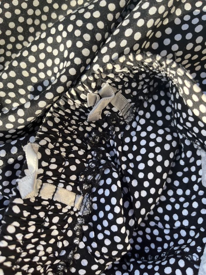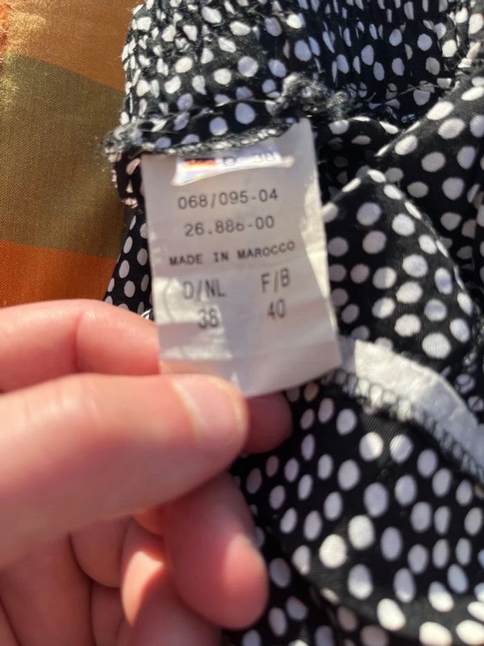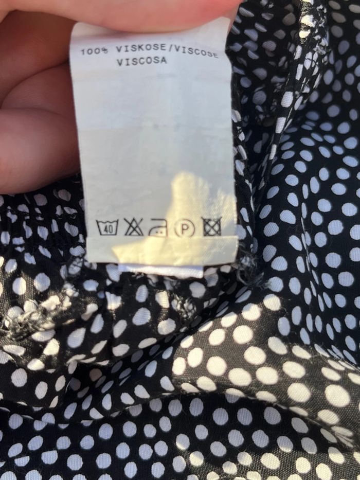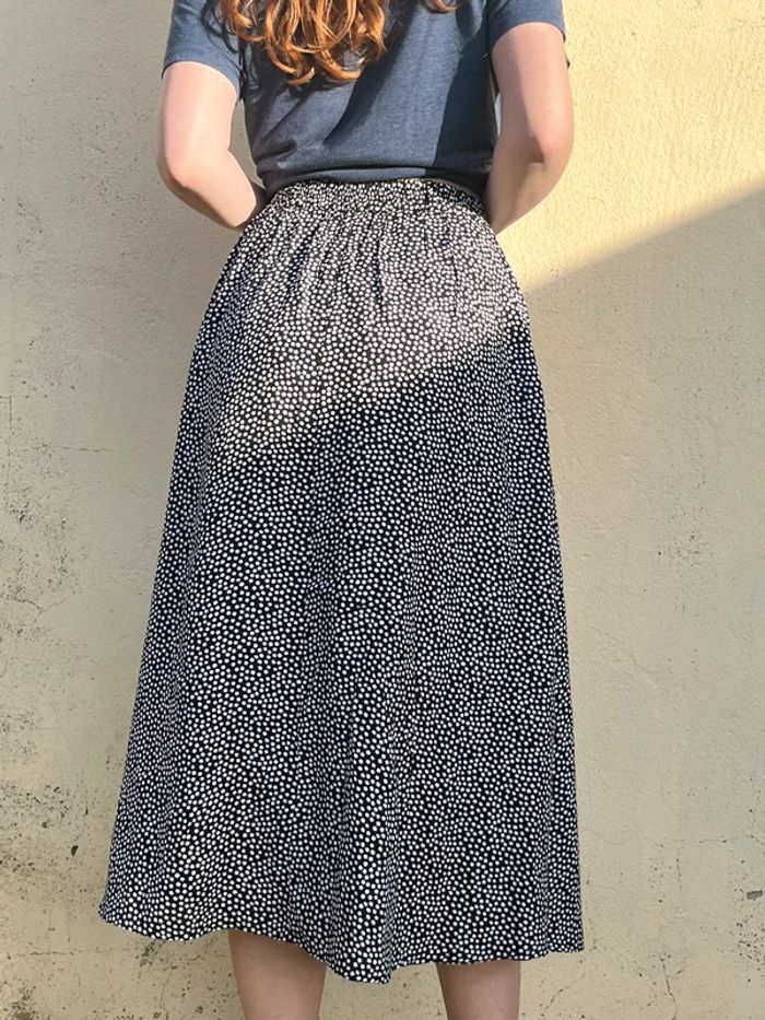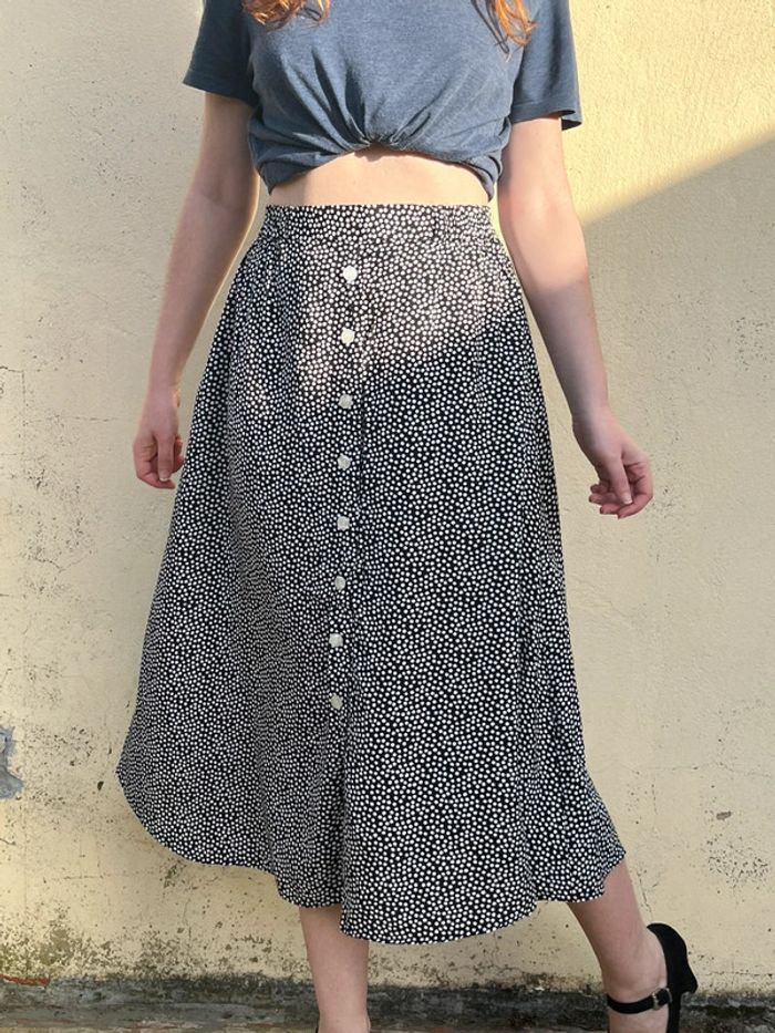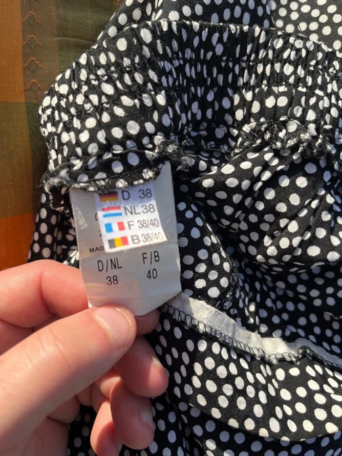 Jupe mi-longue taille haute, évasée / ample tissu qui retombe, effet plies sur le haut avec 8 boutons blanc au centre - motifs petits points rond blanc sur fond noir. Taille 38/40 - je porte du S/M et mesure 1,69m, taille très bien, s’ajuste car élastique à la taille. Pas de marque - Style Vintage, y2k. Confortable, tissus léger et agréable, portable en mi-saison ou été - pour tout les jours. Très bon état général, aucun signe d'usure. Porté quelques fois.