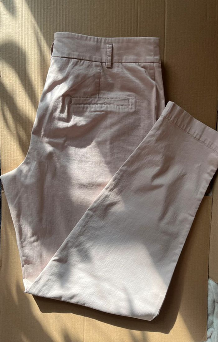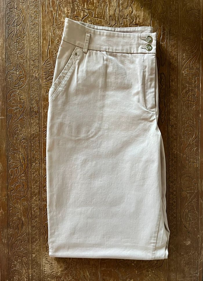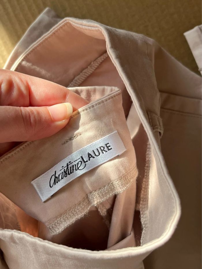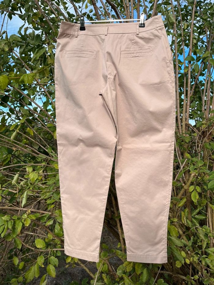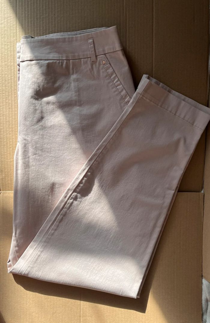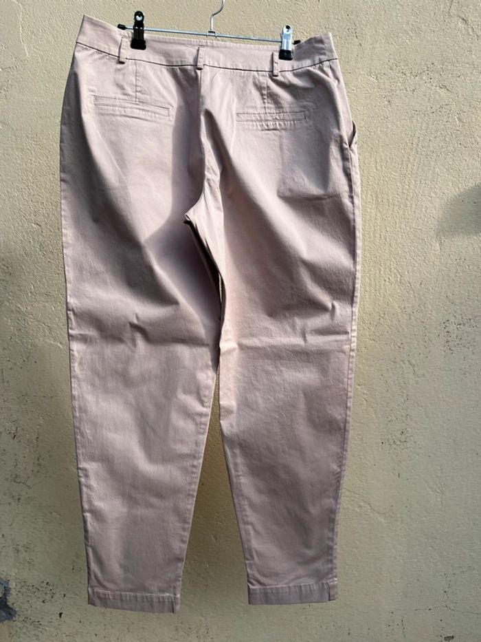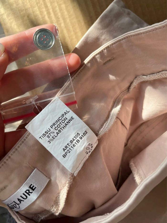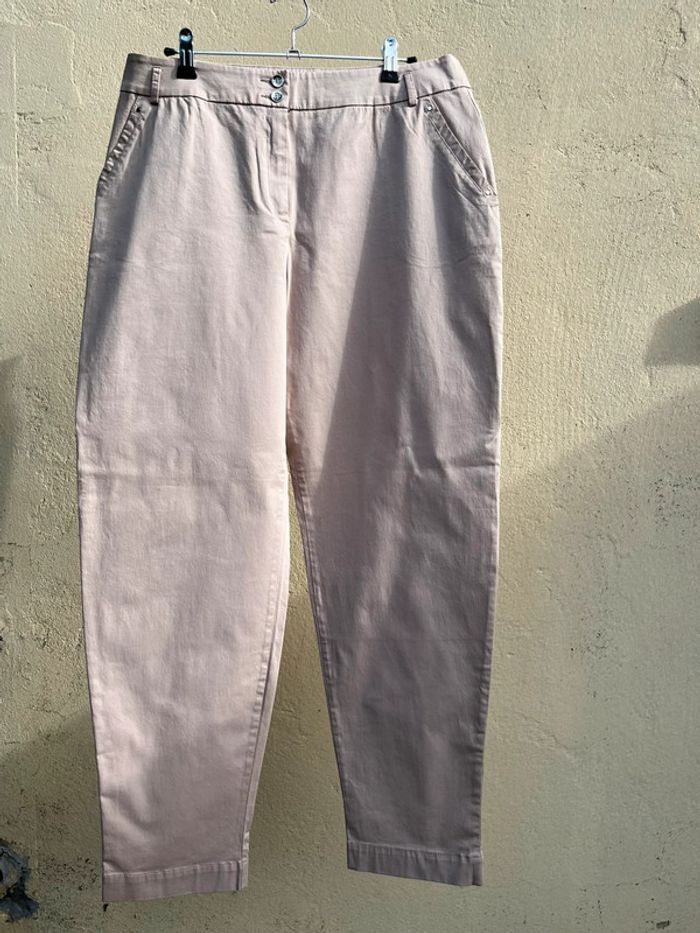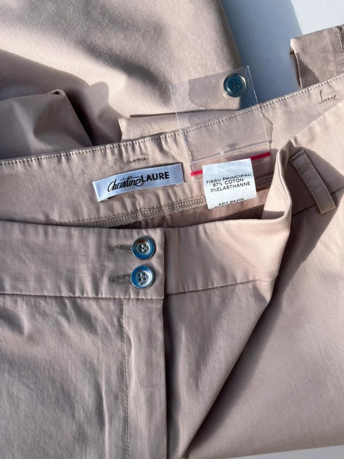 Pantalon court en coton, coupe semi droite slim couleur rose pale satiné légèrement vers le beige. Avec fermeture éclair et 2 boutons métalliques argenté - un de rechange dans le sachet. 2 poches à l’avant sur les côtés et 2 fausses à l’arrière - 2 petits strass paillettes sur les poches de chaque côté. Taille 44 Mesures prises à plat : Du bouton à l'entre-jambe : 29 cm Taille : 42 cm Longueur à partir des hanches : 101 cm Longueur à partir de l'entre jambes : 74 cm Marque : Christine Laure Très bon état général, jamais porté.
