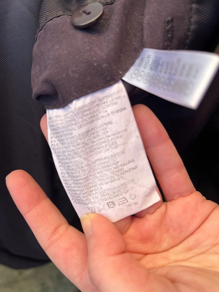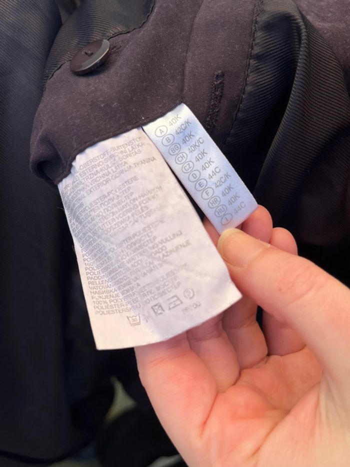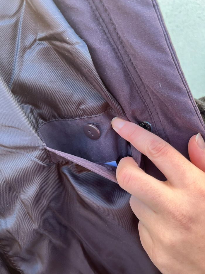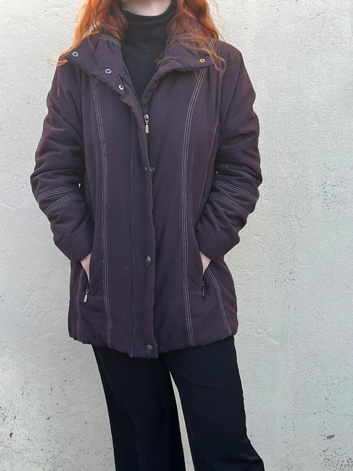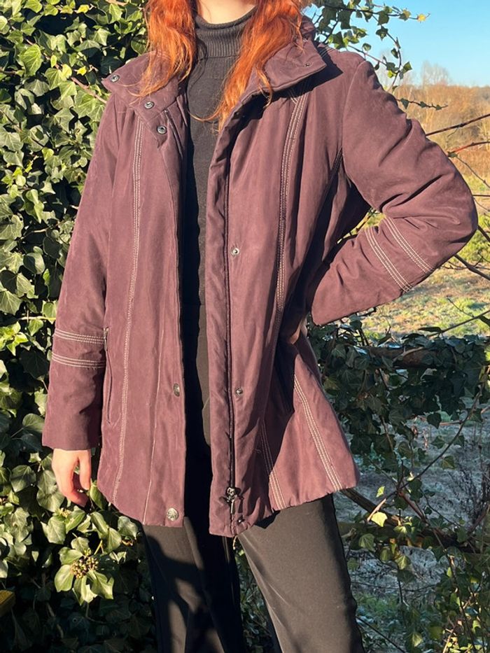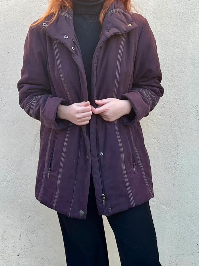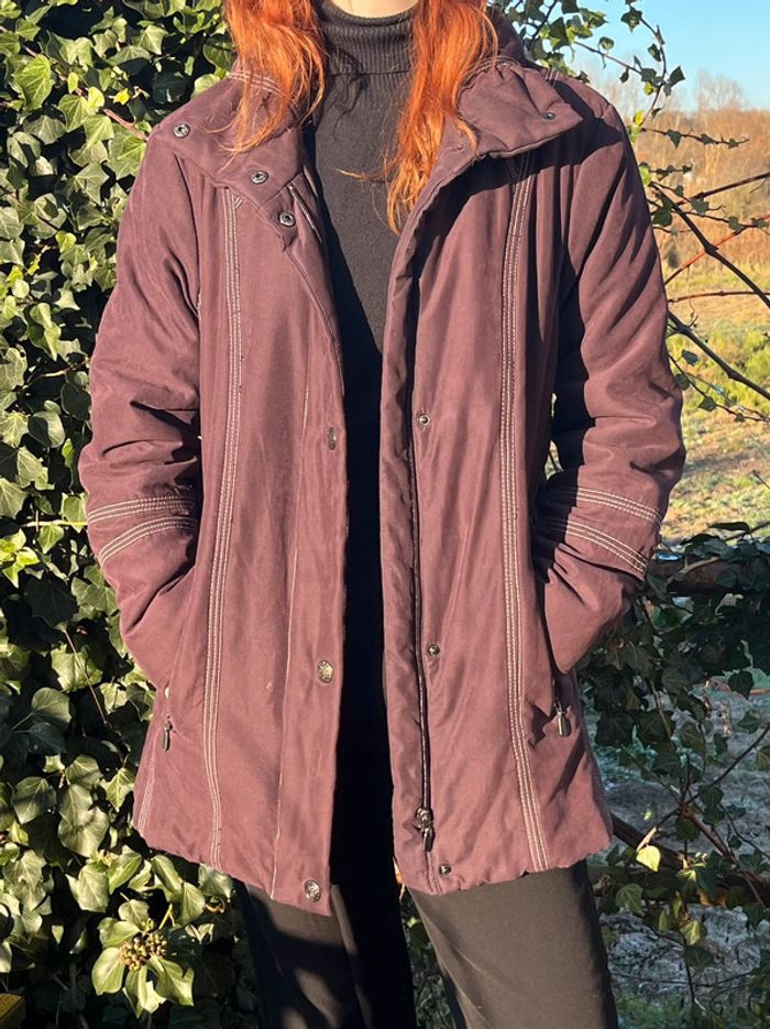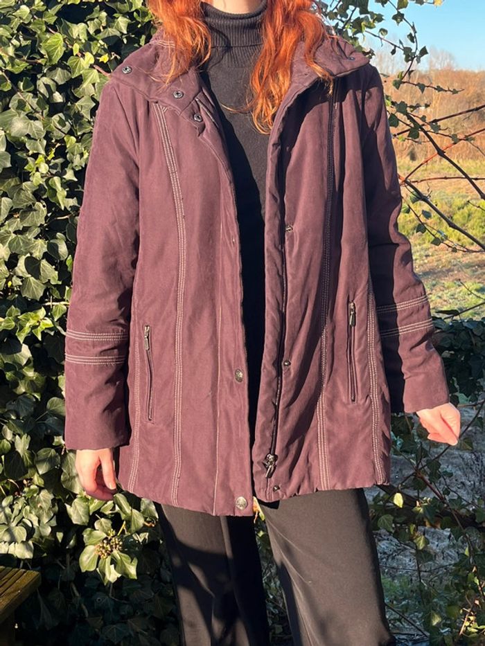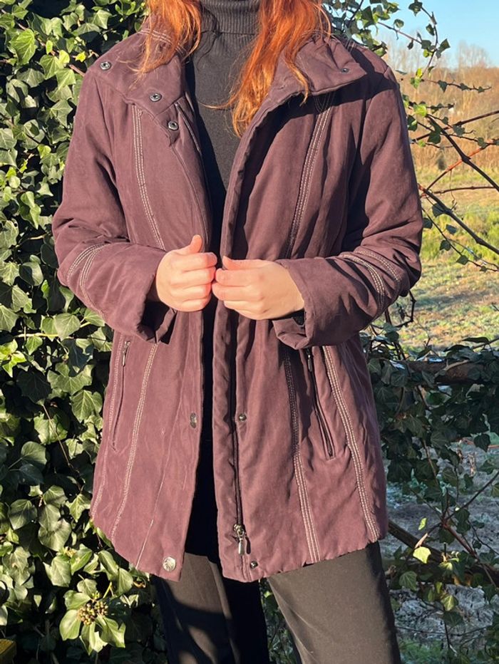 Manteau veste type doudoune légère matelassée chaude mi-longue - couleur violet prune vers le bordeaux (ne donne pas la même couleur au soleil et à l'ombre). Légèrement cintré avec lignes coutures en blanc qui mettent en avant la silhouette. Fermeture principal à zip (fermeture éclair) métallique et 4 boutons pressions métallique argenté + 2 boutons au col - col roulé 2 poches sur les côtés avec fermeture éclair métallique et 1 intérieure avec fermeture bouton couleur violet. Taille 42 - Je porte du S/M, elle est très légèrement grande pour moi, peut aussi convenir à un L. Confortable, effet cintré - Matière douce type velours lisse. Marque : CANDA collection at C&A Très bon état général, porté quelques fois. Aucun signe d’usure.