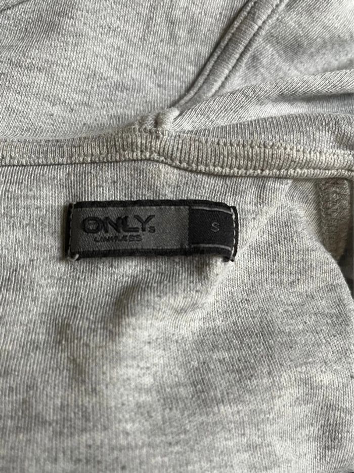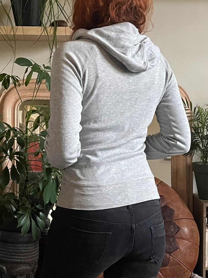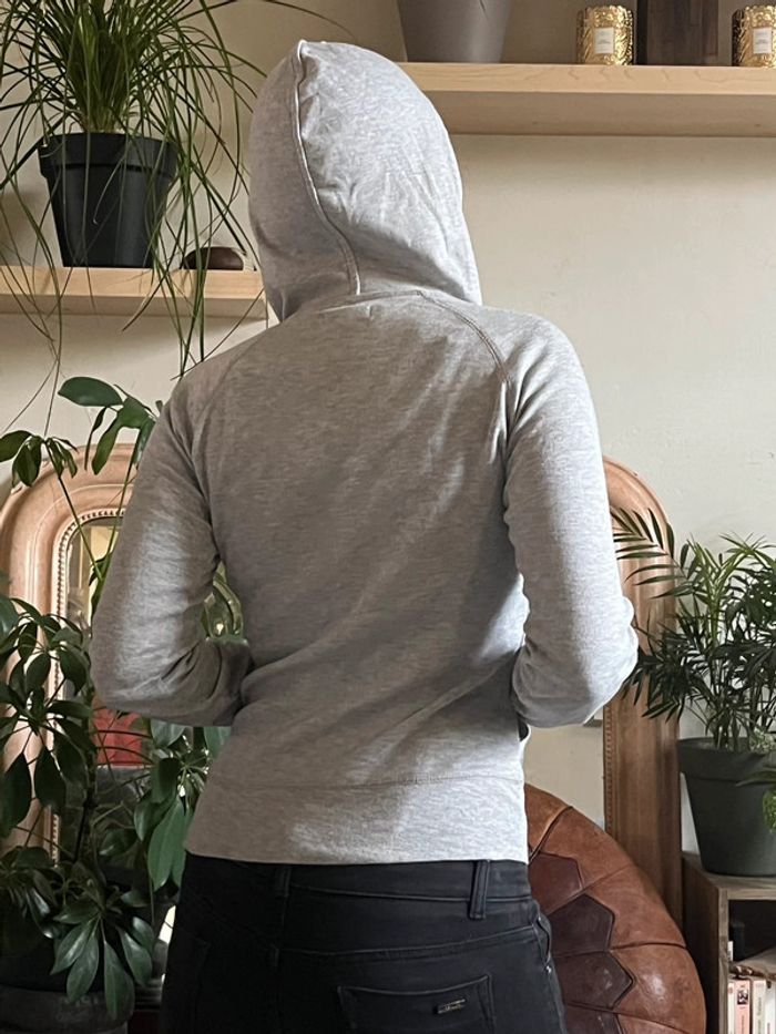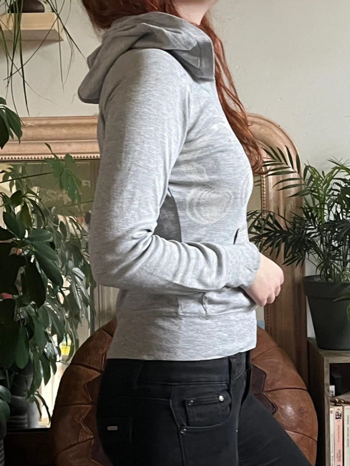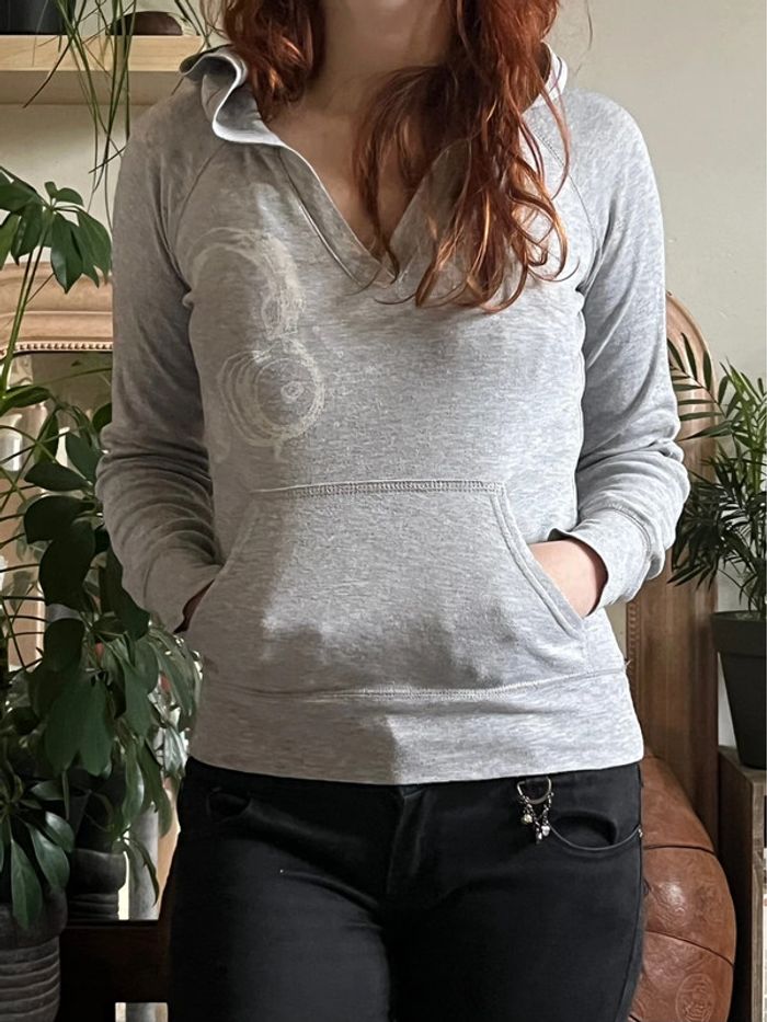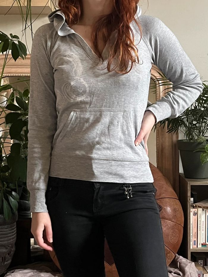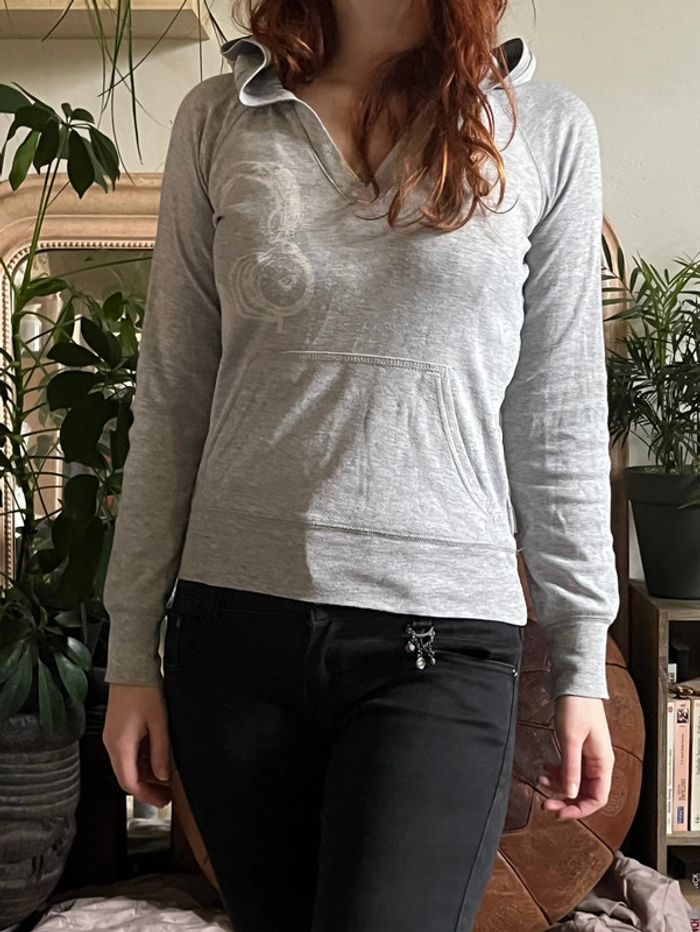 Haut sweat manches longues à capuche et poche centrale - décolleté col V. Bouts des manches et bas du pull plus resserrés. - motif casque écouteur sur un côté. Couleur gris clair et blanc. Taille S - je porte du S/M, taille bien, effet fluide et légèrement cintré moulant. Confortable, tissu léger et agréable. Marque : Only - Style Vintage yk2 Très bon état général, pas de signe d'usure. Porté quelques fois.