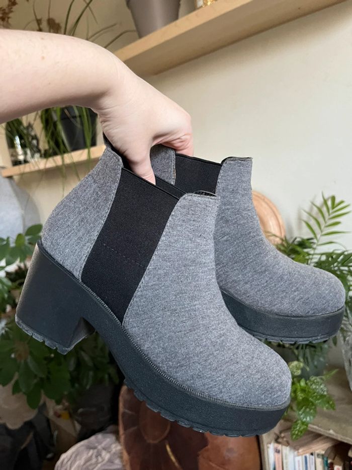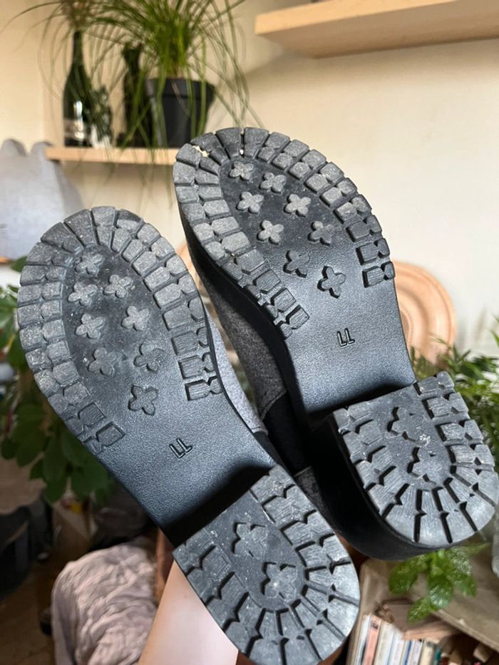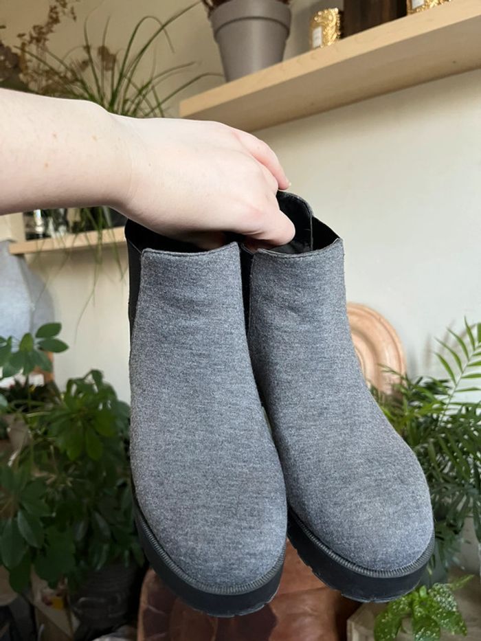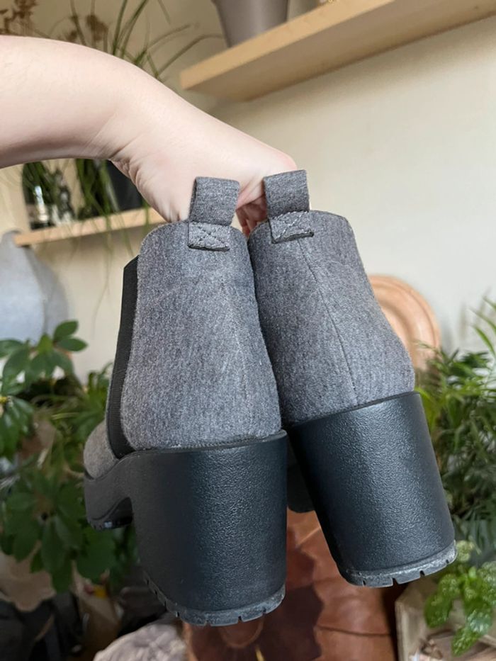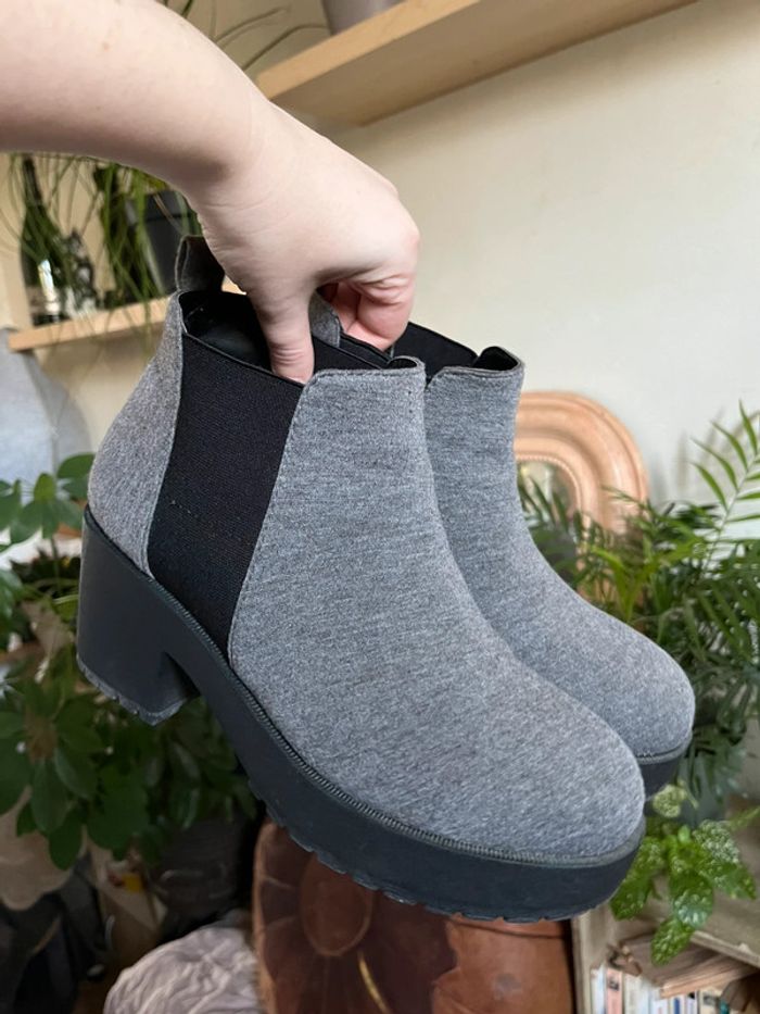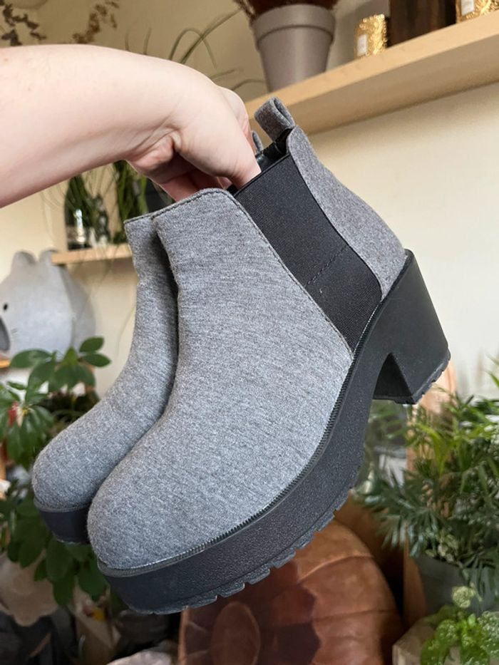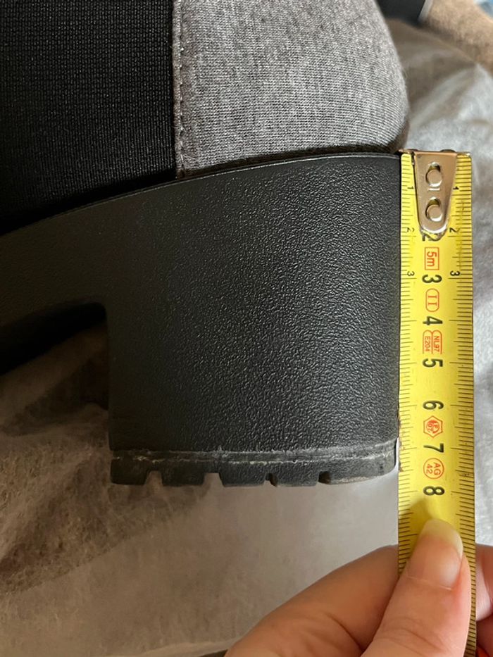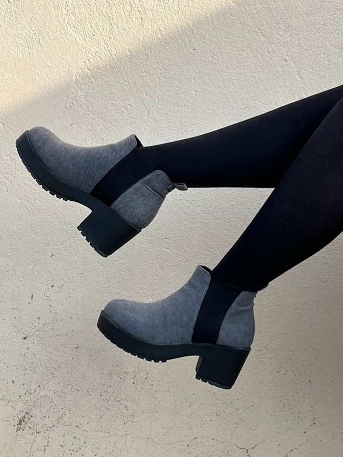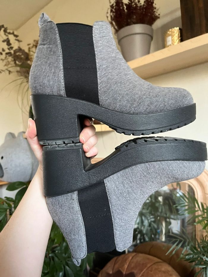Chaussures bottines à talons en tissus qui s’enfile. Parties extérieures et parties intérieures avec élastiques couleur noir. Couleur gris et noir - Talon et petite plateforme couleur noir. Taille 39 - je chausse du 38 2/3, 39, taille un peu grand pour moi, je les portais avec une semelle à l’intérieur - pour des pieds ou chevilles plus large. Talon de 7,5 cm et plateforme de 3 cm. Marque : Closshi - Style Vintage yk2 Très bon état général, porté 2x Signe d'usure : très légères traces (voir détails en photos)