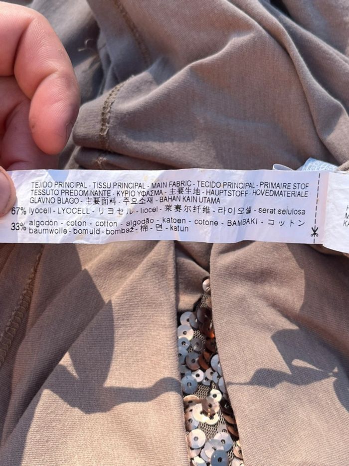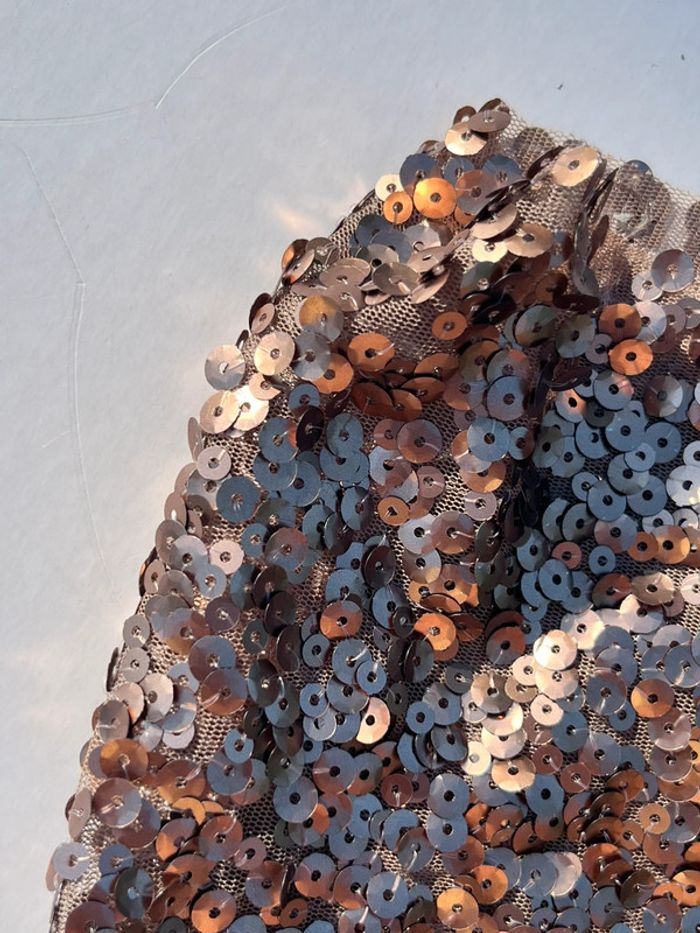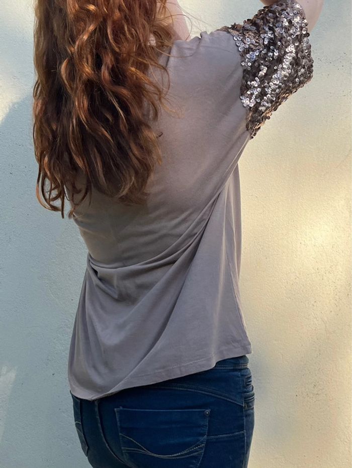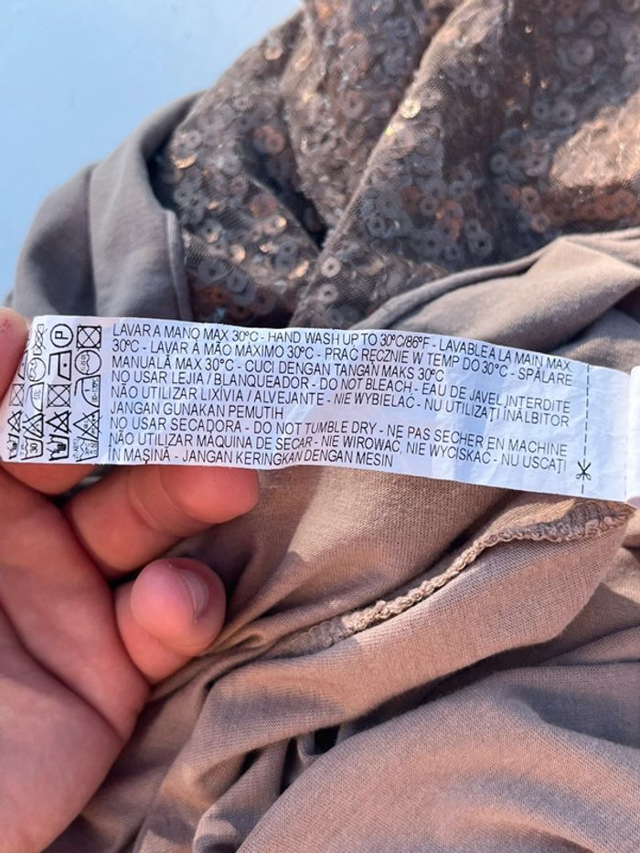 Haut t-shirt manches courtes avec paillettes sequins - coupe droite ample et fluide, légèrement long, col rond. Couleur marron clair avec reflets dorée bronze. Taille XL - je porte du S/M, mesure 1,69m et fait du 95B, rend plus large sur moi. Marque : Zara collection W&B - Style Vintage. Matière : Polyester - Lyocell - Coton Confortable, tissus agréable, portable en toutes saisons, pour occasion ou tout les jours. Très bon état, porté peu fois. Aucun signe d’usure.