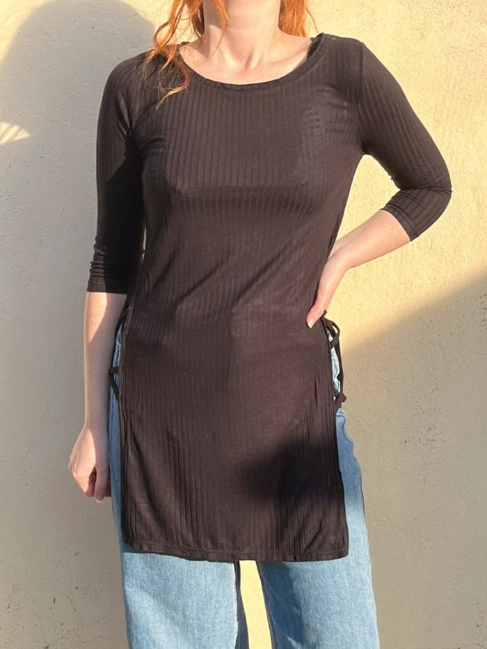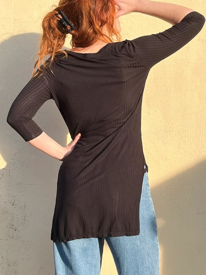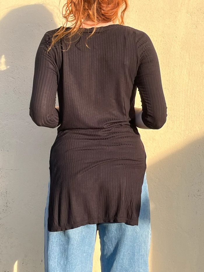 Haut long manches 3/4 (sous le coude) ou robe avec grandes fentes sur les côtés et croisement (2 croix de chaque côté) - coupe droite long légèrement moulant, col rond. Couleur noir tissu côtelé (bandes verticale) Aucune étiquettes - je porte du S/M, mesure 1,69m et fait du 95B, correspond à un S/M, est légèrement serré et court pour moi. Style Vintage, y2k. Confortable, tissus agréable, portable en haut en toutes saisons avec un bas ou en été en robe avec un maillot en dessous. Neuf, n'a jamais été porté. Aucun défauts ou usure.
