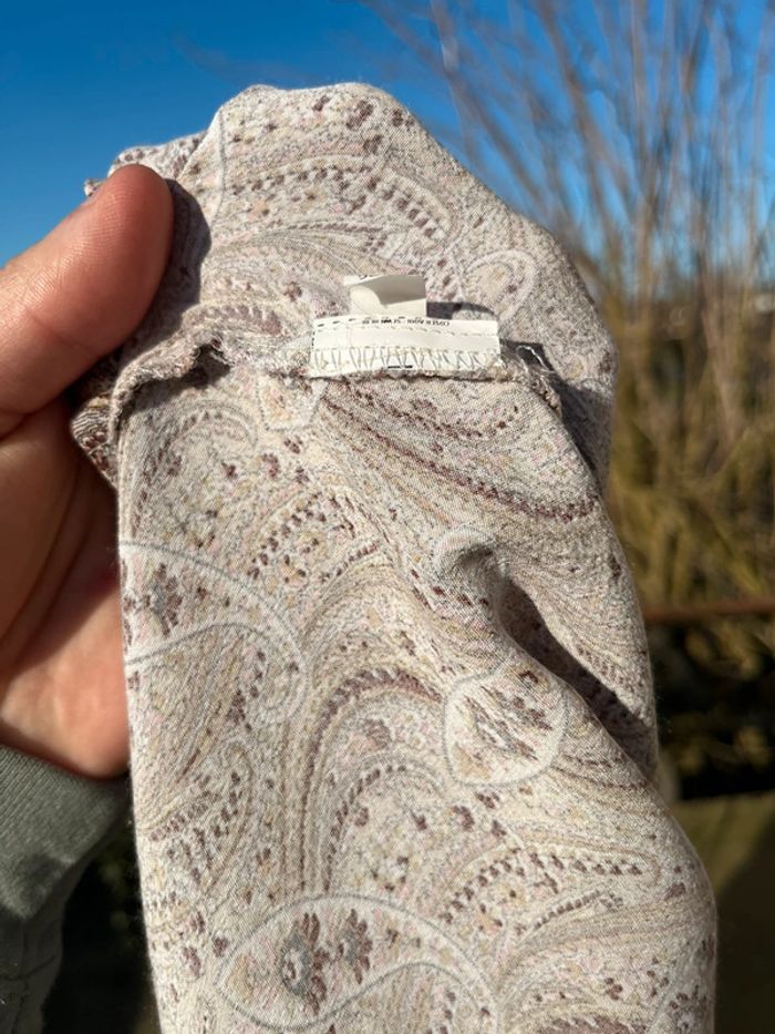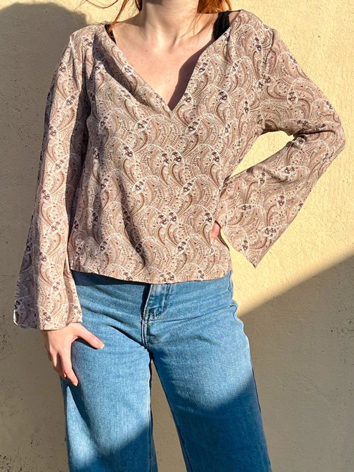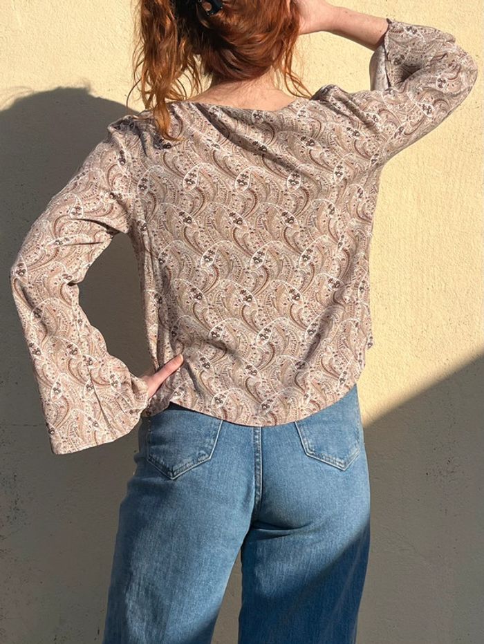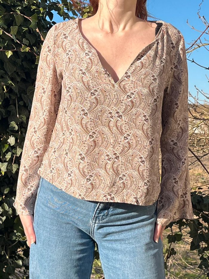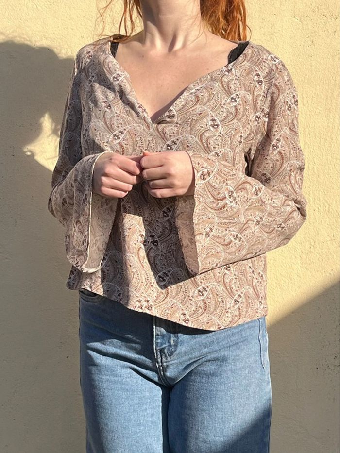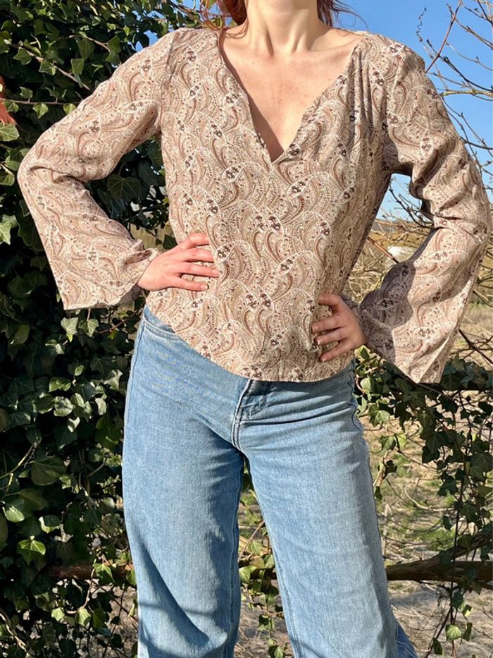 Haut blouse manches longues larges évasées, coupe droite fluide courte, bords arrondis - décolleté col V, s'enfile. Couleur fond crème avec motifs nature fleurie en beige, marron, marron foncé et touche de rose clair saumon. Taille M - taille très bien (je porte du S/M, mesure 1,69m et fait du 95B). Marque : MNG suit collection - mango - Style Vintage, y2k. Confortable, tissus fluide agréable, portable en toute saison. Pour tout les jours ou occasions. Étiquettes des matières coupées. Très bon état général, porté quelques fois. Aucun signe d’usure.