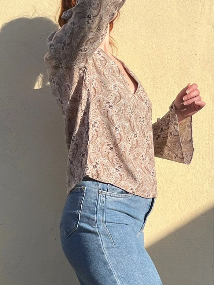 Blouse mi-courte évasée, manches longues amples et col V - fleuris marron et beige