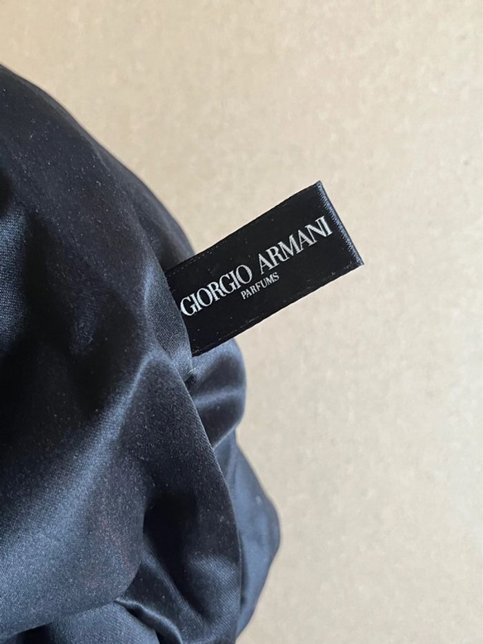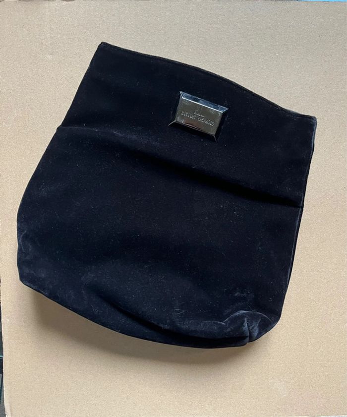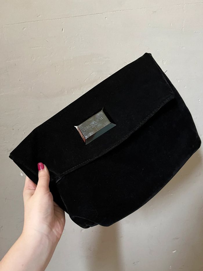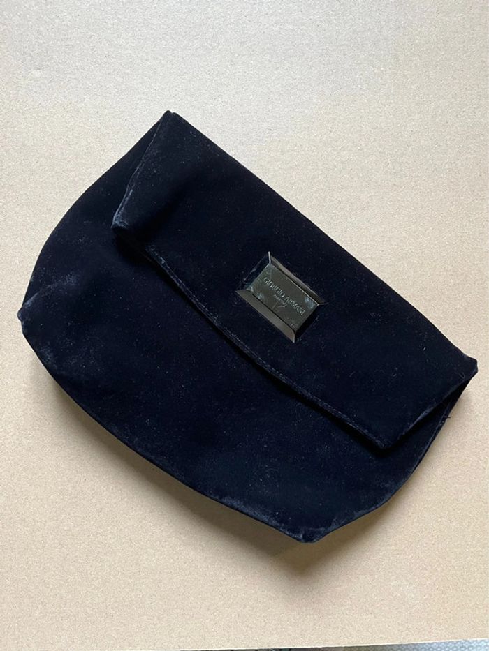 Pochette / sacoche noir velour touché tout doux. Girogio Armani Parfums. Peut être utilisé comme sac à main ou comme pochette de rangement. Fermeture à rabat et bouton aimanté dissimulé. Dimensions : Hauteur fermé 21 cm, ouvert 27 cm - Largeur de la base 24 cm et 31 cm au max - Épaisseur de la base 10 cm Utilisé quelques fois, très bon état général. Légères usures (voir photos) : Quelques égratignures sur la partie métallique et coins du tissu.
