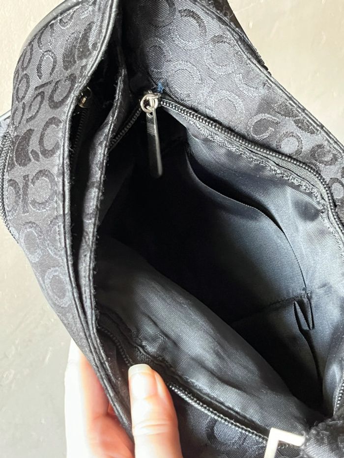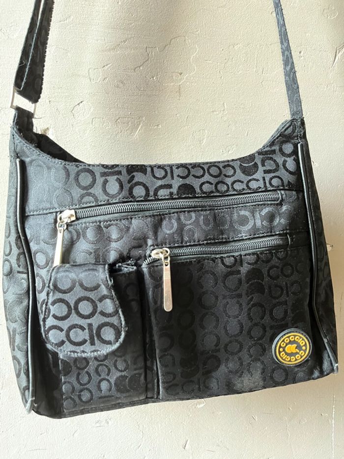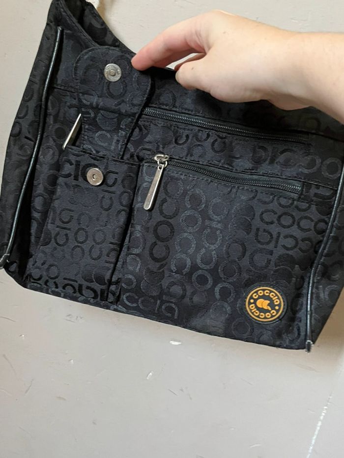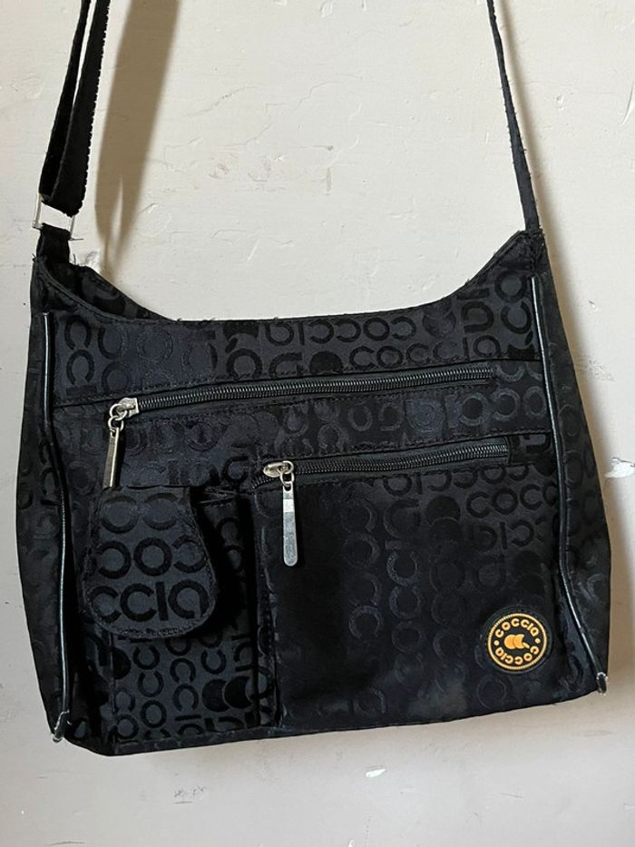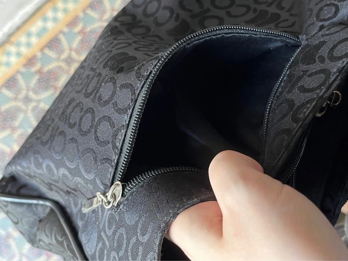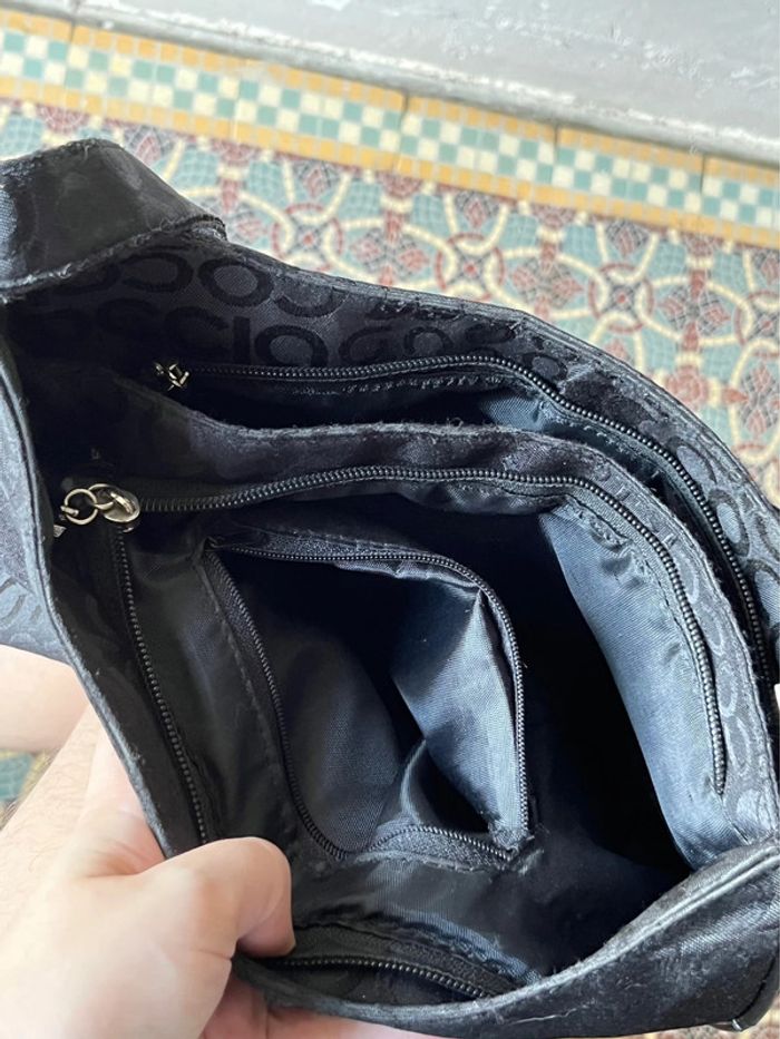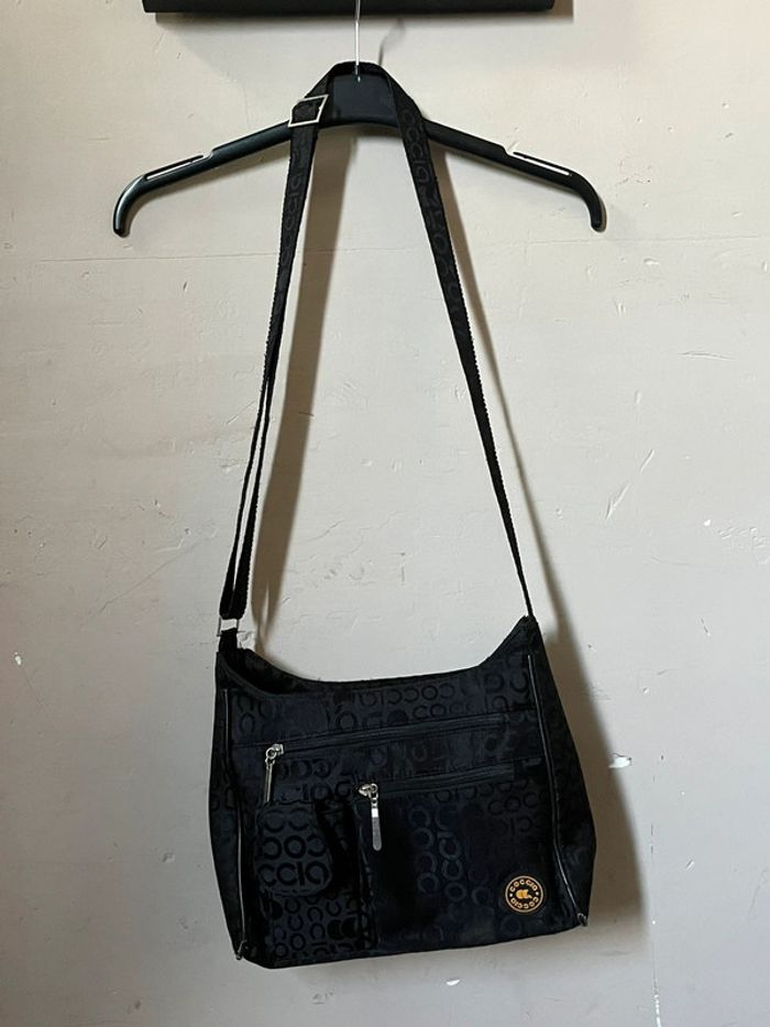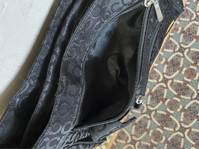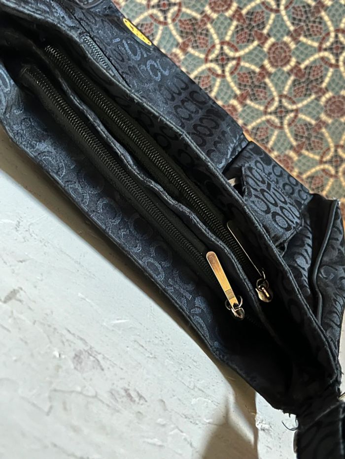 Sac à bandoulière avec anse réglable - sangle en metal. Couleur noir avec motifs lettres de la marque en satiné sur fond mate. Logo en jaune et touches métalliques. Plusieurs poches de rangements : A l’avant deux pochettes à zip (fermeture éclair) et compartiment avec bouton aimanté (pour téléphone). Une pochette à l’arrière. 2 poches à zip, l’une contenant 2 pochettes et l’autre une pochette à zip. Dimensions : Hauteur (centre) 21 cm - Largeur à la base 28 cm - Épaisseur à la base 10 cm. Bon état général, porté plusieurs fois, toute usures / défauts voir photos : Bordures (4 côtés du bas) usés et tache à l’avant du sac près du logo de la marque. (+ un zip intérieur rafistolé avec du fils bleu, pas vraiment visible, ni gênant).