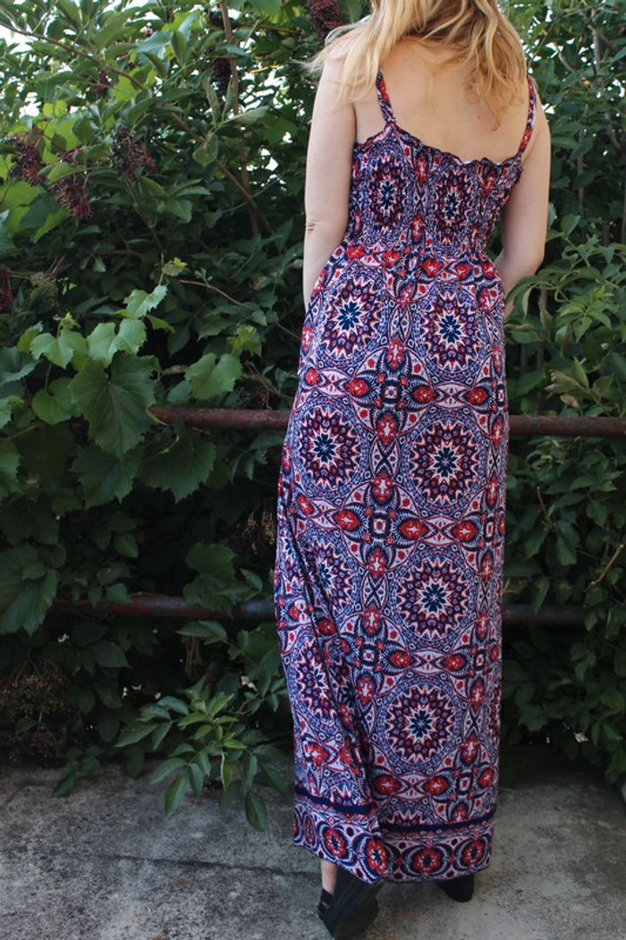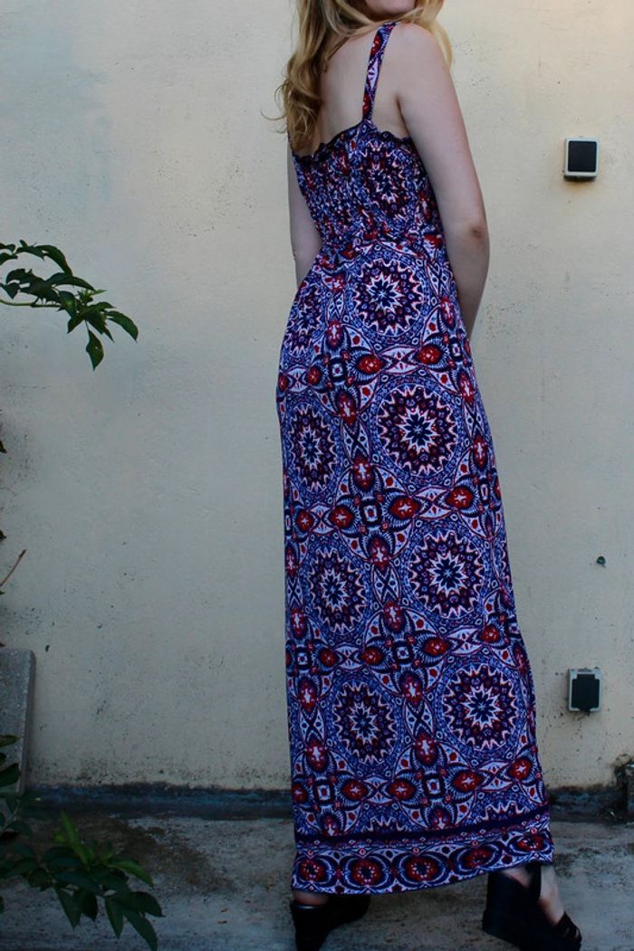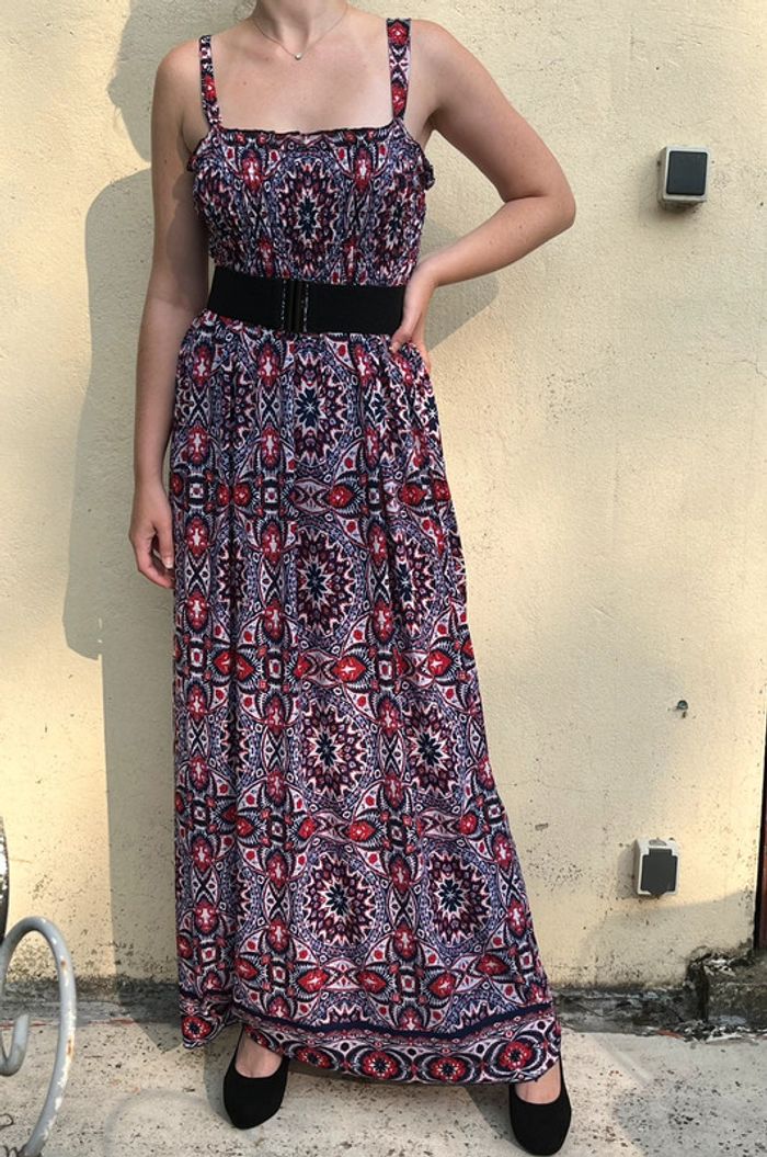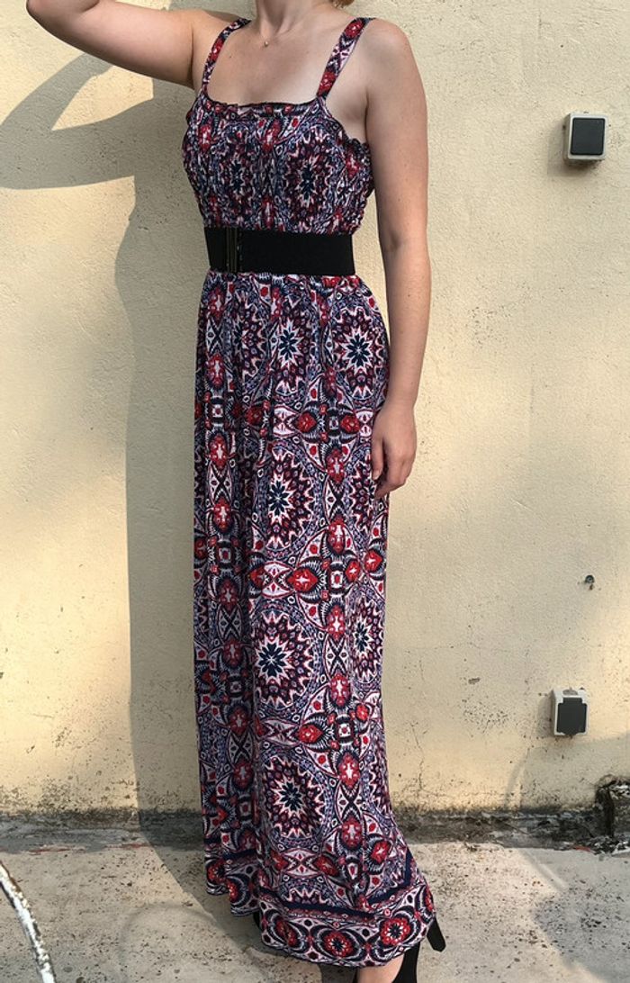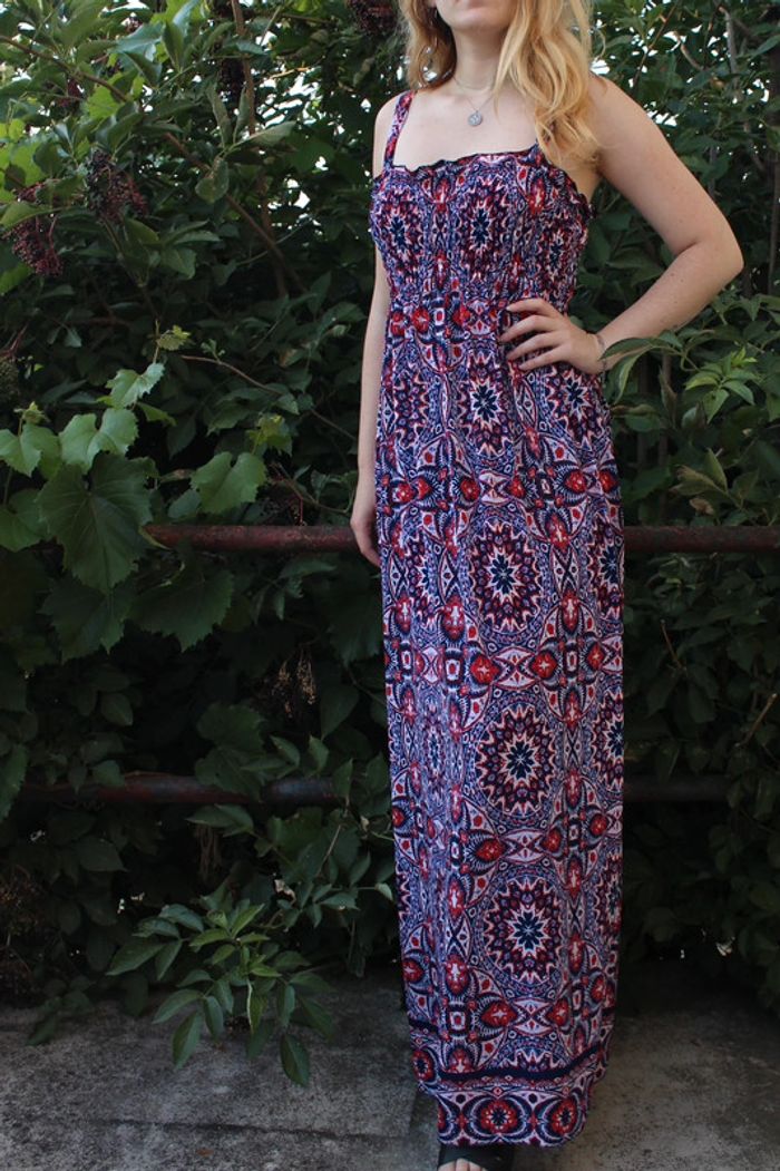Robe longue légère et confortable avec bretelles - partie haute élastique et le reste fluide. Motifs géométriques mandalas répétitifs couleur rouge et bleu touches de mauve lila sur fond blanc. /!\ Ceinture non comprise /!\ Taille unique (je mesure 1,69 m assez longue pour moi, porté avec des talons, je porte du S/M). Pas de marque - matière : 97% polyester et 3% elastan Très bon état - pas de signe d’usure, porté quelques fois.