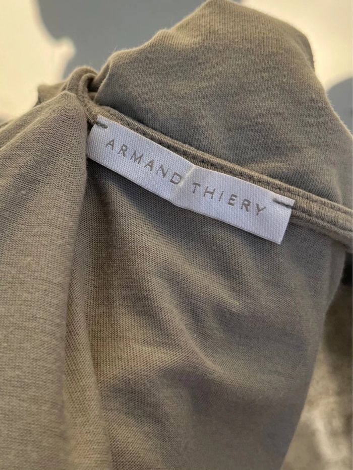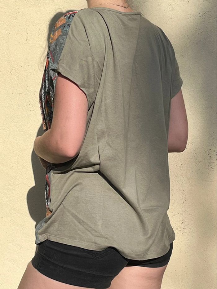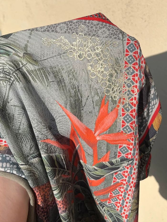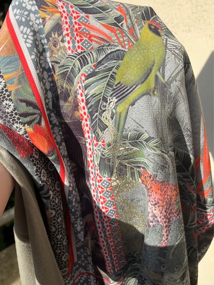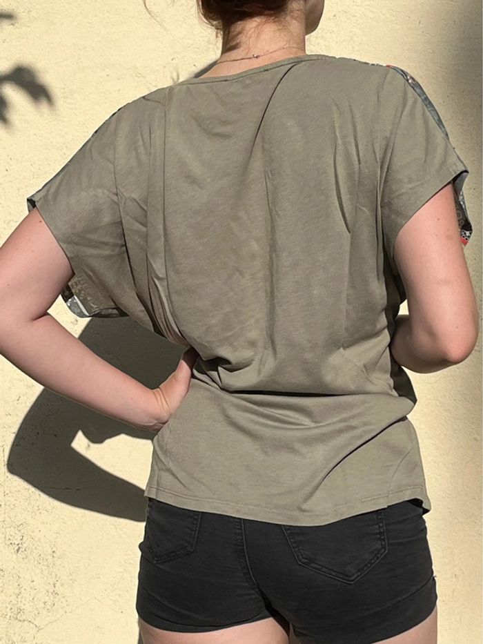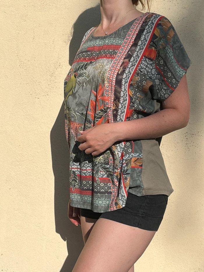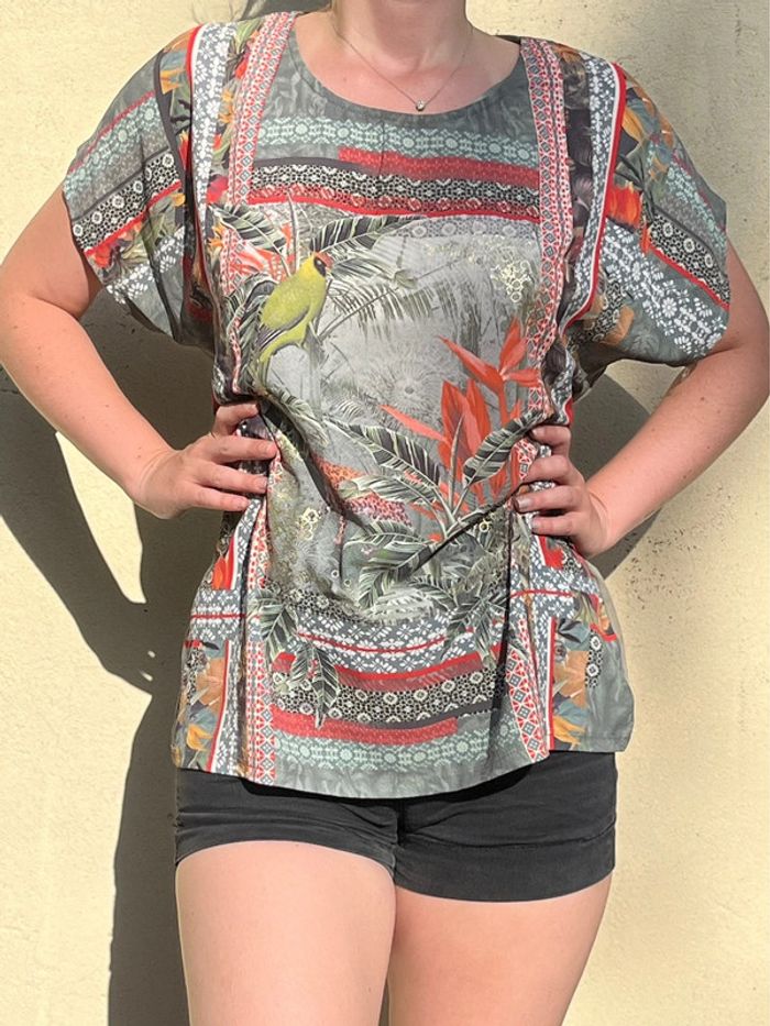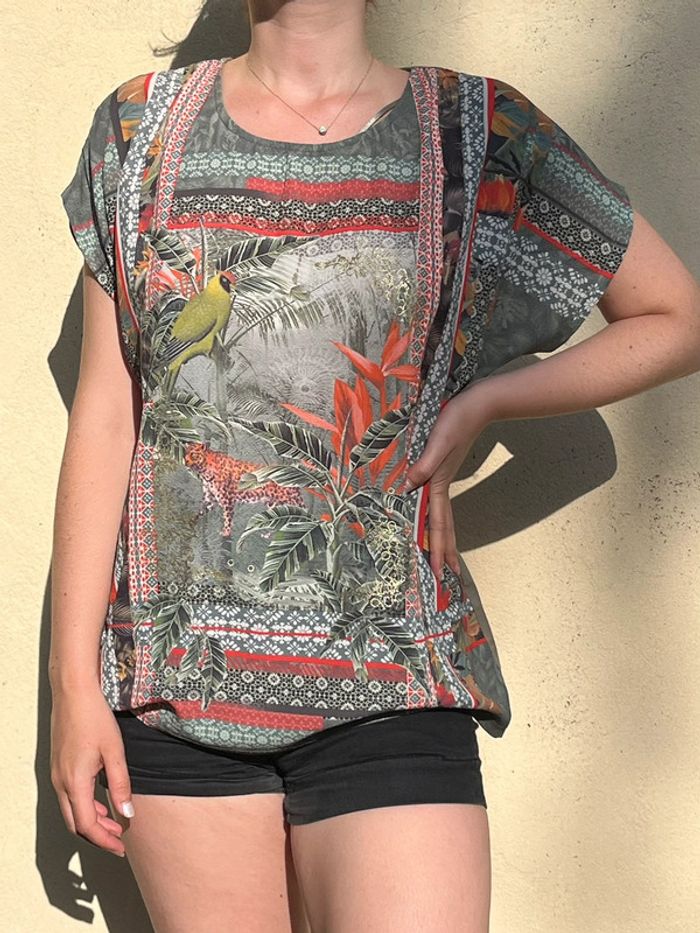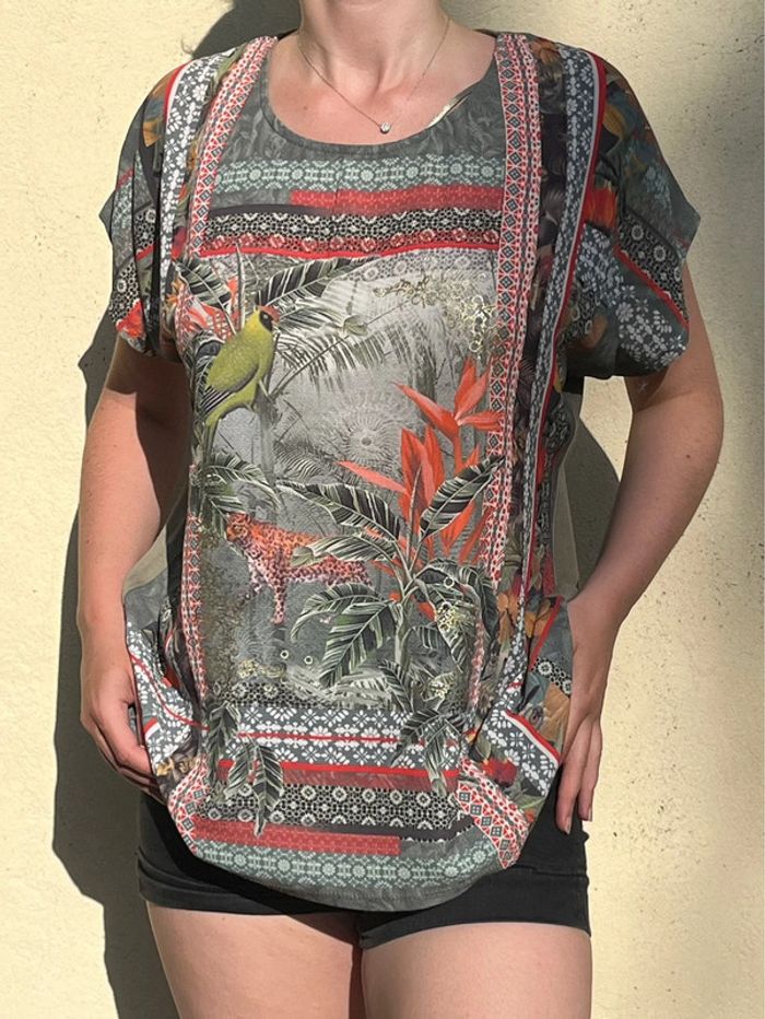 Haut T-shirt décolleté col rond, couleur kaki à l’arrière et à l’avant motifs fleurs et animaux : perroquet et léopard - couleur rouge orangé, vert, nuances de kakis, beige, orange et blanc et touches de brillances doré. Taille 4, correspond à 42/44 - je porte du S/M, grand pour moi. Marque : Armand Thiery Parfait état, aucun signe d’usure - il y a encore les accroches pour le cintre.