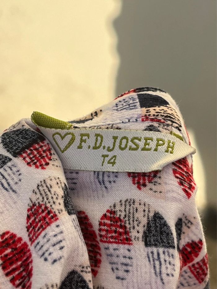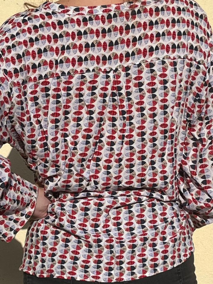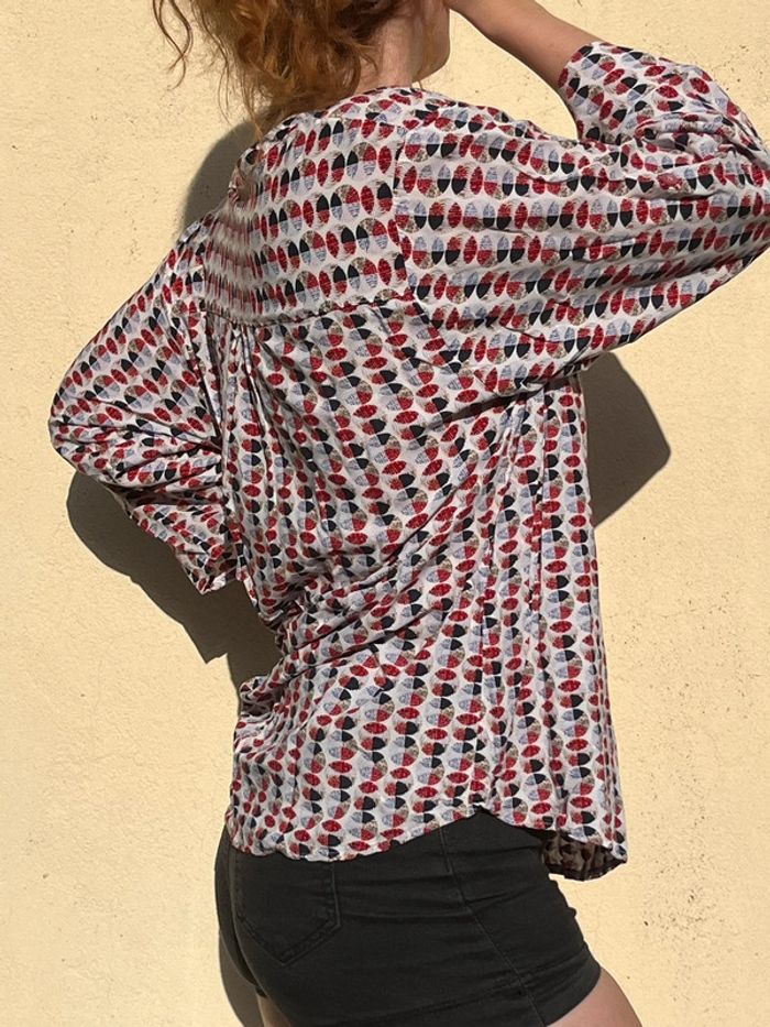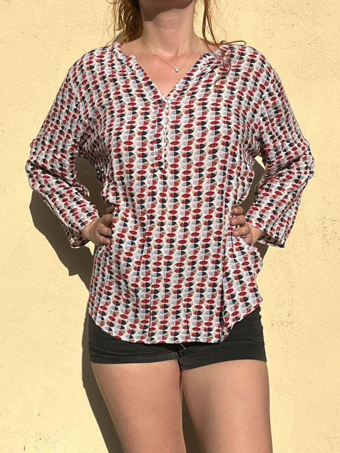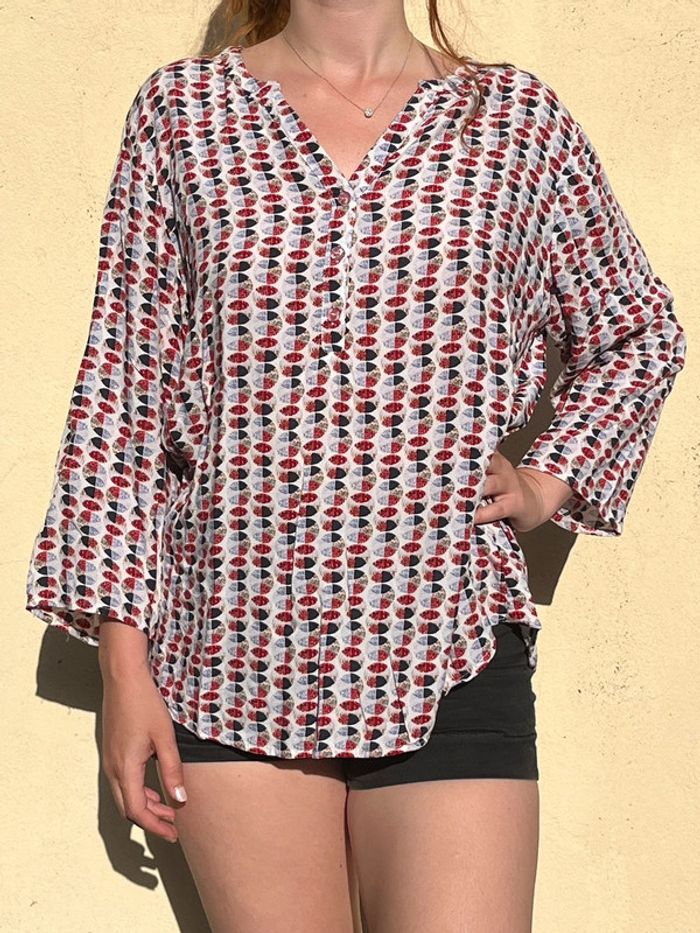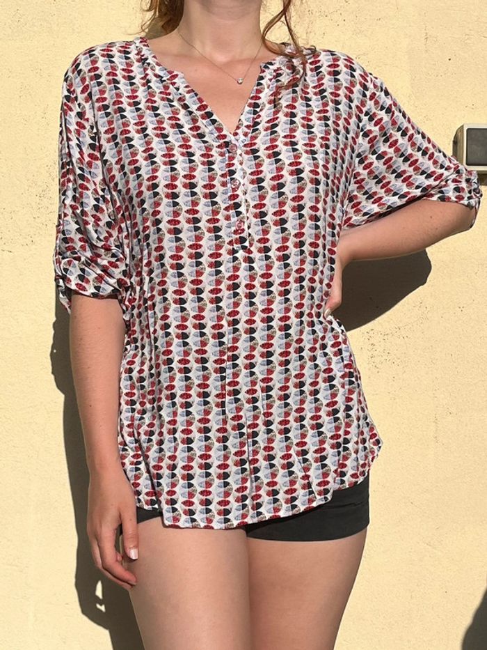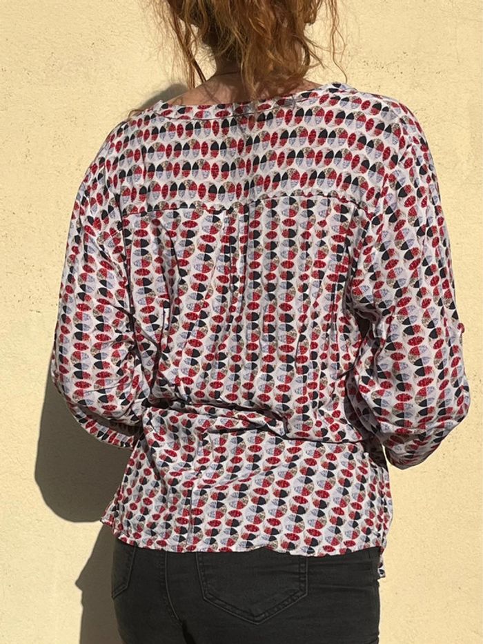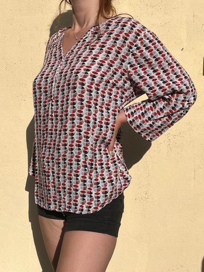Haut blouse / chemise légère et confortable, décolleté en V avec 3 boutons rose transparent qui s’ouvrent - manches 3/4 qui peuvent être remontées / retroussées au dessus du coudes à l’aide de bouton et bande. Motifs petits ronds avec petits ovales intérieur de différentes couleurs : noir, rouge, bleu et marron beige sur fond blanc. Taille 4 équivalent XL - je porte du S/M, un peu grande pour moi. Marque : F.D. Joseph - 100% Viscose Très bon état, pas de signe d’usure. Porté peu de fois.