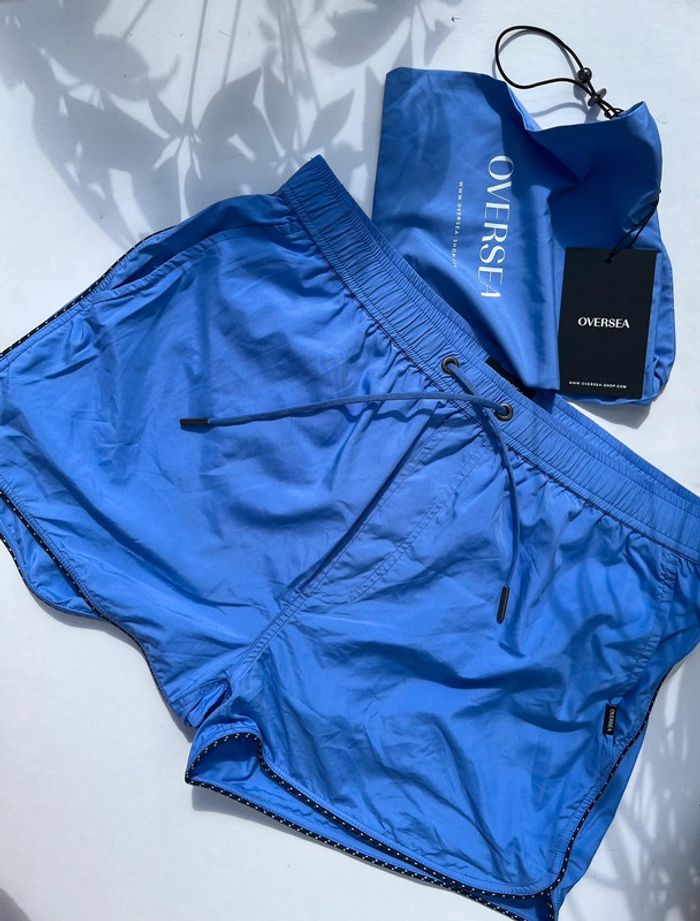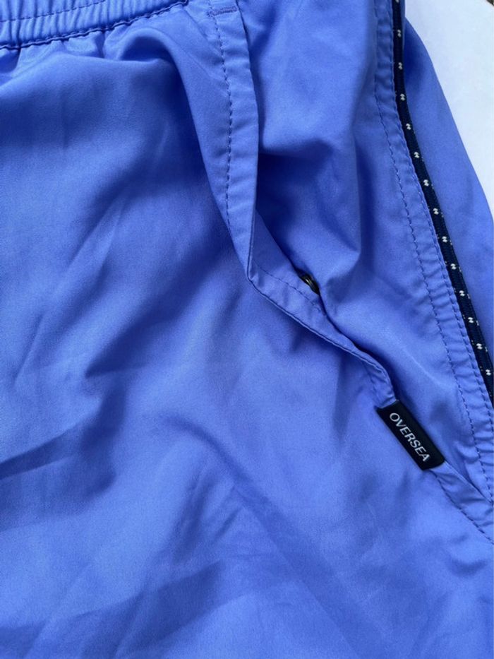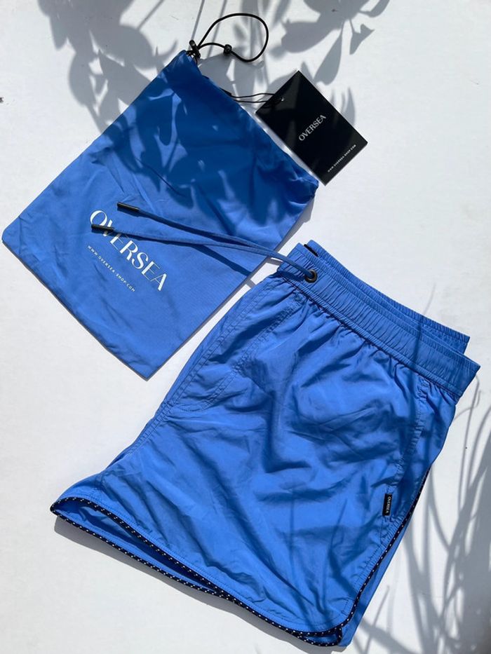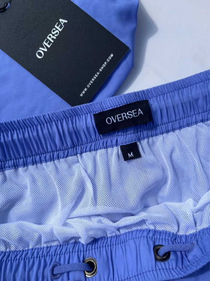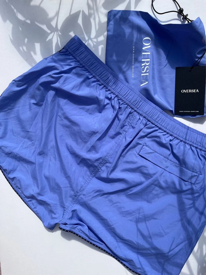 Maillot de bain homme avec fillet blanc intérieur - couleur bleu mauve (lila) avec contour fin noir et blanc. 2 poches avant sur les côtés et 1 à l’arrière (fermeture avec pression métallique) - élastique à la taille avec cordons extrémité métallique. Taille M Marque : Oversea Fournie avec sa pochette qui se serre à l’aide d’un cordon et boucle. Matière très douce, très bonne qualité. Neuf, jamais porté (Acheté il y a plus d’un an, est resté rangé).