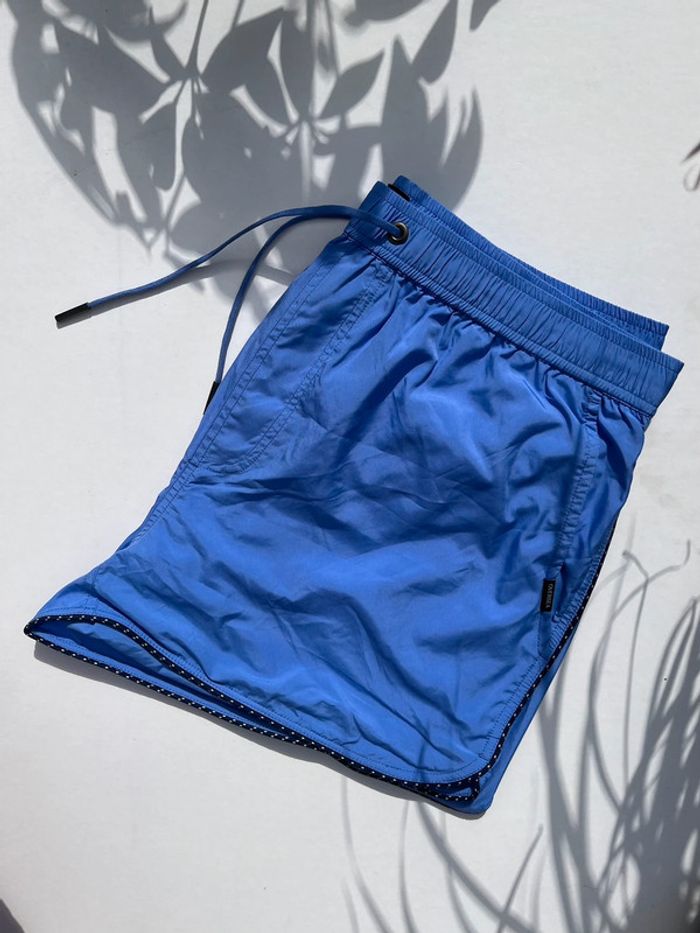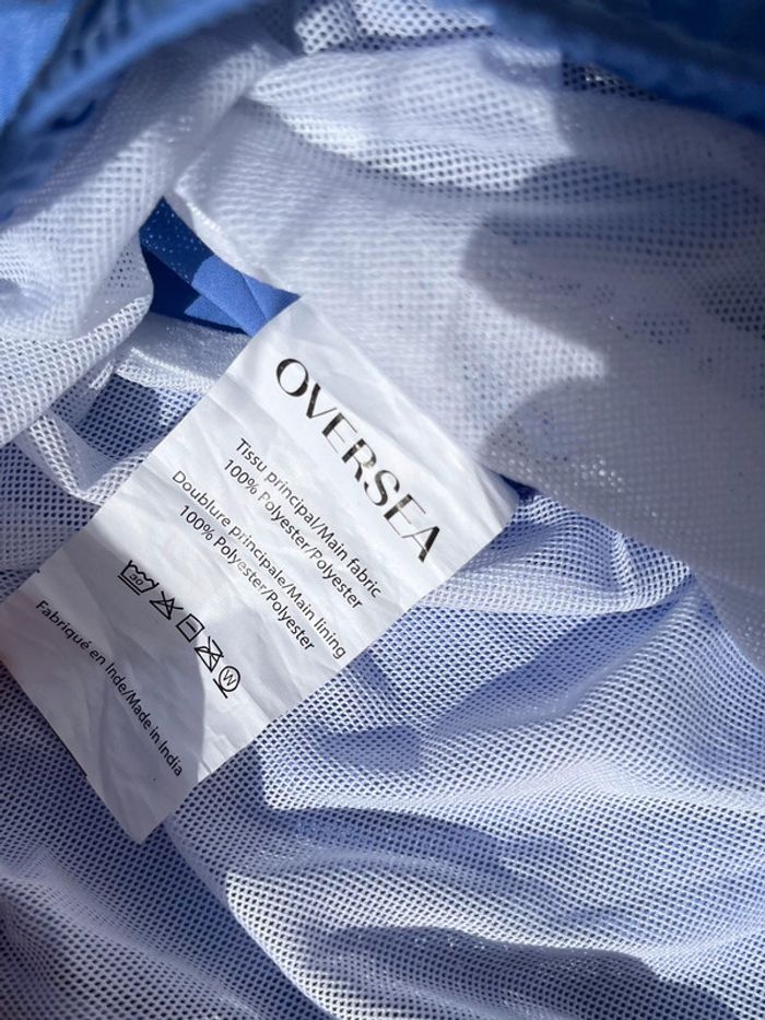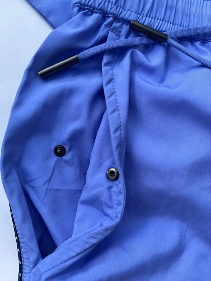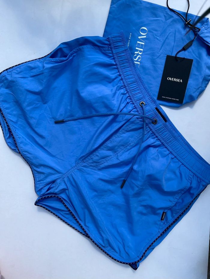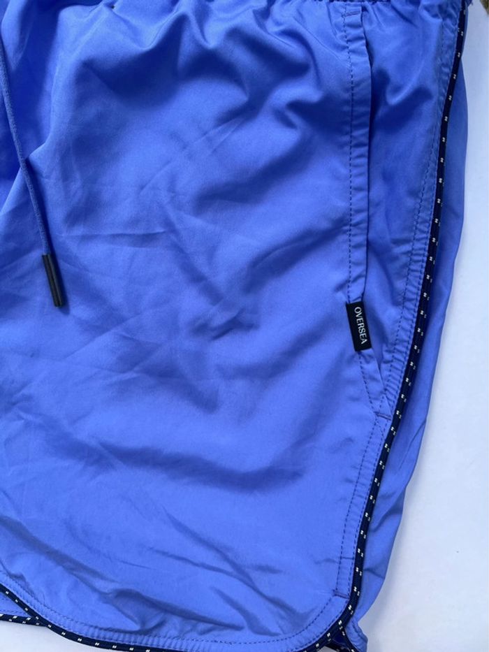 Maillot de bain homme avec fillet blanc intérieur - couleur bleu mauve (lila) avec contour fin noir et blanc. 2 poches avant sur les côtés et 1 à l’arrière (fermeture avec pression métallique) - élastique à la taille avec cordons extrémité métallique. Taille M Marque : Oversea Fournie avec sa pochette qui se serre à l’aide d’un cordon et boucle. Matière très douce, très bonne qualité. Neuf, jamais porté (Acheté il y a plus d’un an, est resté rangé).