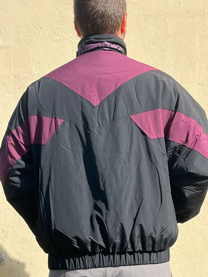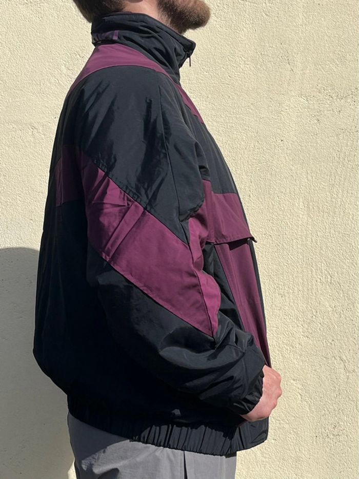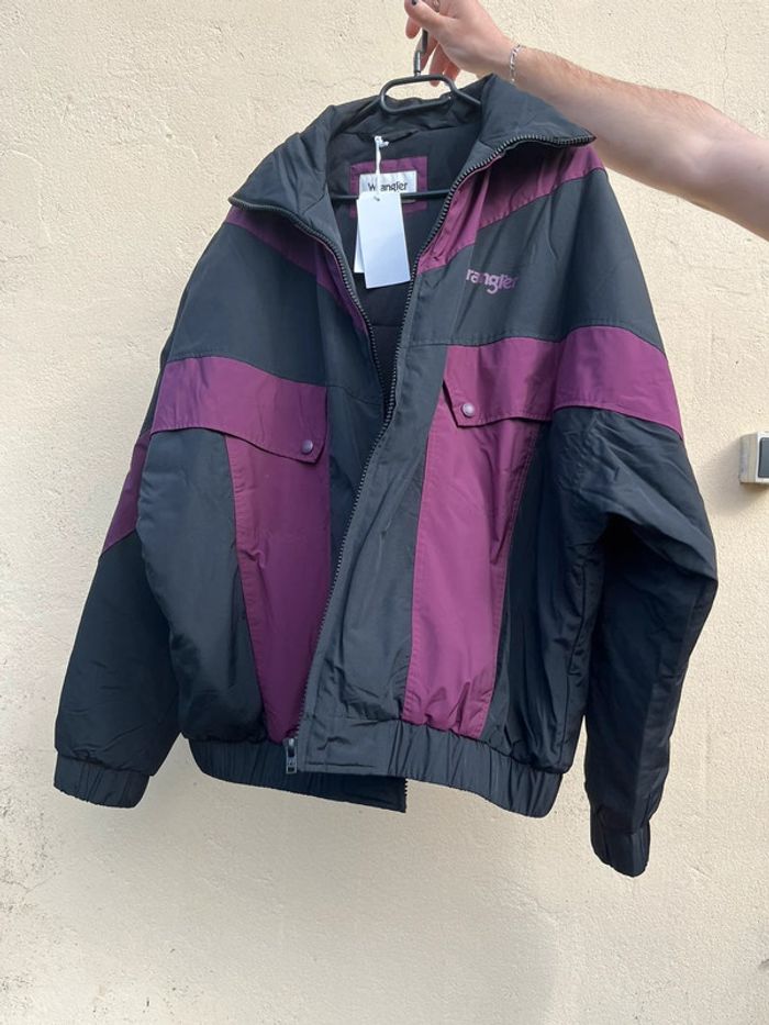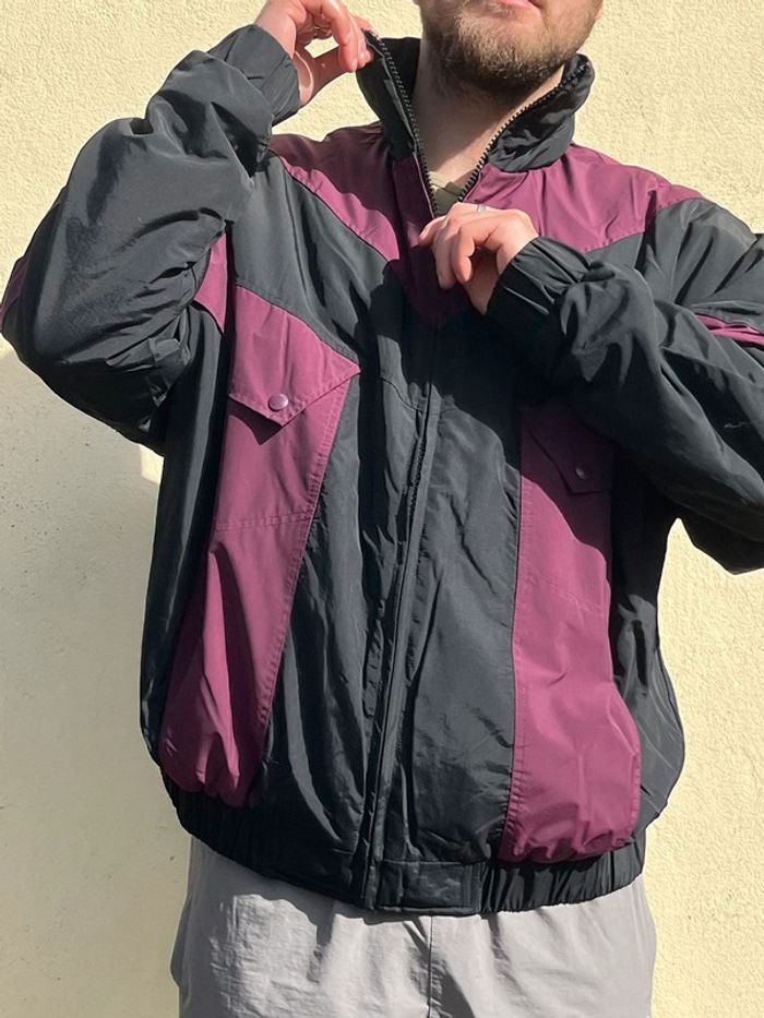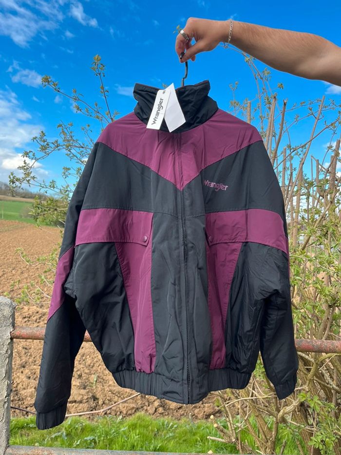 Bomber ou blouson oversize (effet large) style Vintage - imperméable confortable - bicolore : noir et prune (bordeaux violacé). Fermeture principale à zip (fermeture éclair) - élastiques au niveau des poignets et en bas de la veste pour effet remontant. 2 poches sur les côtés 2 poches au niveau de la poitrine avec fermeture boutons pressions 1 poche intérieure côté gauche avec fermeture éclair (à zip) Taille XL - sur les photos la taille habituelle portée est un L, donc rend légèrement plus large. Marque : Wrangler Matière : Nylon - Polyester - Coton Neuf avec étiquette, zéro défaut. Prix d’origine : 127€