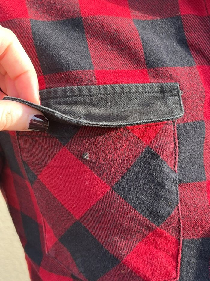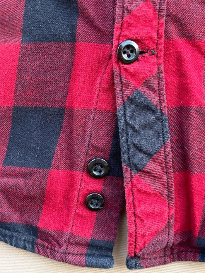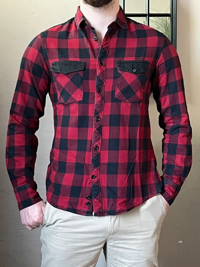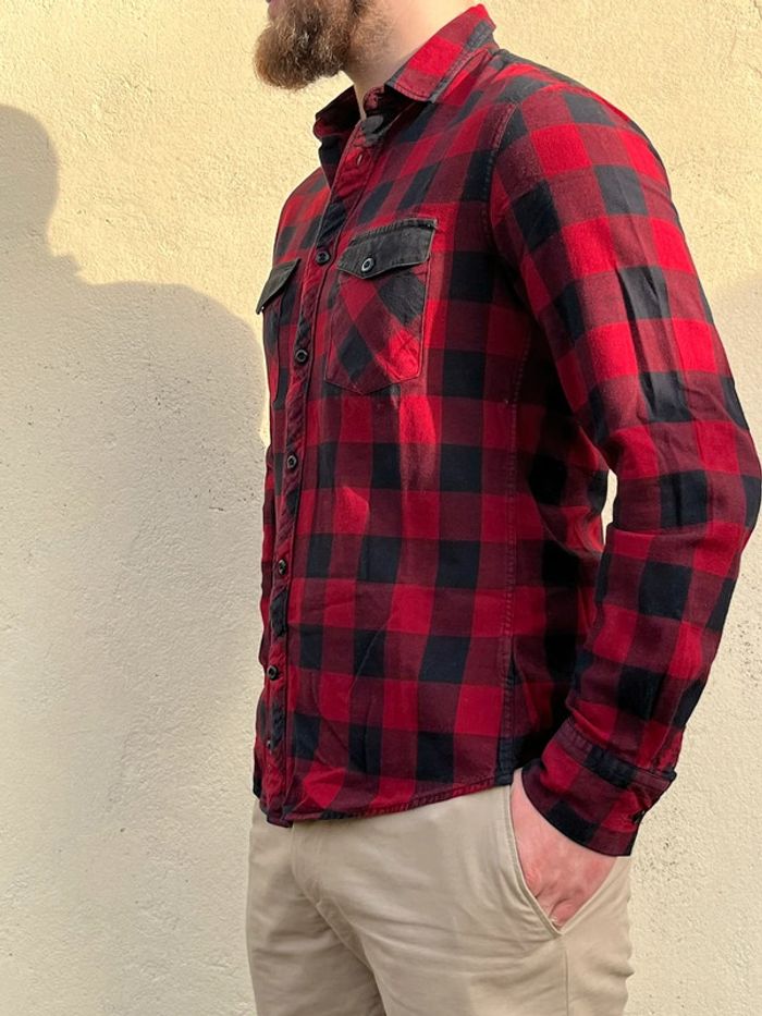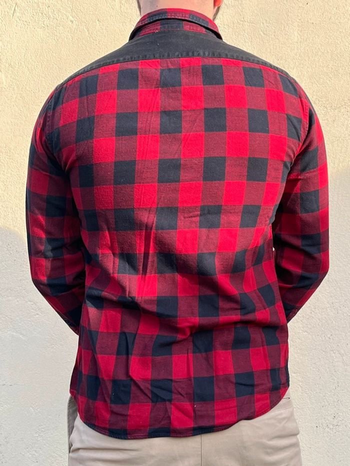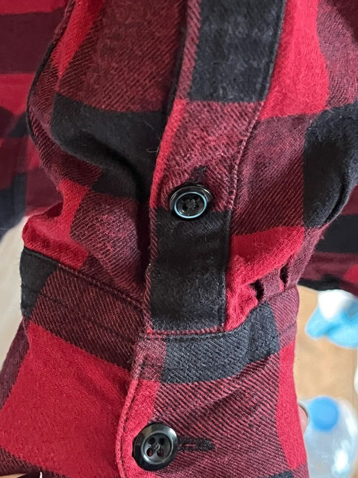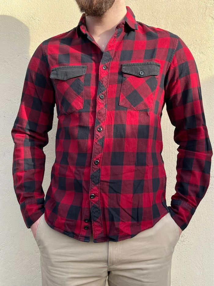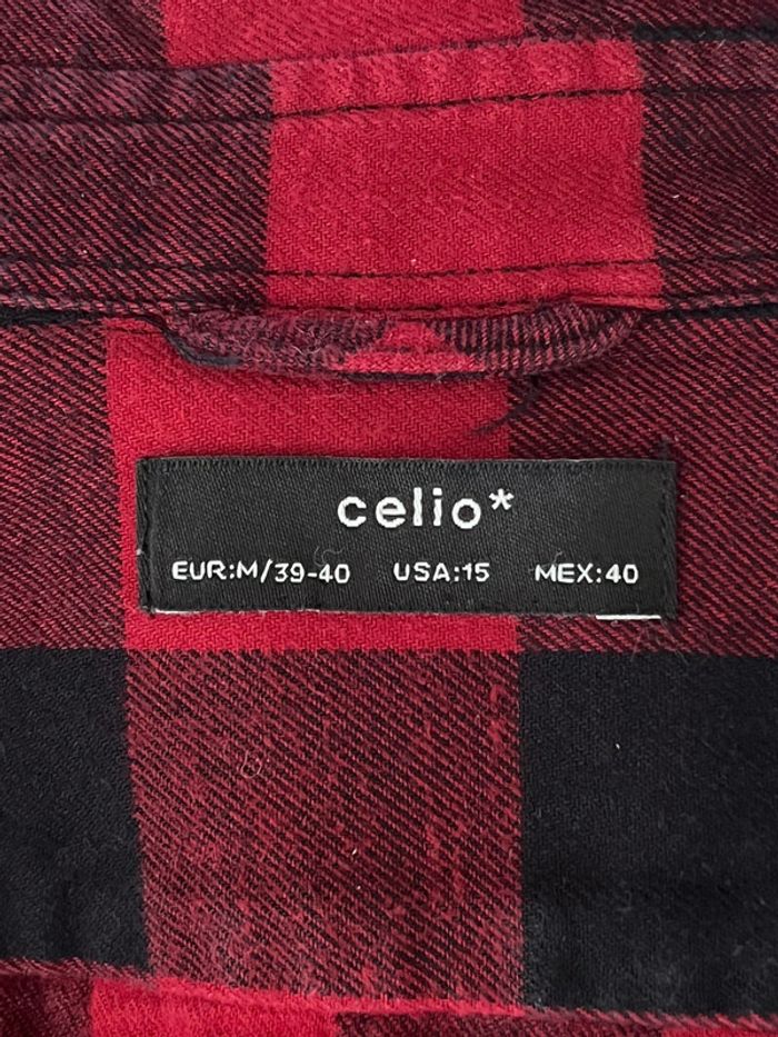 Chemise toutes saisons à carreaux - couleur rouge, noir et bordeaux 2 poches au niveau de la poitrine. Boutons noir et 2 boutons supplémentaires cousues (tout en bas) en cas de perte. Taille M (38/40) - sur les photos la taille habituelle portée est un L, légèrement plus serré (au niveau des aisselles). Marque : Celio Étiquette des matières coupée. Très bon état général - porté quelques fois (environ 10x). Un bouton manque celui de la poche droite, si besoin me demander avant achat pour le recoudre.