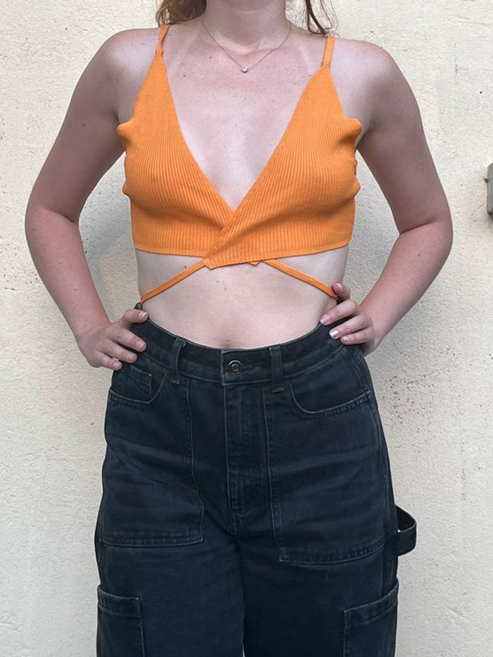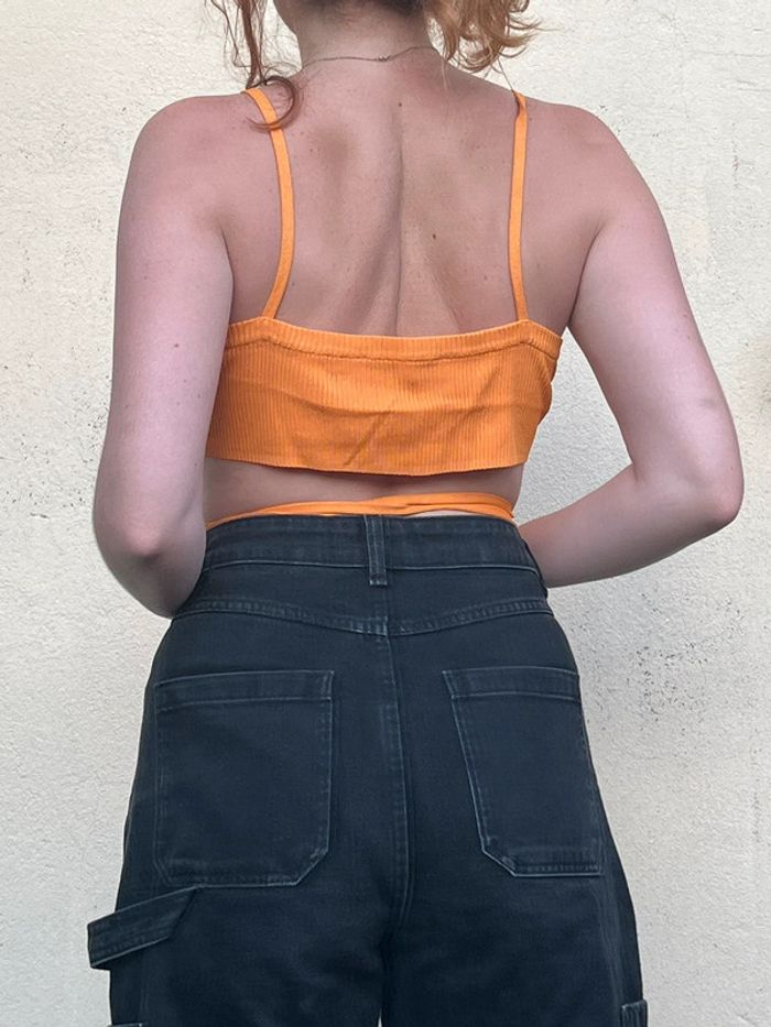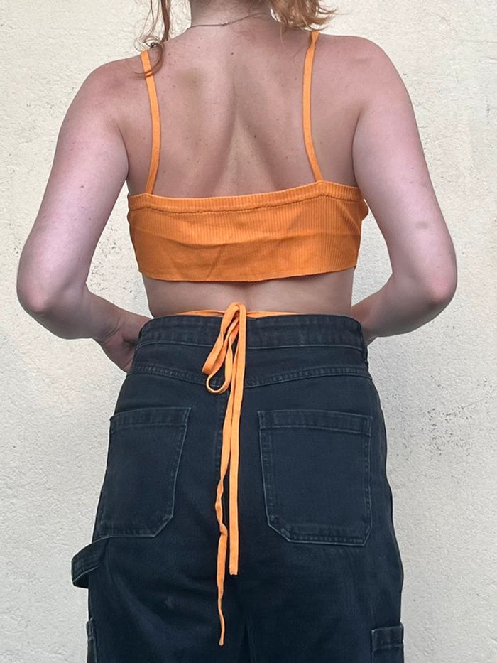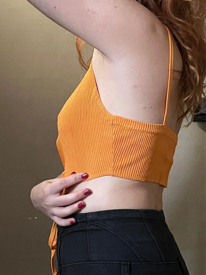 Crop top triangle à bretelles qui s’attache avec des lacets - peut s’attacher de différentes façons. Couleur orange avec rayures verticales en relief. Taille L - Marque : Zara Je porte du S/M, très grand pour moi, convient à une forte poitrine. Parfait état, aucun signe d’usure.