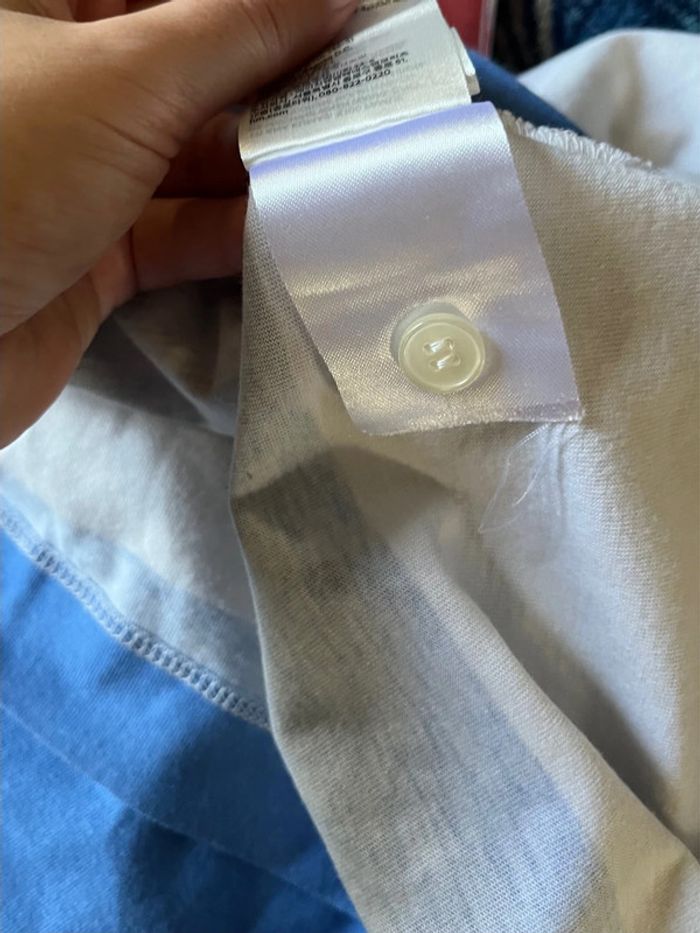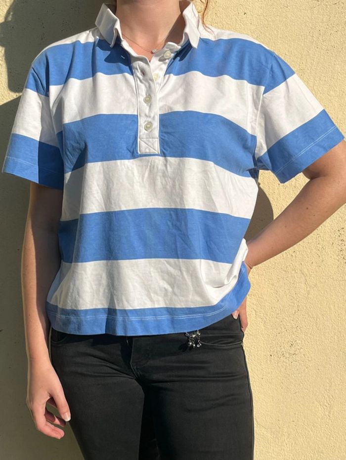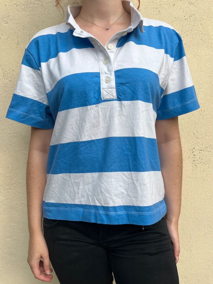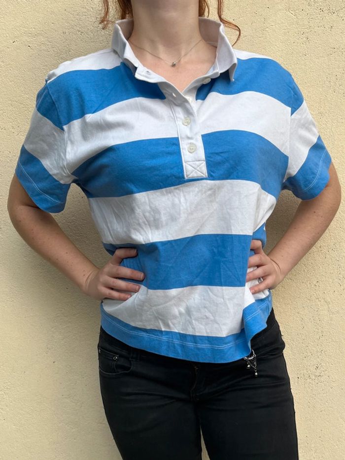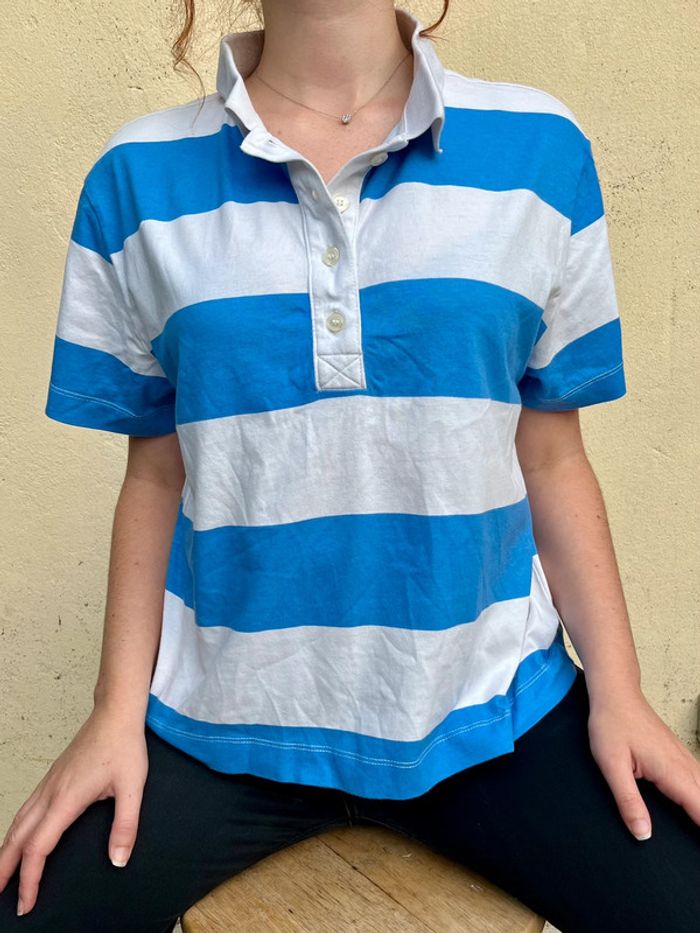T-shirt polo style marinière ; bandes horizontales couleur blanc et bleu clair - manches courtes, col et décolleté avec 4 boutons couleur blanc translucide. Ample et confortable. Taille M - je porte du S/M, taille très bien. Marque : H&M Matière : 100% coton Bouton supplémentaire en cas de perte cousu sur l’étiquette des matières. Très bon état, aucun signe d’usure. Porté 5-6x max.
