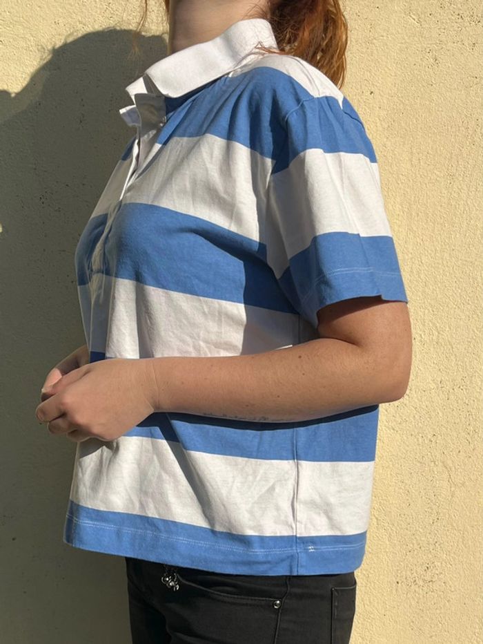 Haut polo avec boutons - bandes blanche et bleu clair - photo numéro 9