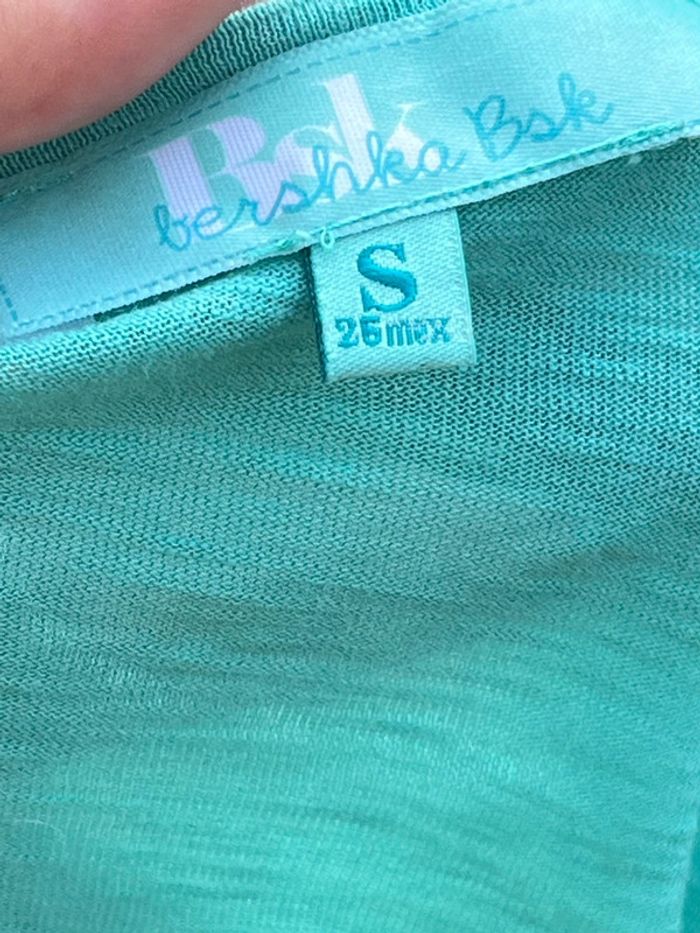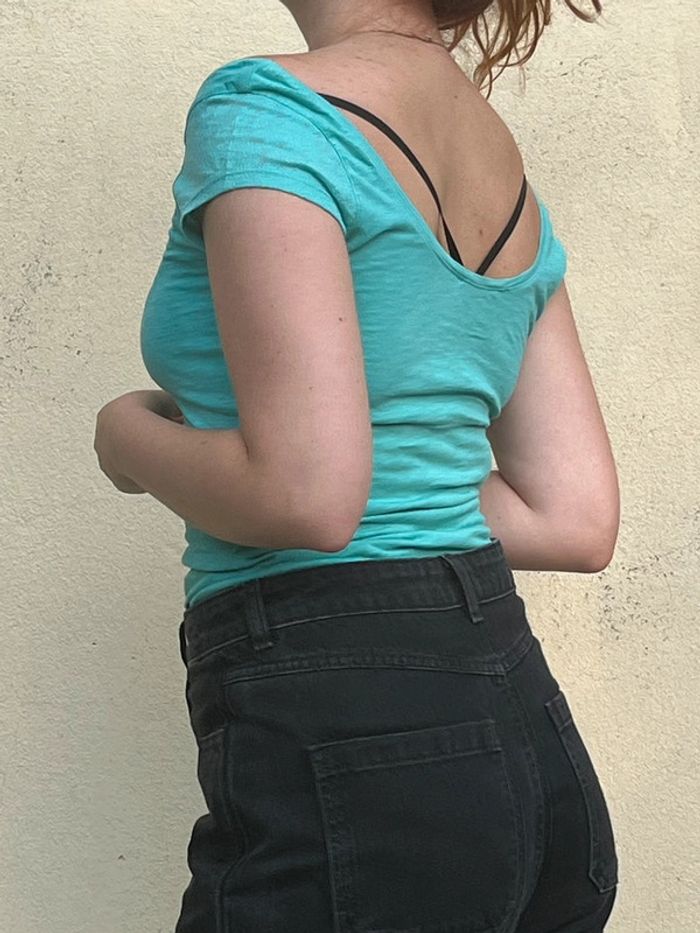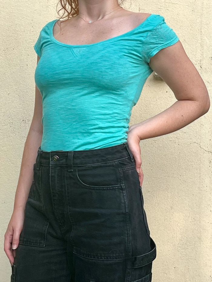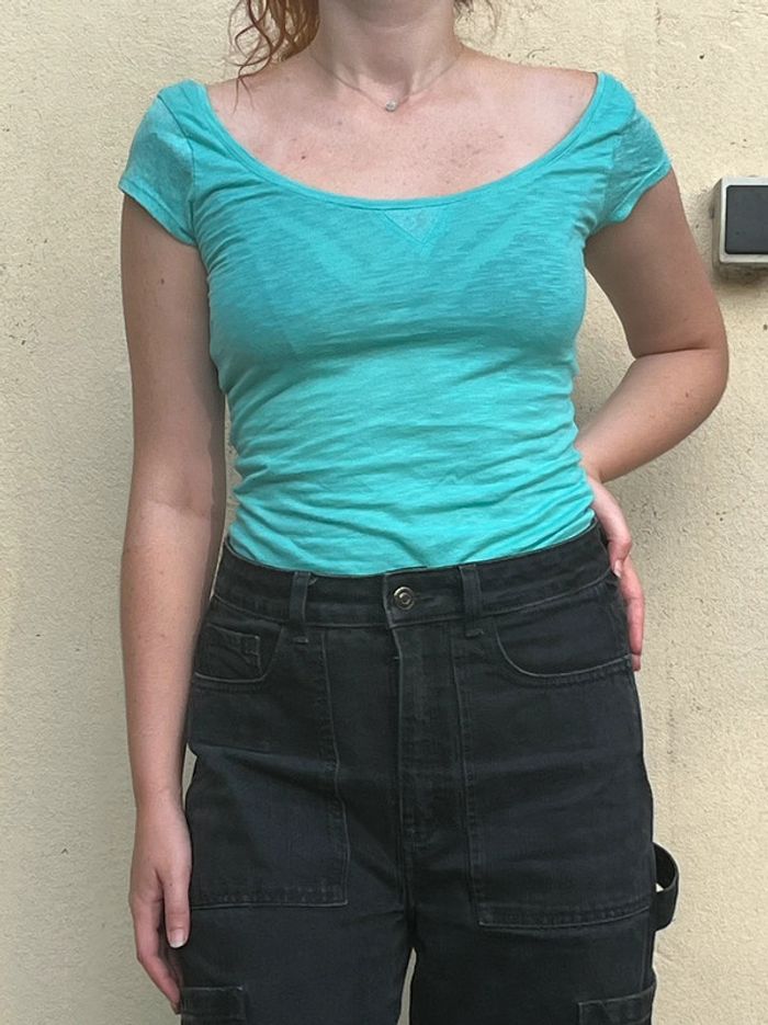 T-shirt petites manches courtes et épaules à moitié dénudé - col rond large avant arrière, dos mi nue. Manches en dentelles et triangle décolleté en dentelles - couleur bleu clair ciel / turquoise - légèrement transparent Taille S - je porte du S/M, me serre un tout petit peu - moulant Marque : Bershka BSK Étiquettes des matières coupées. Très bon état, porté peu de fois (3x max) Aucun signe d’usure.