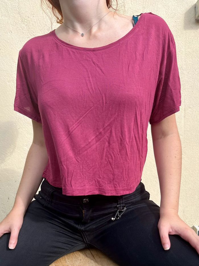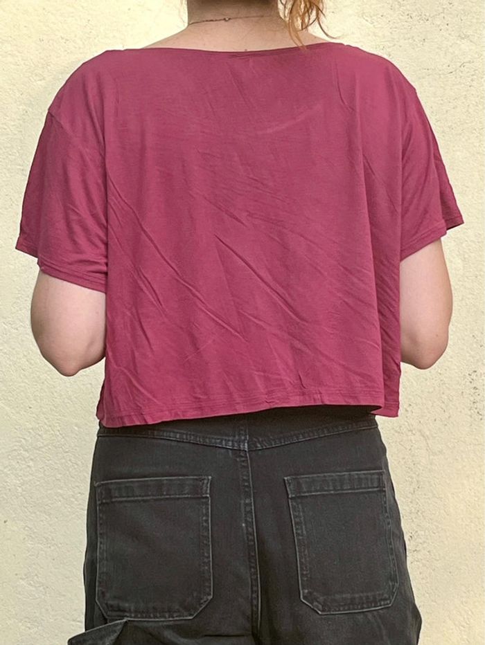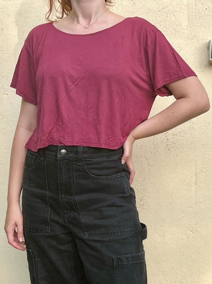 Haut court crop top ample et fluide manches courtes et col rond - couleur bordeaux violacé / prune. Taille S (je porte du S/M). Matière : 100% viscose Marque : Divided by H&M Très bon état, porté quelques fois (moins de 10x). Aucun signes d’usure.
